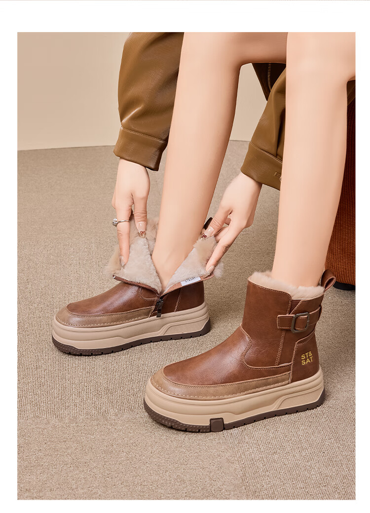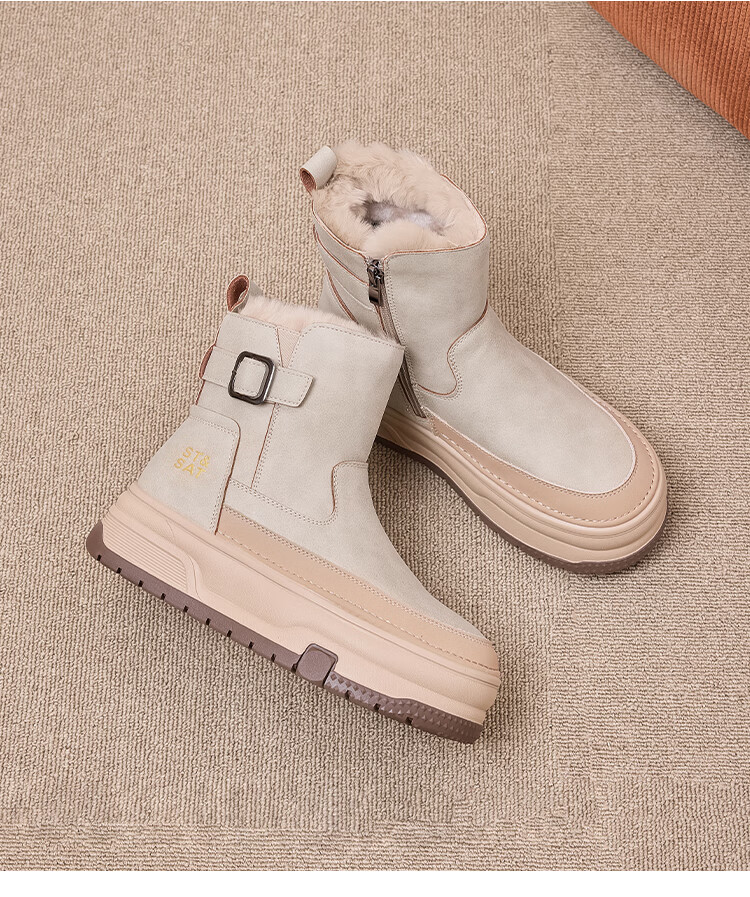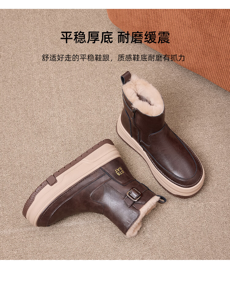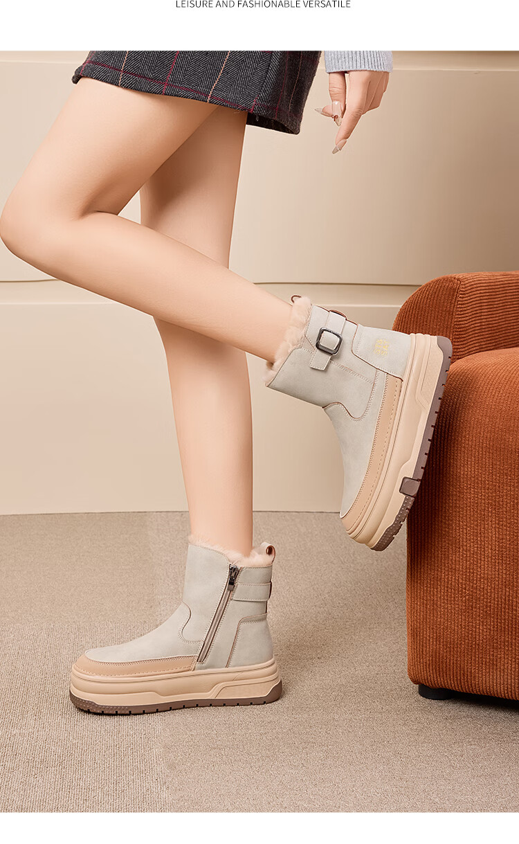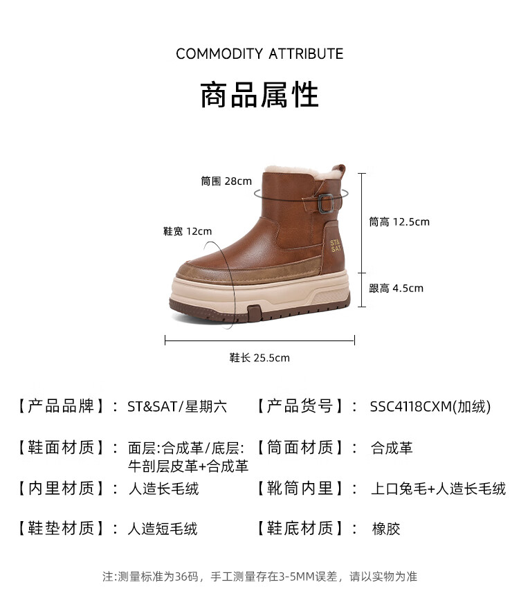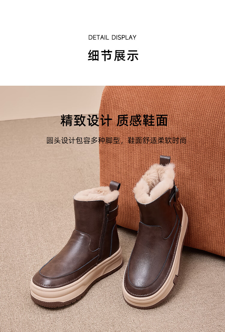 星期六厚底雪地靴女款2025新款秋冬保暖绒里小皮鞋增高户外保暖棉鞋短靴 米白 37