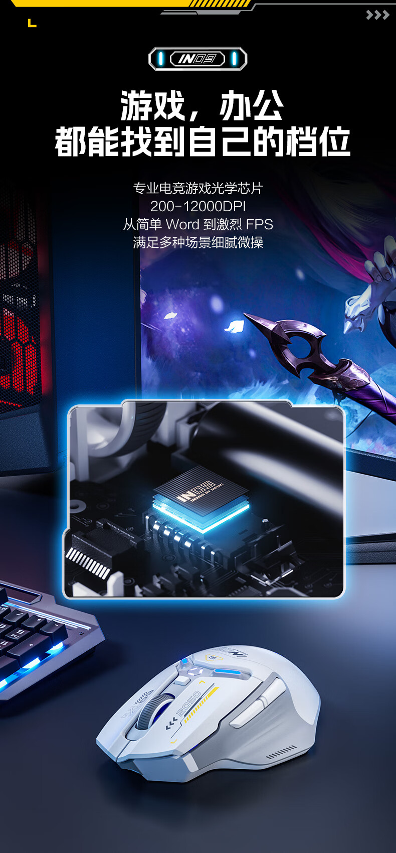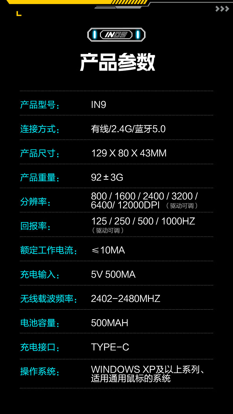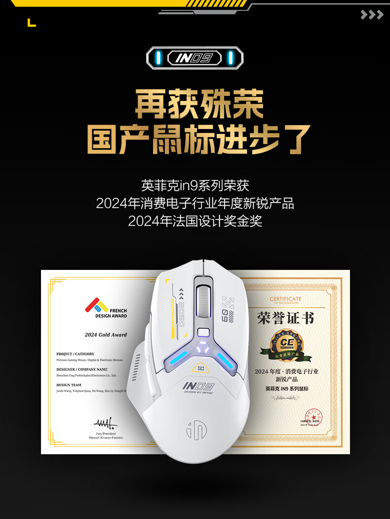 英菲克(INPHIC)IN9 无线游戏鼠标 有线蓝牙三模鼠标 右手型rgb灯效csgo吃鸡lol电竞宏台式笔记本通用 12000DPI 灰