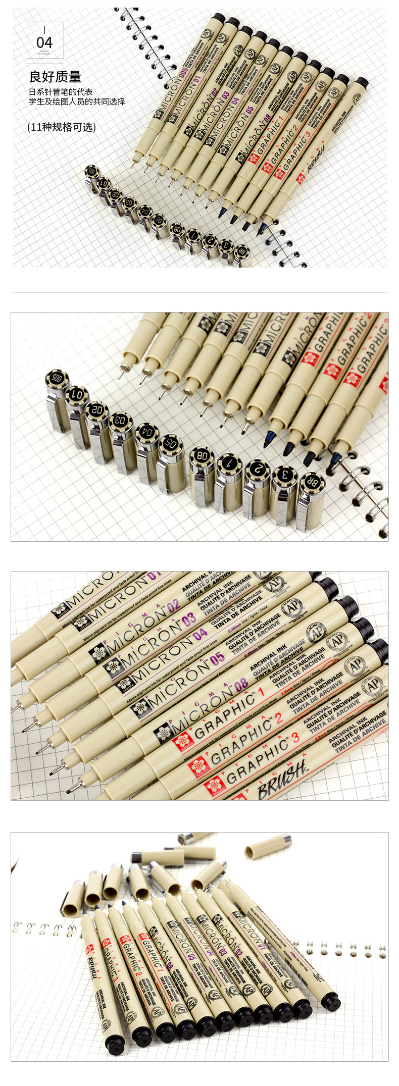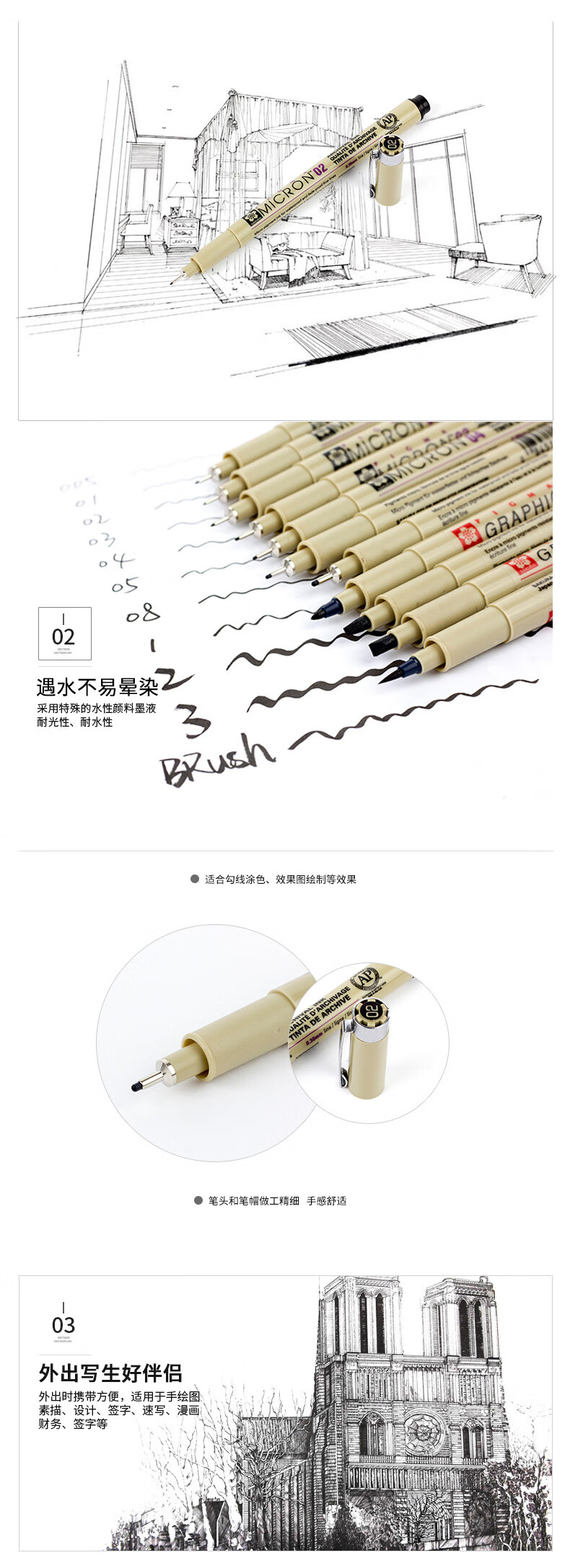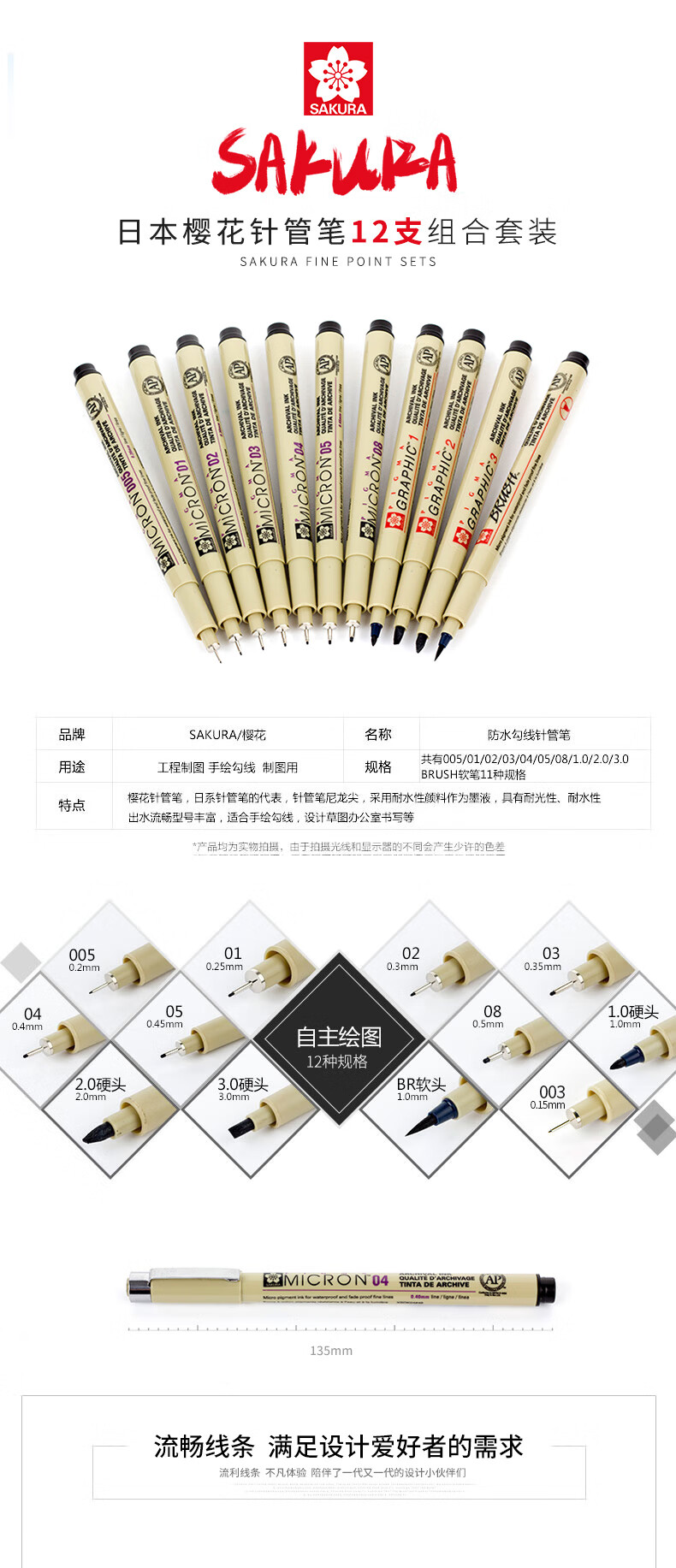 日本樱花(SAKURA) 黑色针管笔防水勾线笔绘图笔素描线条笔 设计图针管笔美术用笔 官方常用7支套装(XSDK7P)