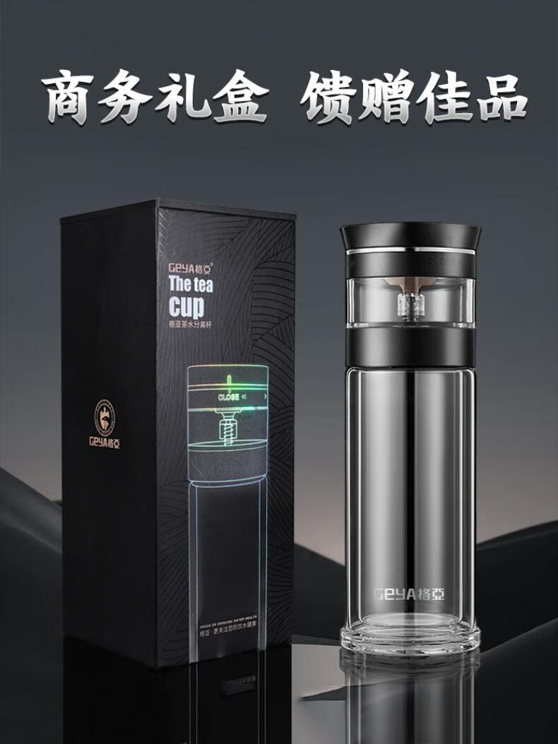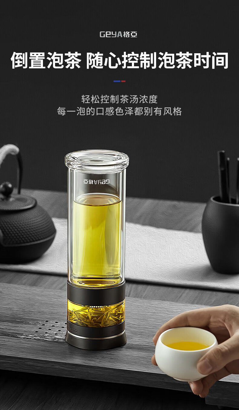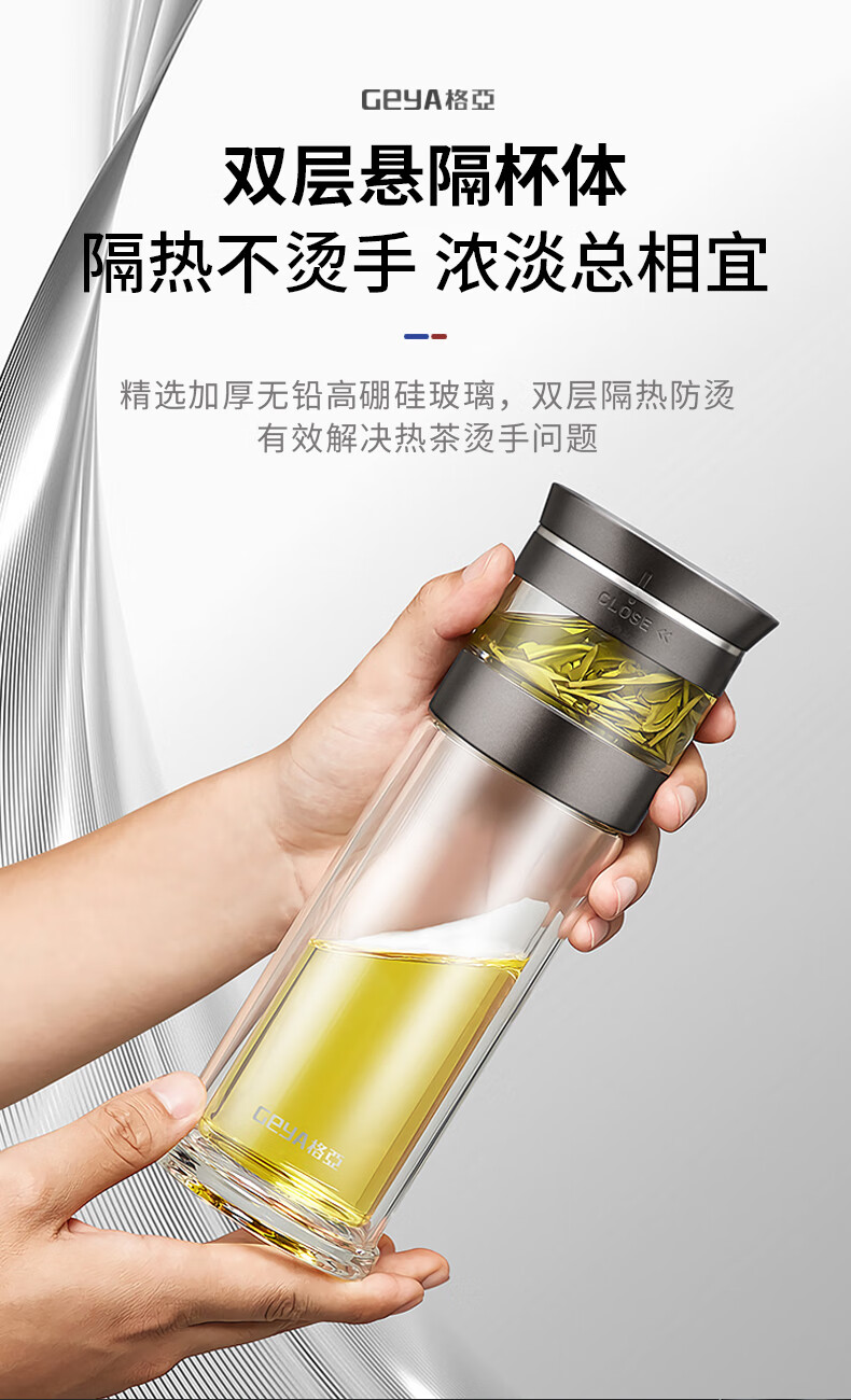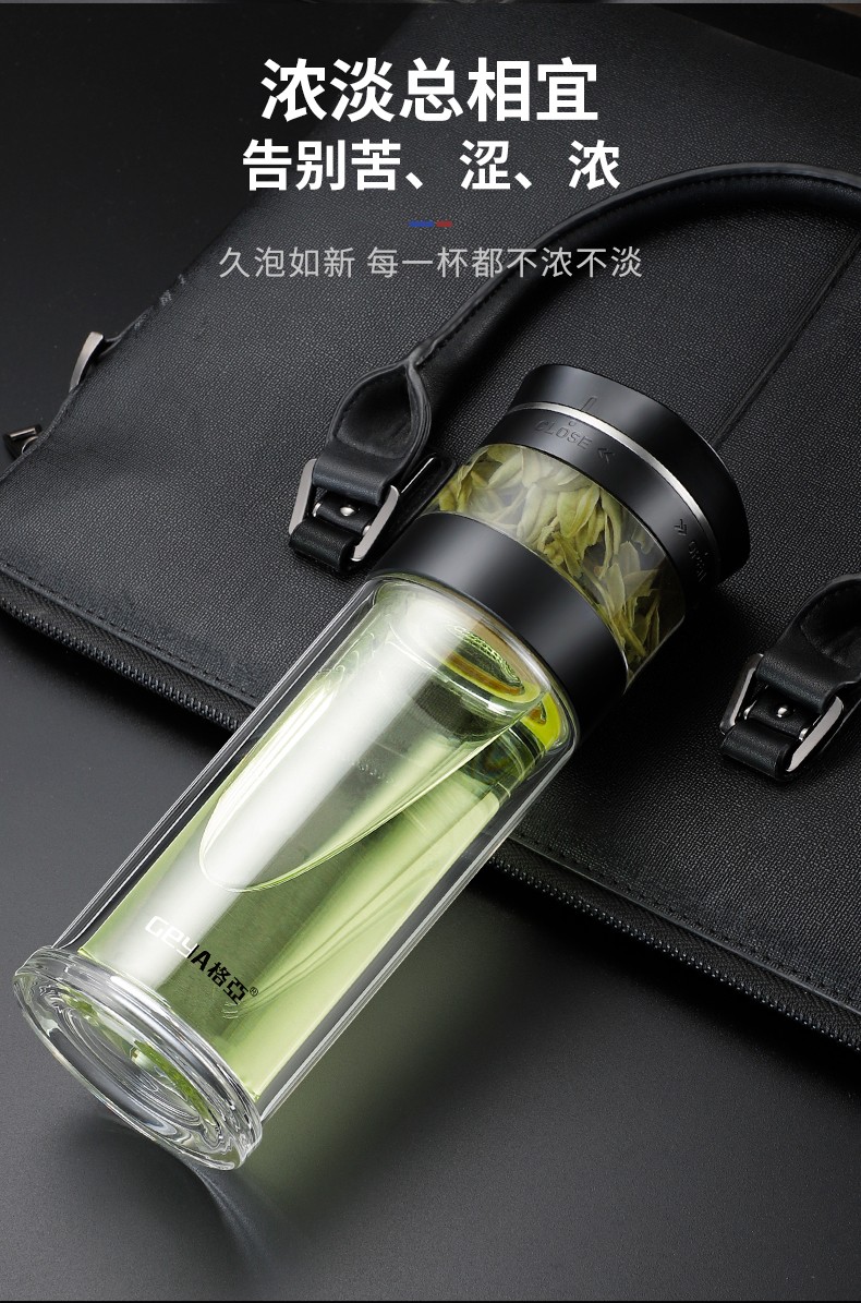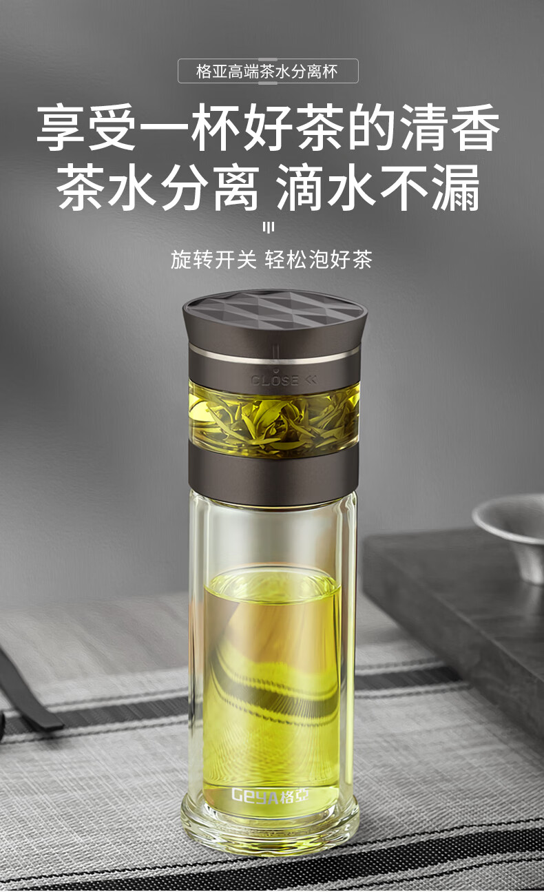 格亚(GEYA)茶水分离大容量玻璃杯双层茶杯男泡茶杯水杯便携杯子团购定制 咖啡色450ml