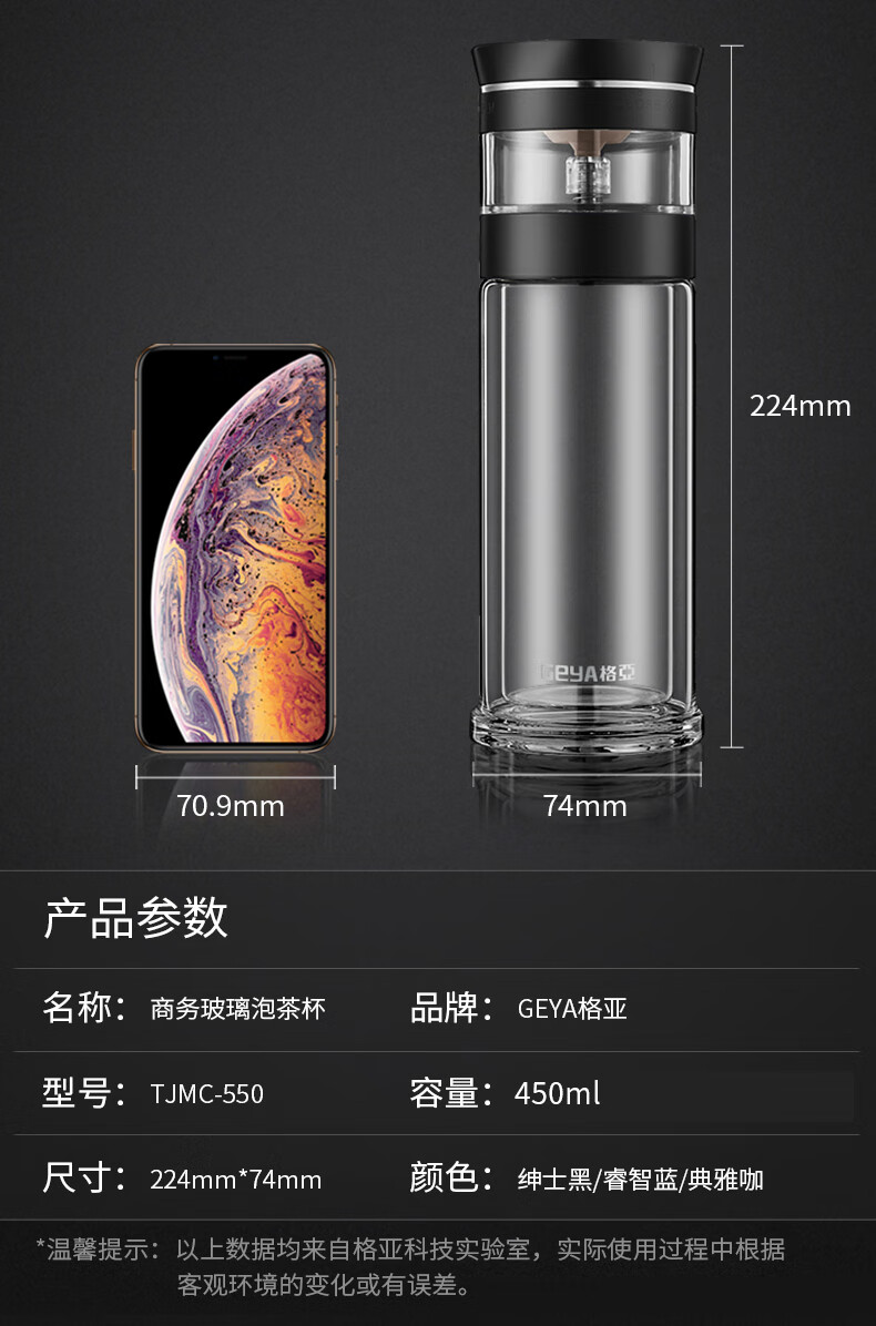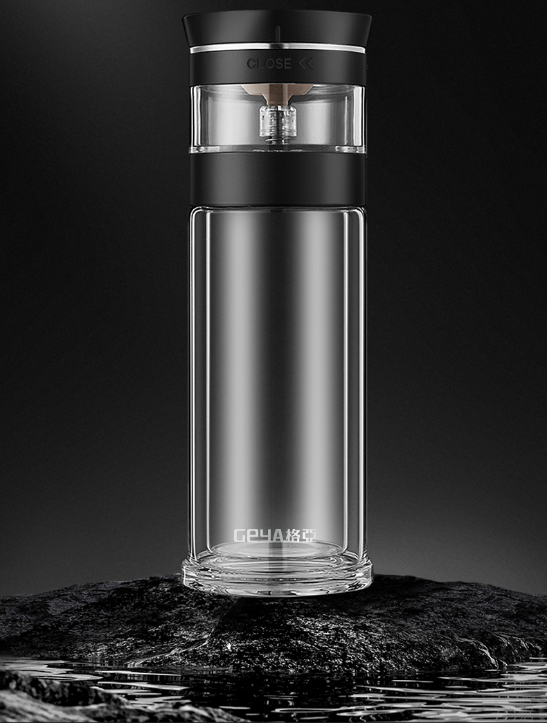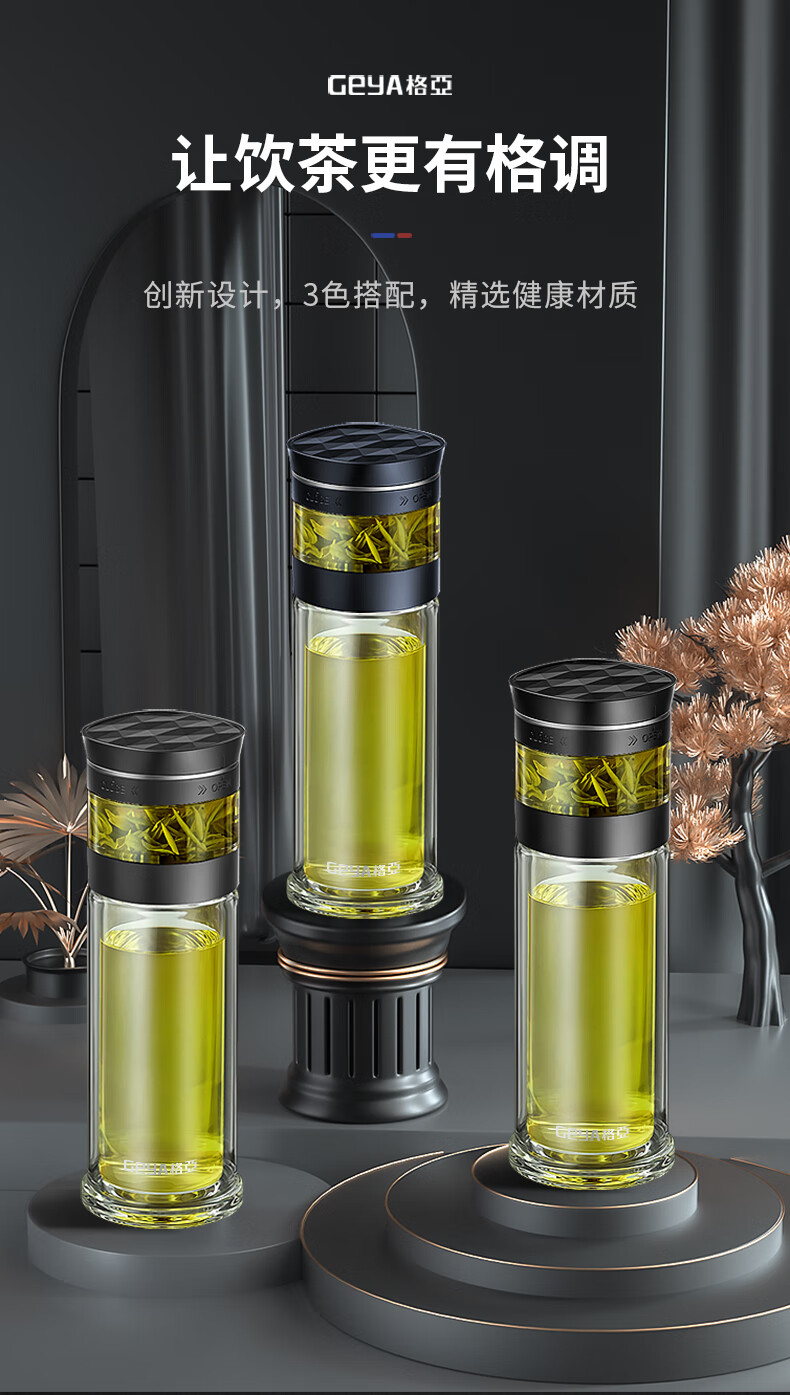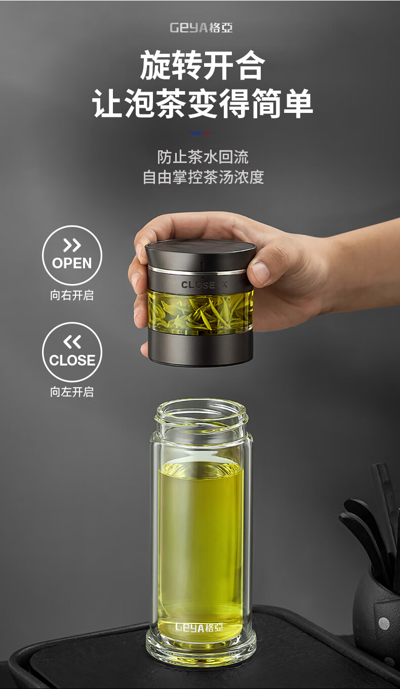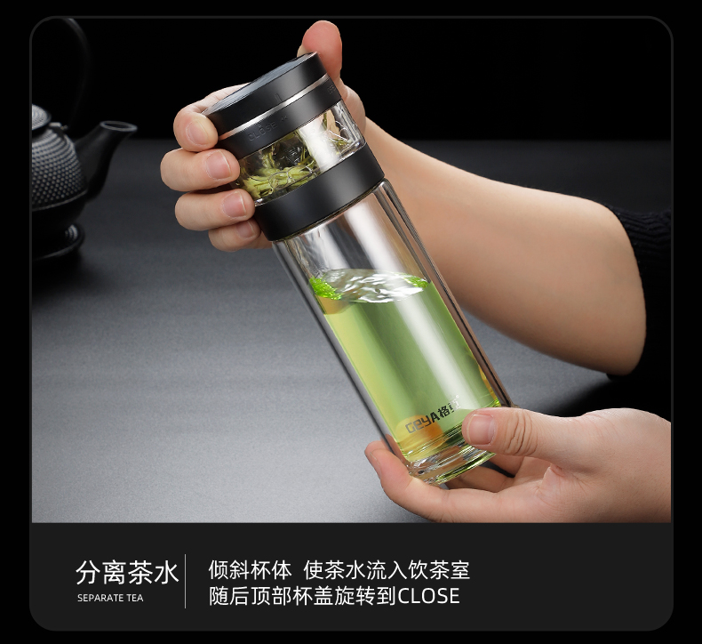 格亚(GEYA)茶水分离大容量玻璃杯双层茶杯男泡茶杯水杯便携杯子团购定制 咖啡色450ml