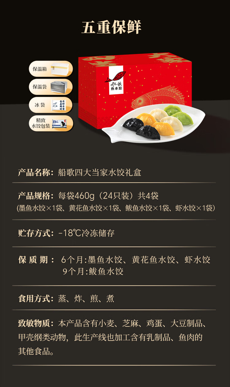 船歌鱼水饺 四大当家水饺礼盒460g*4(海鲜速冻饺子馄饨 生鲜早餐食品送礼) 四大当家水饺礼盒