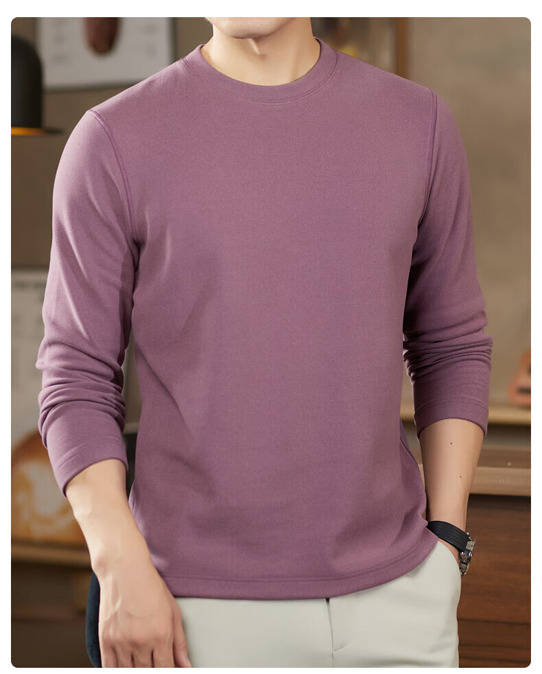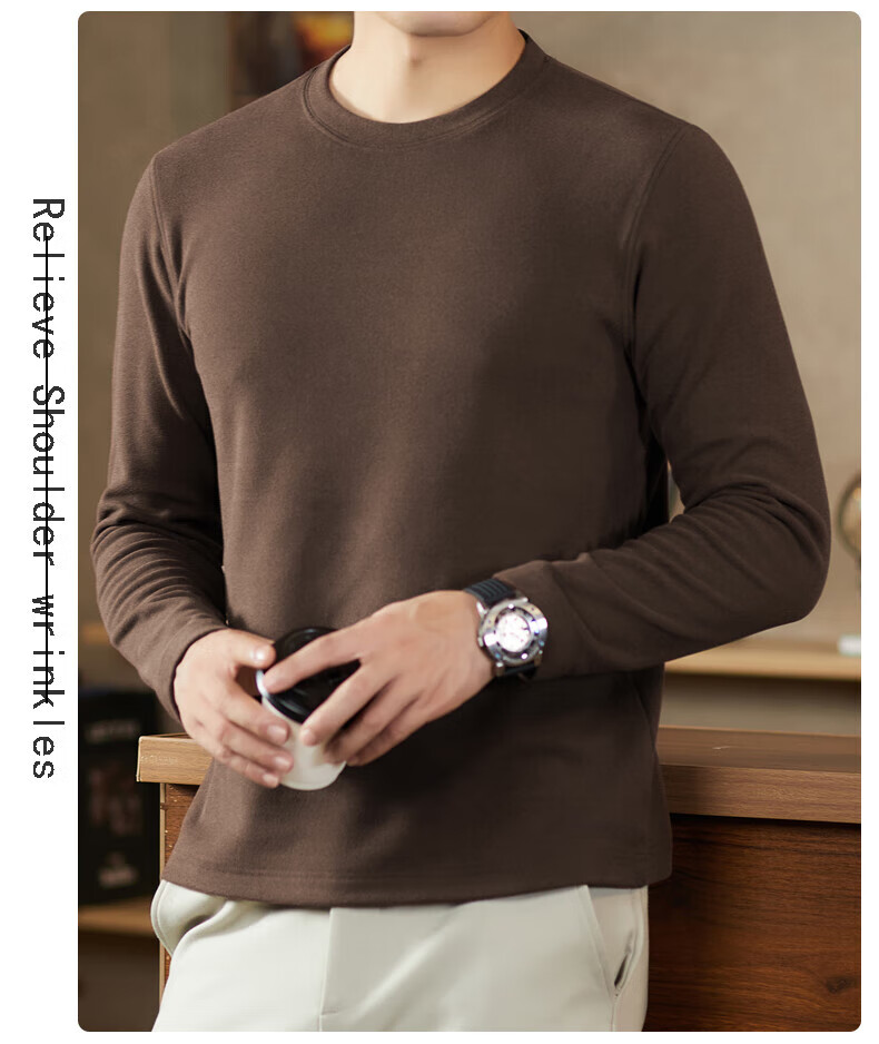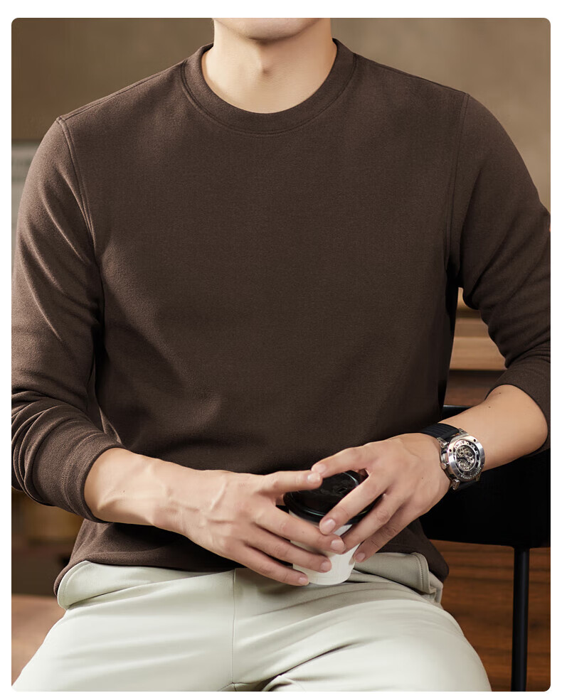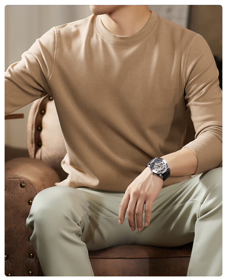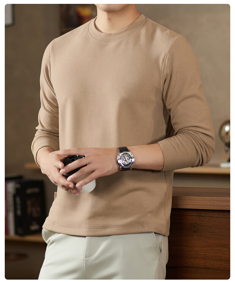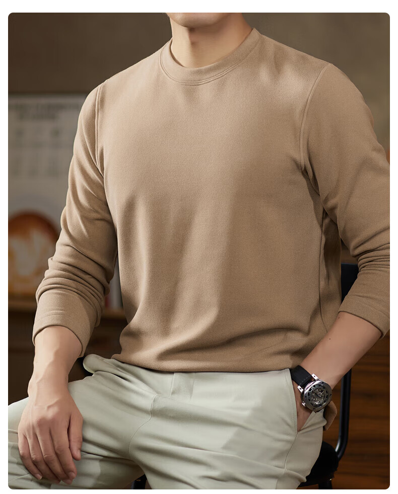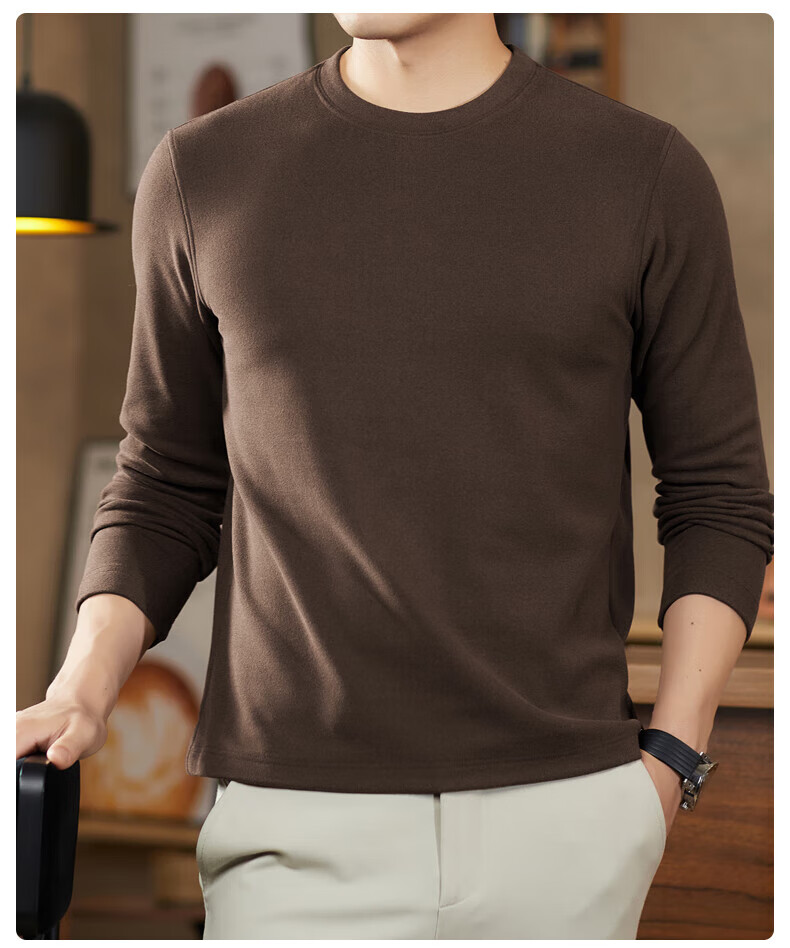 罗蒙(ROMON)驼绒长袖T恤男加绒含桑蚕丝莱赛尔圆领高弹2025秋季新款抗皱打底 浅驼 L (175)【建议120-135斤】