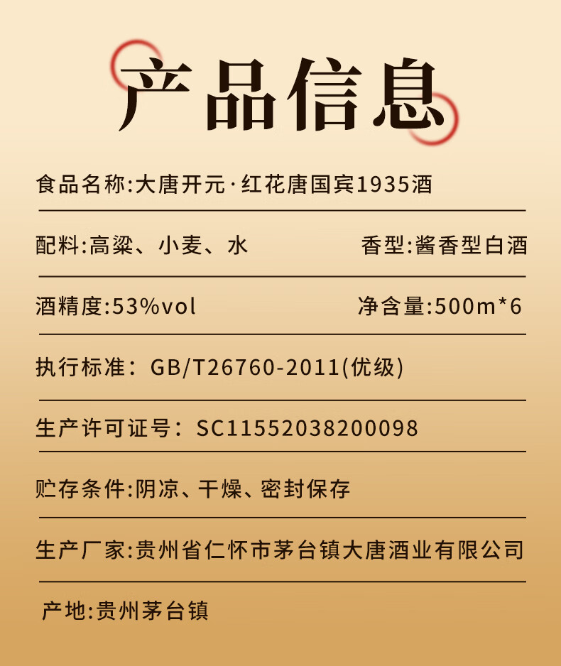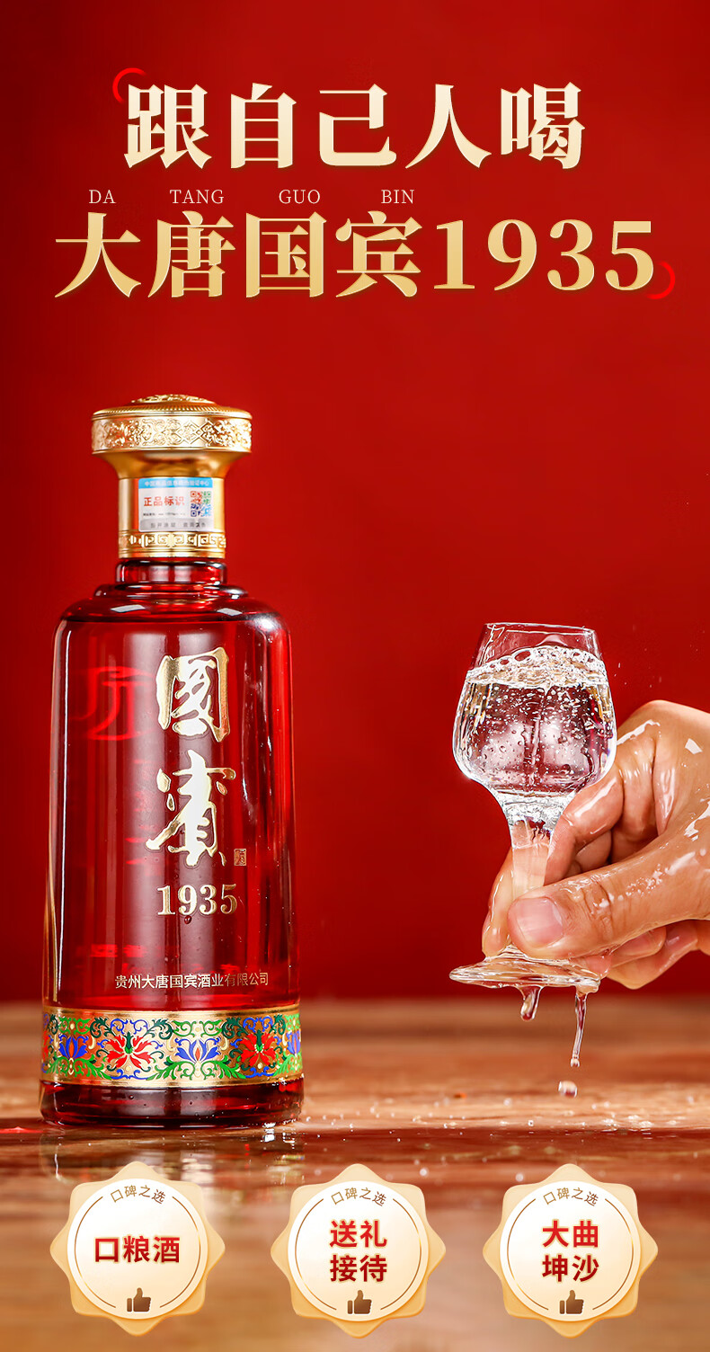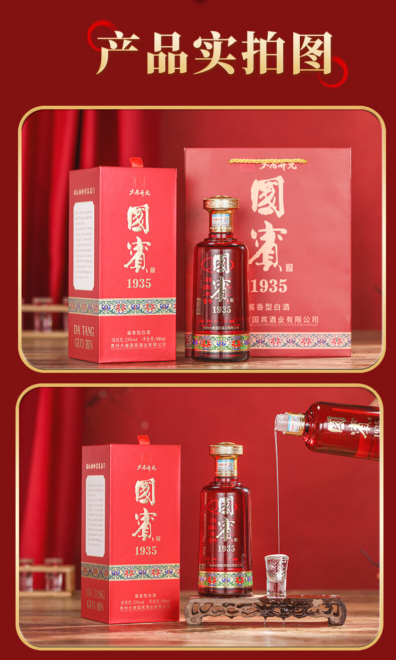 大唐开元贵州茅台镇酱香型白酒53度国宾1935高粱原浆酒水粮食坤沙酱酒送礼 53度 500mL 6瓶 整箱(送3个礼品袋)