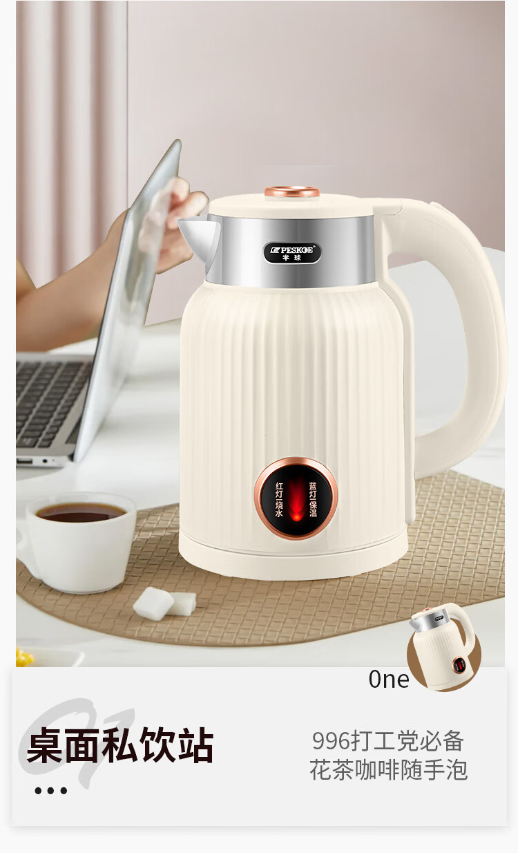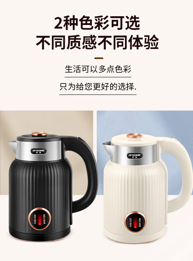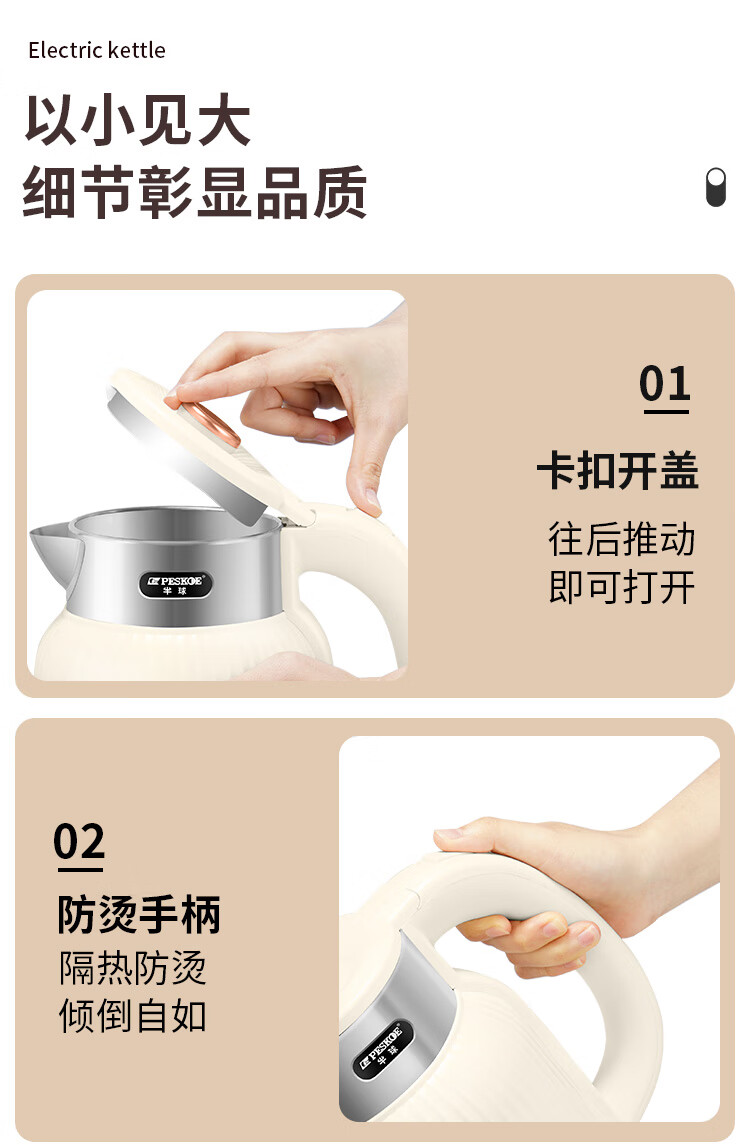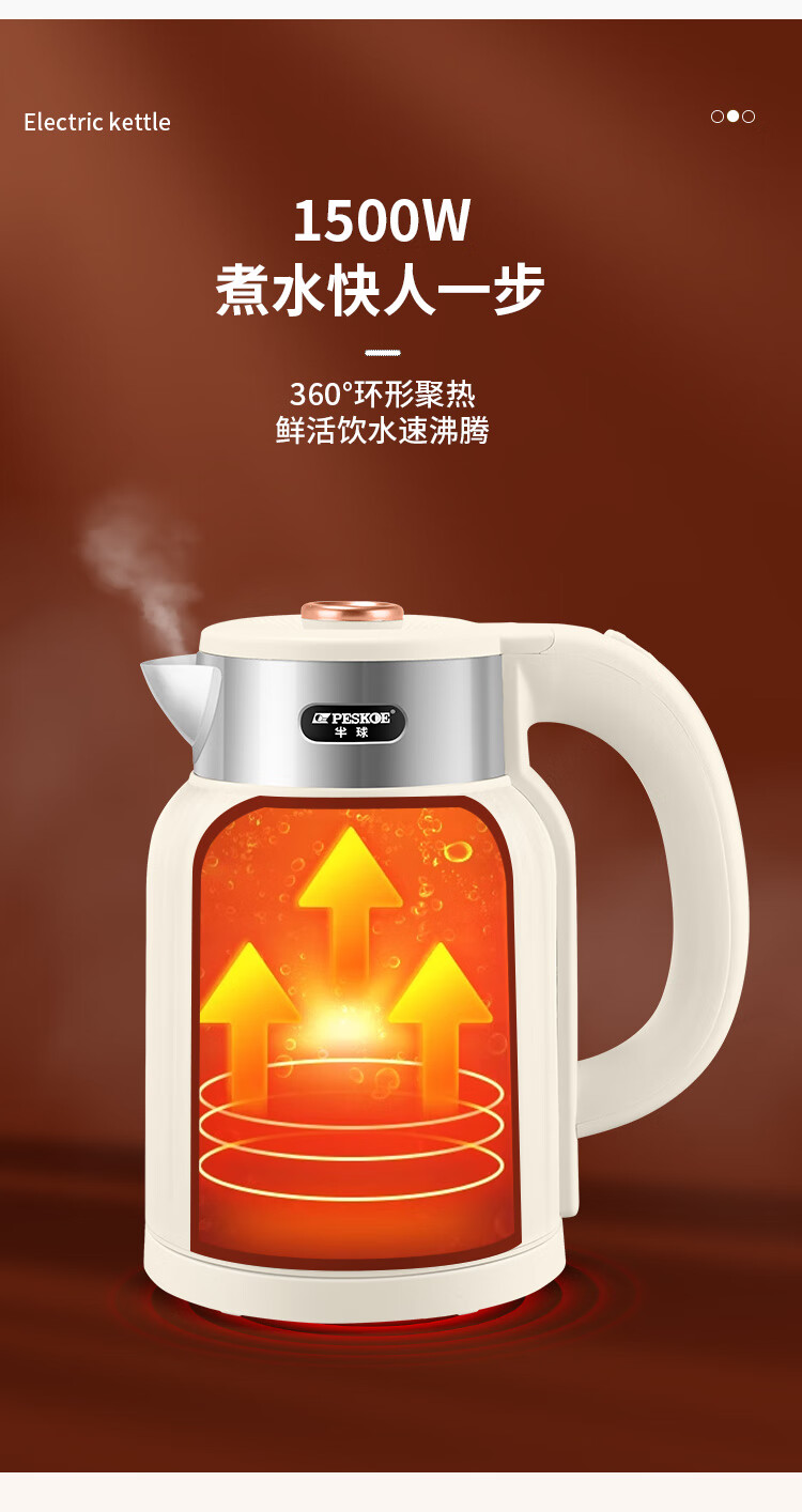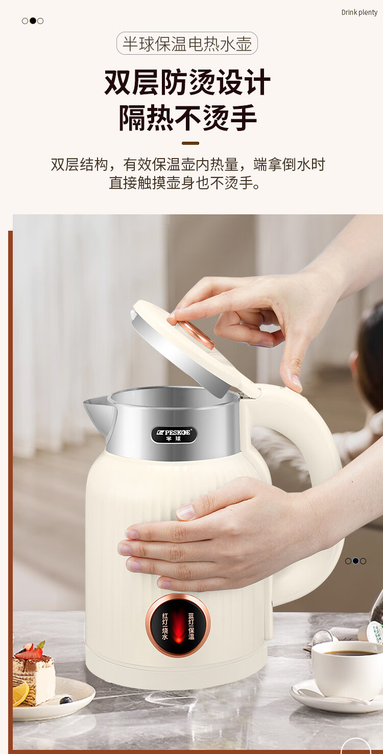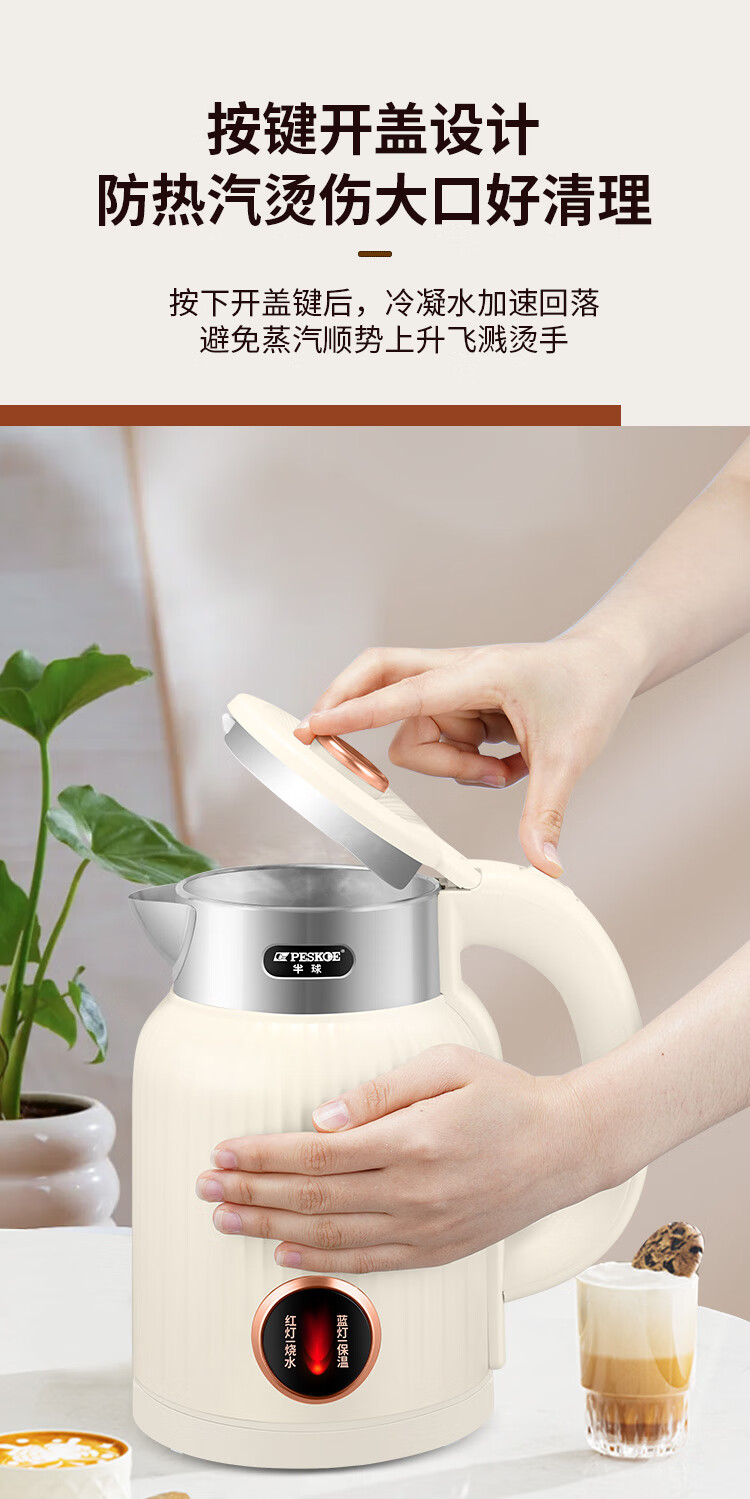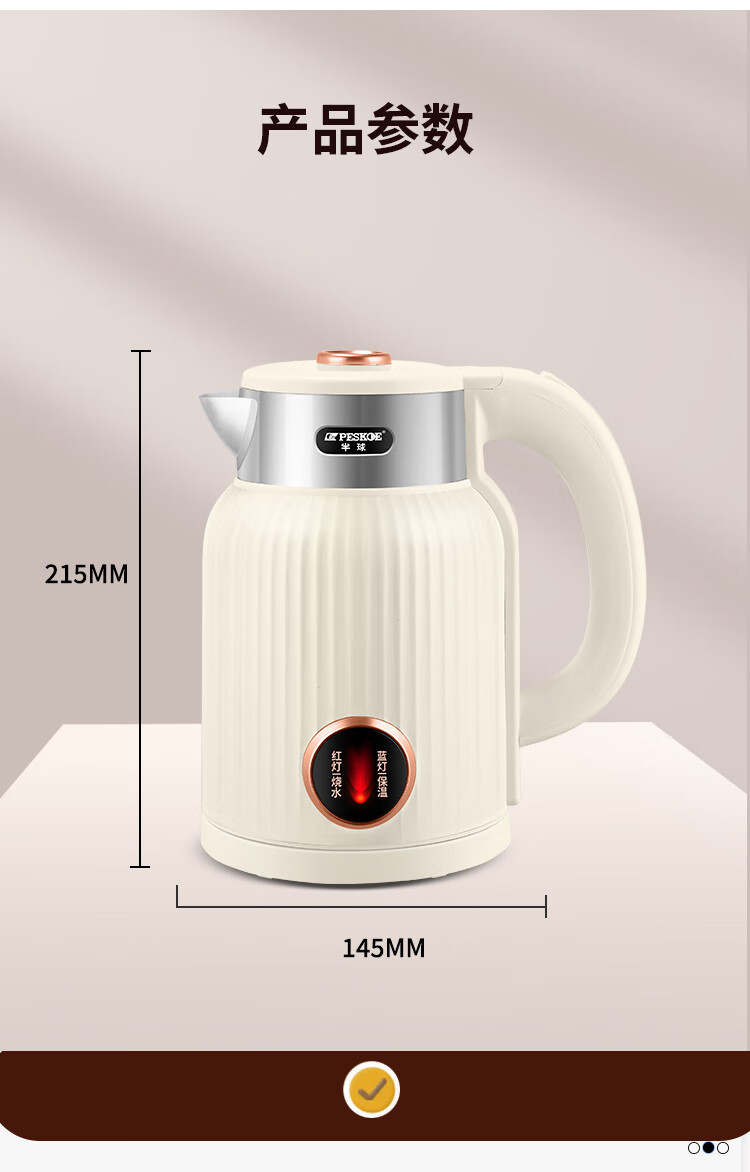 半球烧水壶热水壶电热水壶电水壶便携家用全自动小不锈钢大容量双层防烫自动断电 2L 米黄色加厚版-线长约60厘米