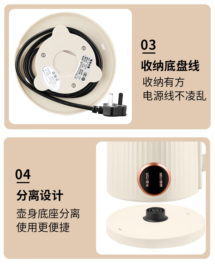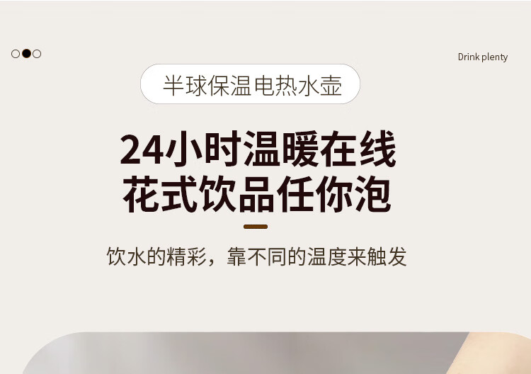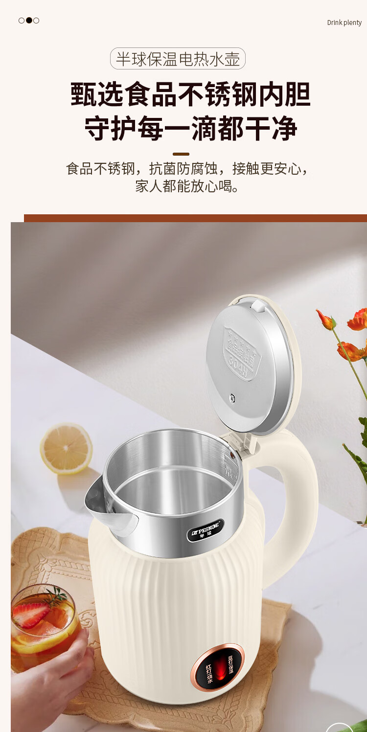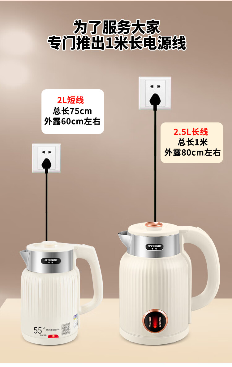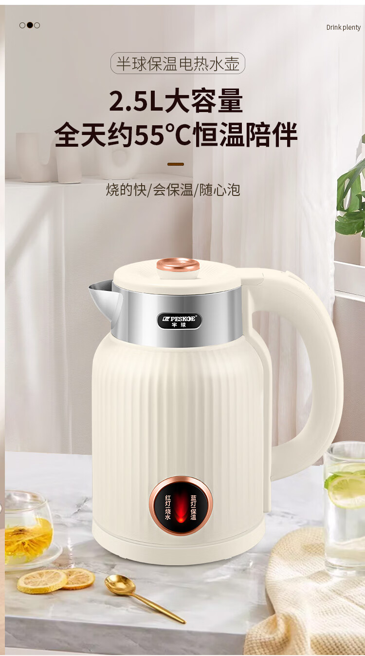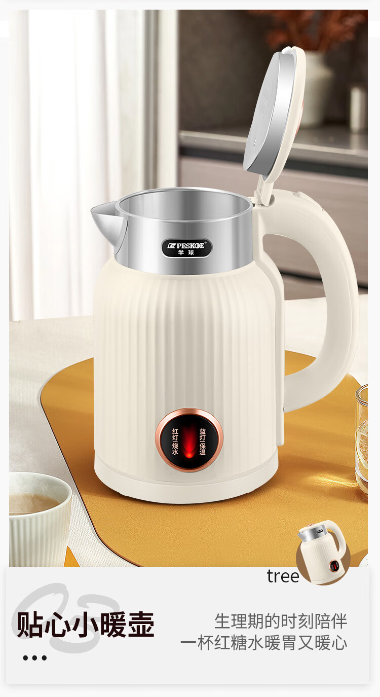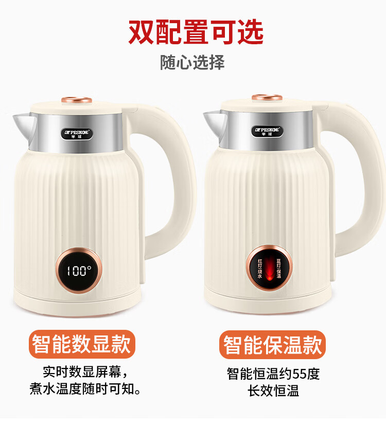半球烧水壶热水壶电热水壶电水壶便携家用全自动小不锈钢大容量双层防烫自动断电 2L 米黄色加厚版-线长约60厘米