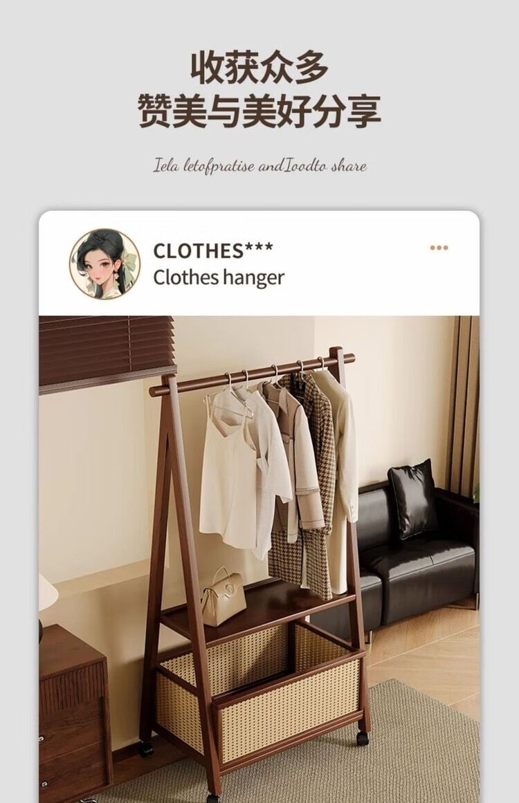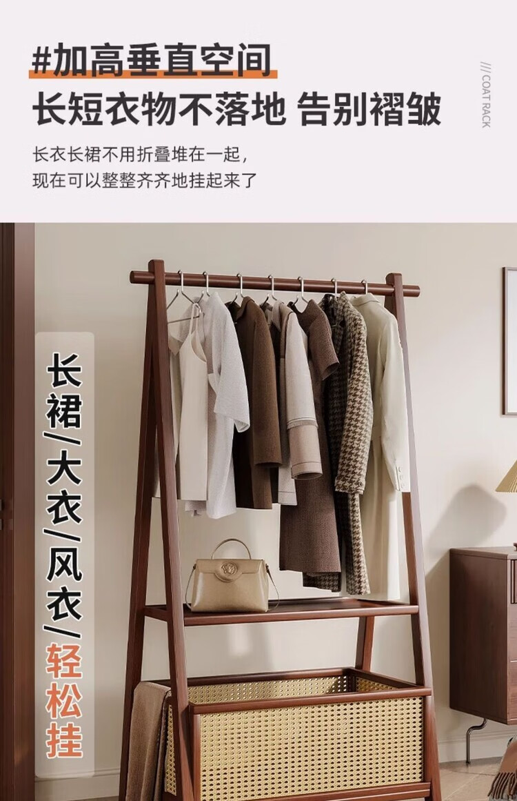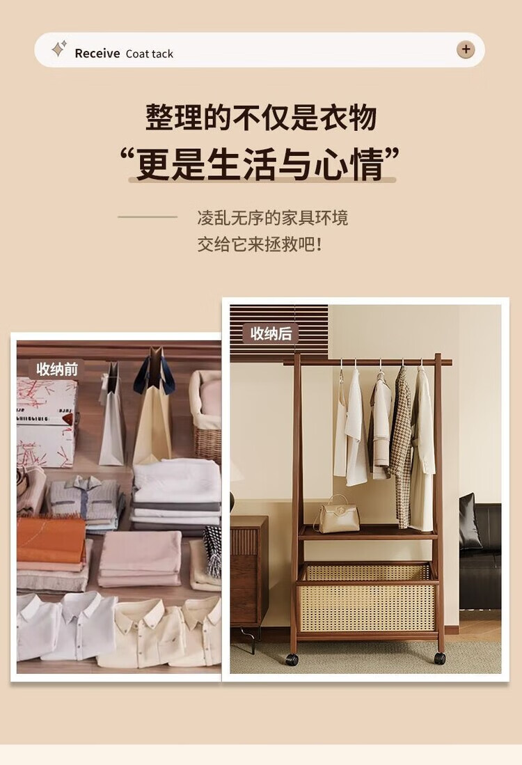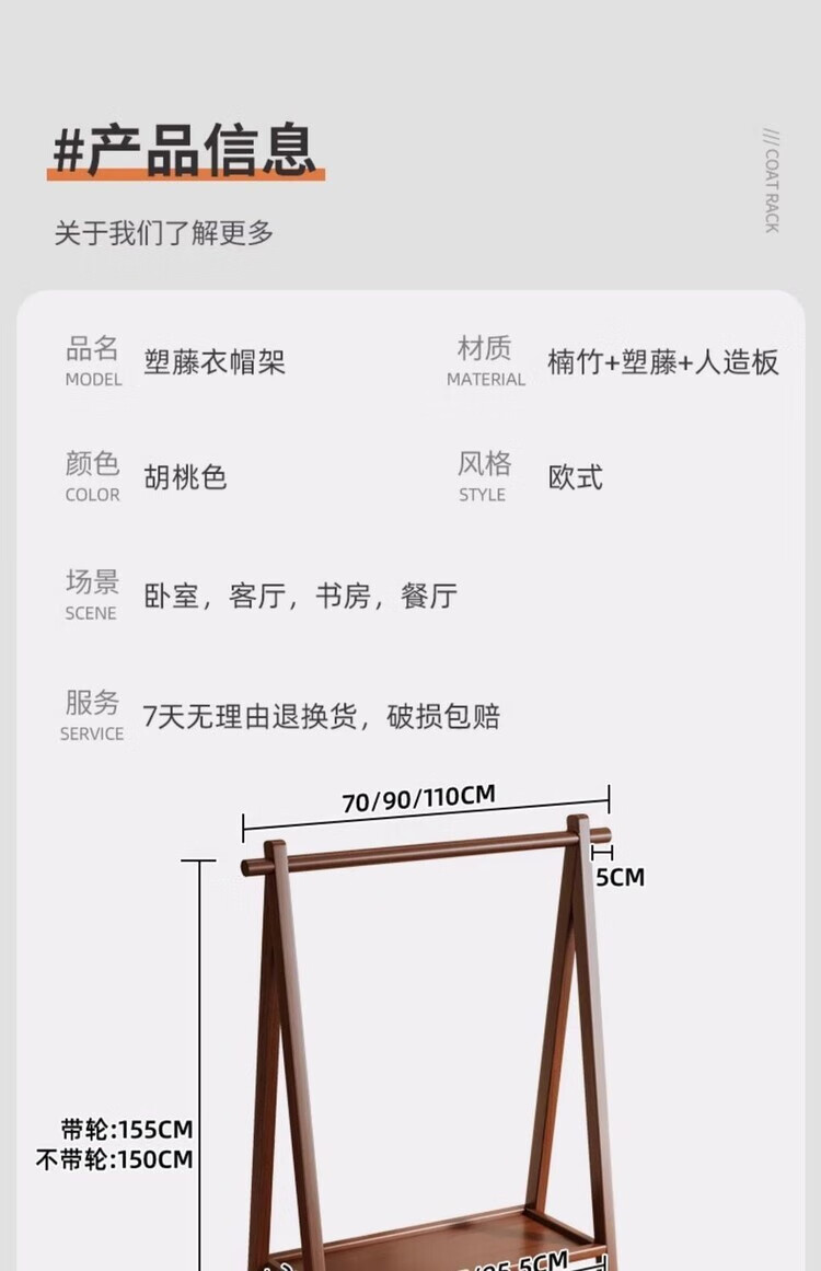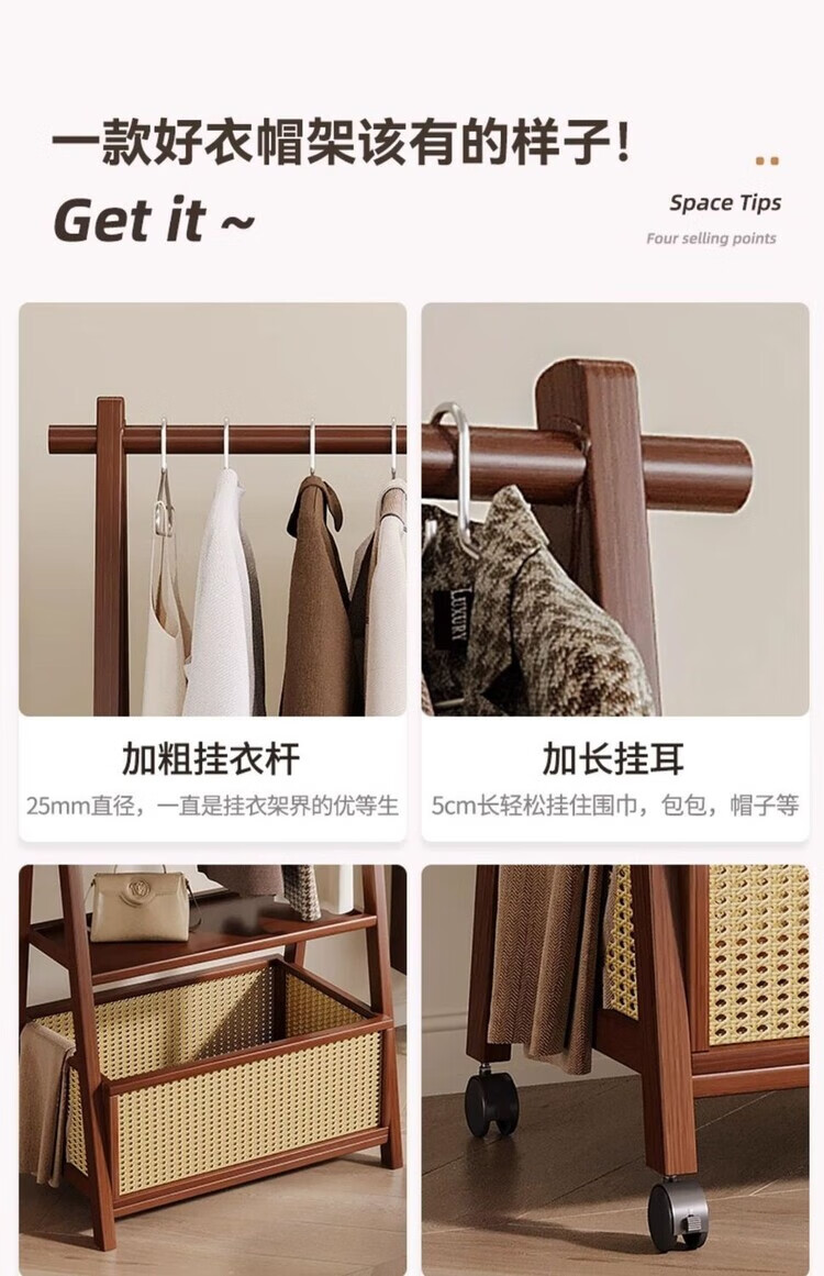 欣慕雅衣架落地立式衣帽架卧室简易移动家用衣服挂衣架多功能收纳置物架 中古茶-60cm长无轮-塑藤款升级铜套挂耳