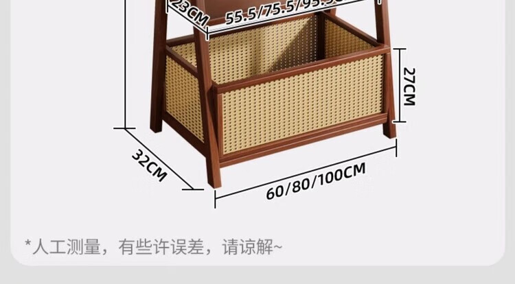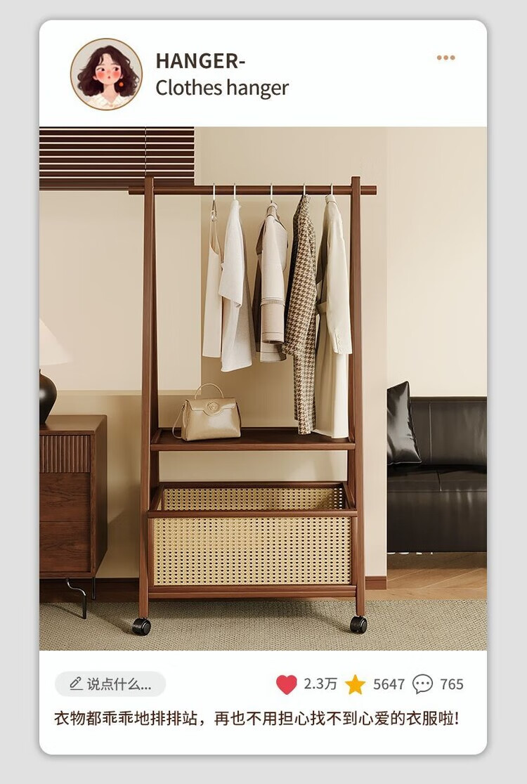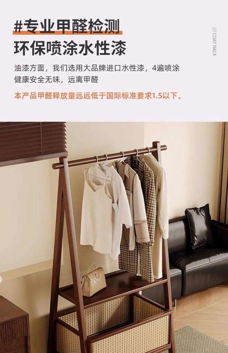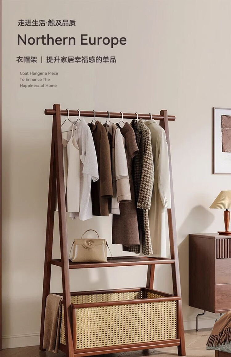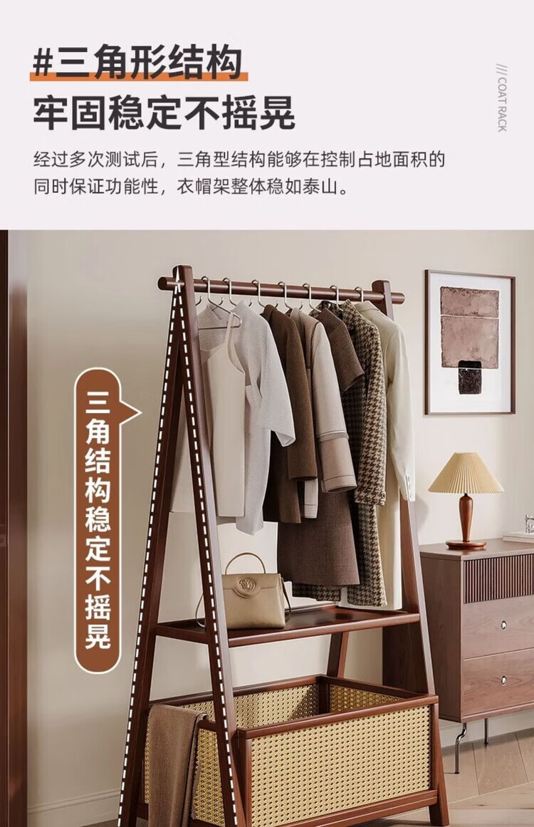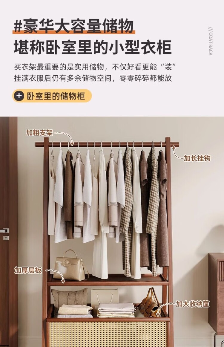 欣慕雅衣架落地立式衣帽架卧室简易移动家用衣服挂衣架多功能收纳置物架 中古茶-60cm长无轮-塑藤款升级铜套挂耳