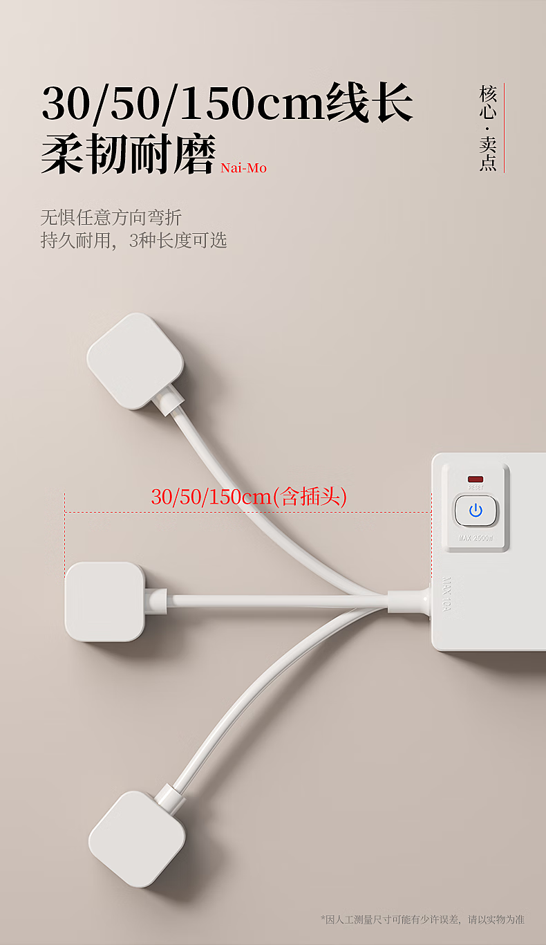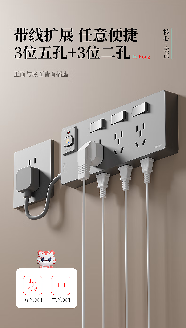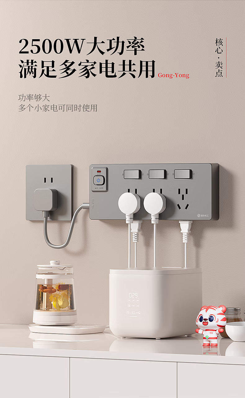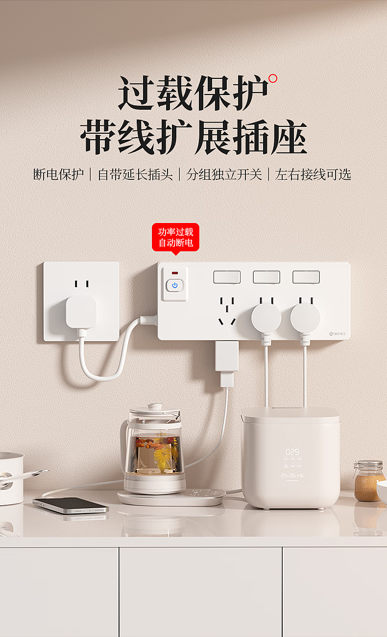国际电工一转多分控拓展扩展插座家用带线过载保护厨房餐边柜带开关插线板 白色三开21孔向左扩展【带30cm电源线】