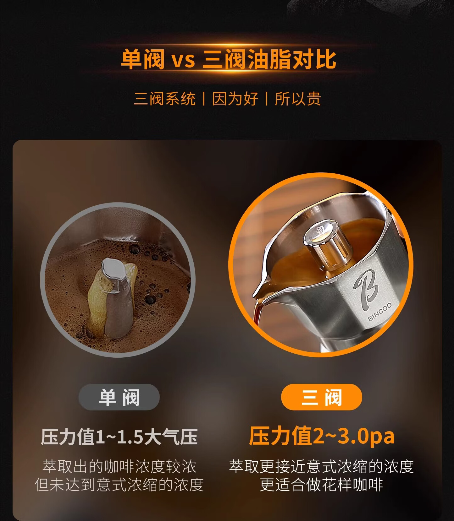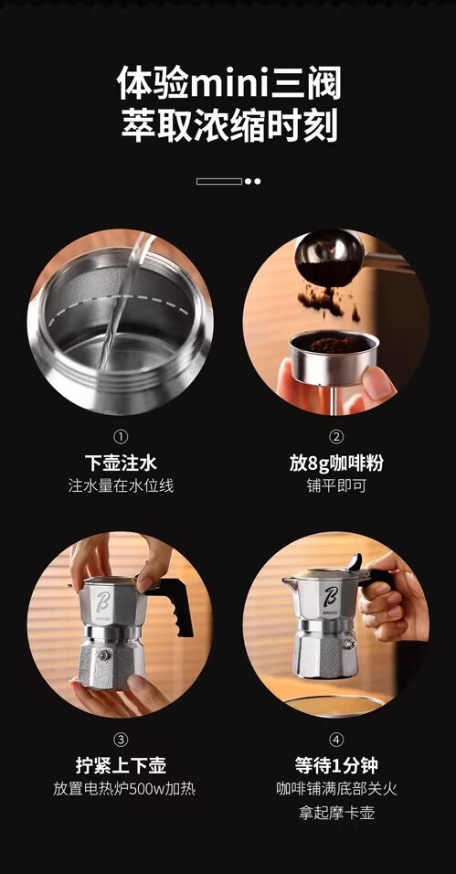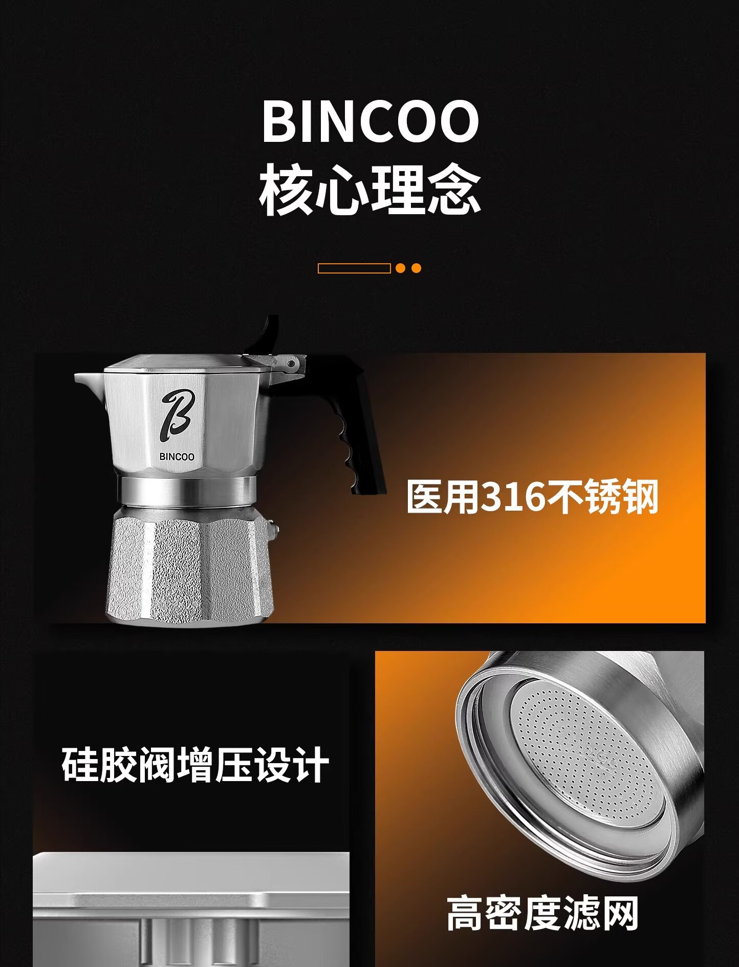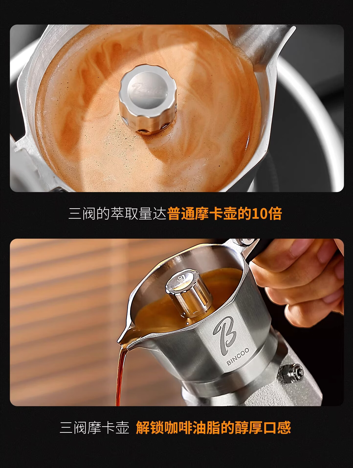 Bincoo三阀316不锈钢摩卡壶双阀煮咖啡家用小型意式咖啡机全套装 2人份摩卡壶5件套-钢芯手磨 三阀