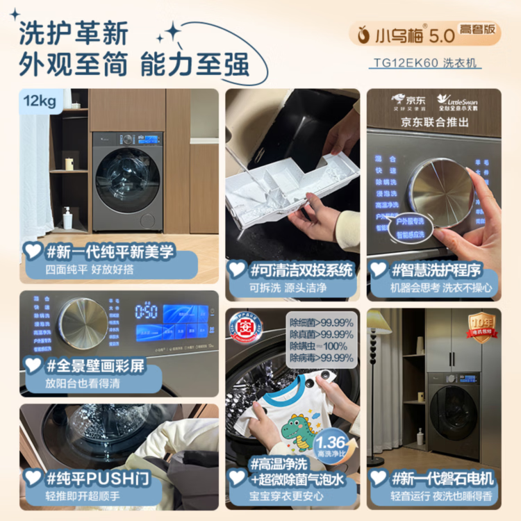 小天鹅(LittleSwan)小乌梅5.0高奢版 AWE同款洗衣机滚筒全自动家用12公斤纯平大容量超微特渍洗1.36洗净比 一级能效 TG12EK60 滚筒单洗