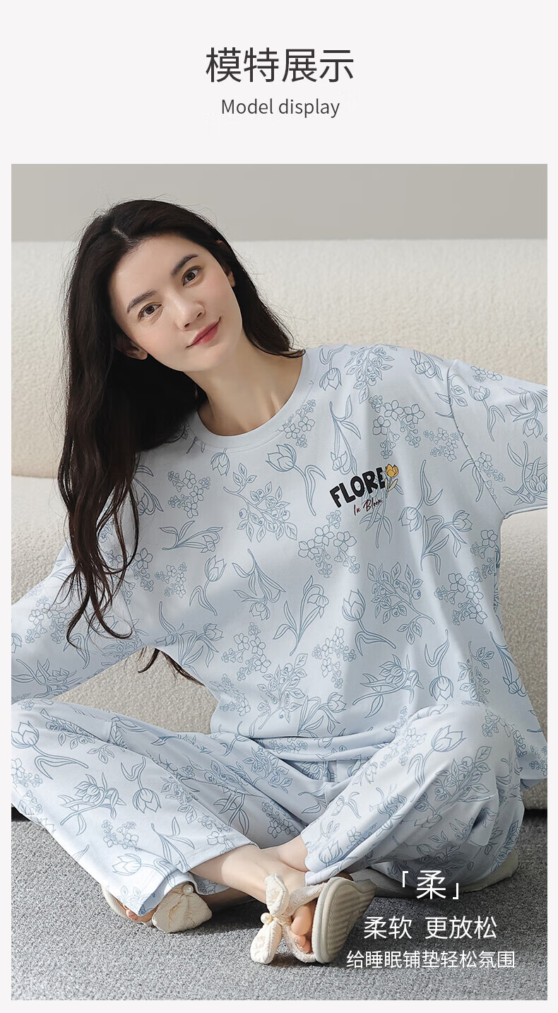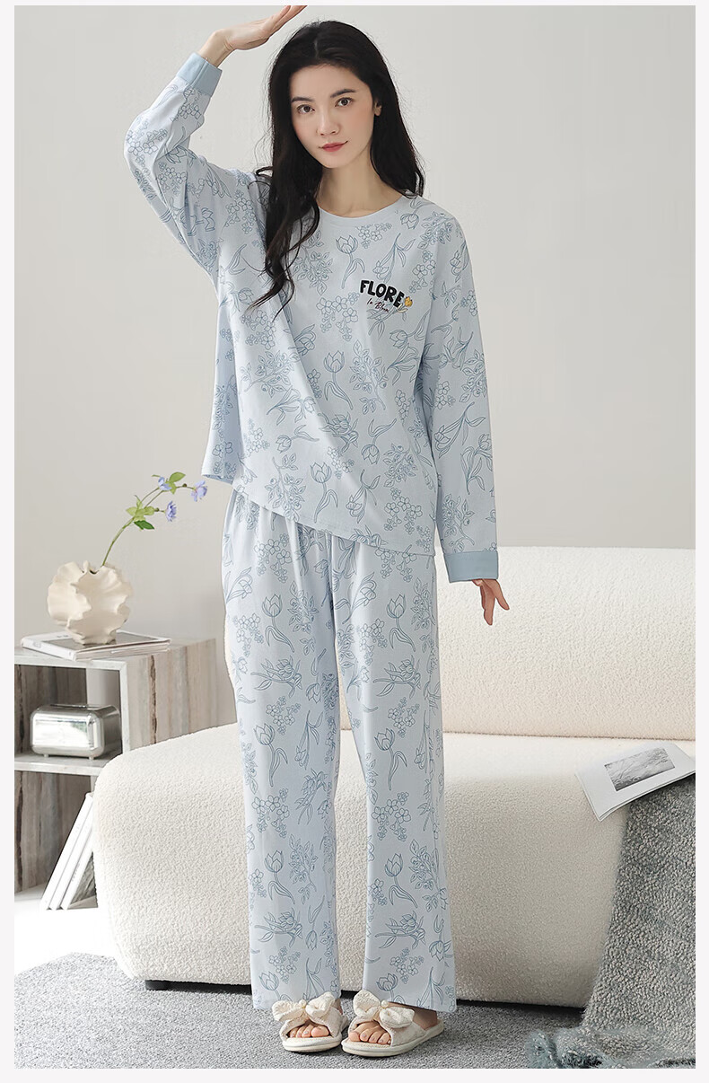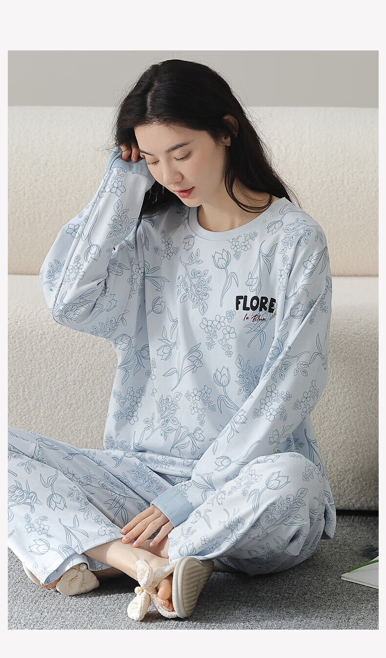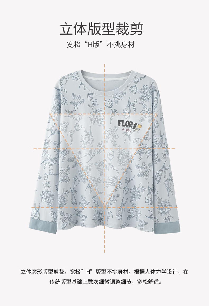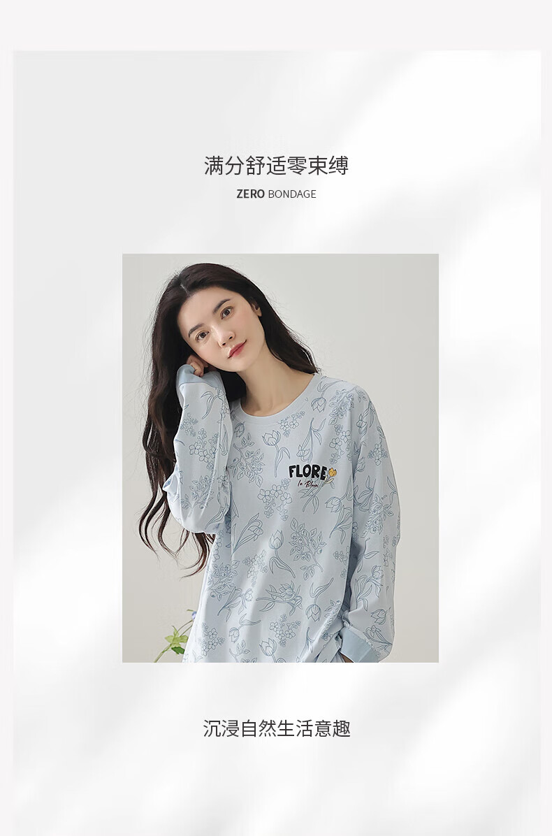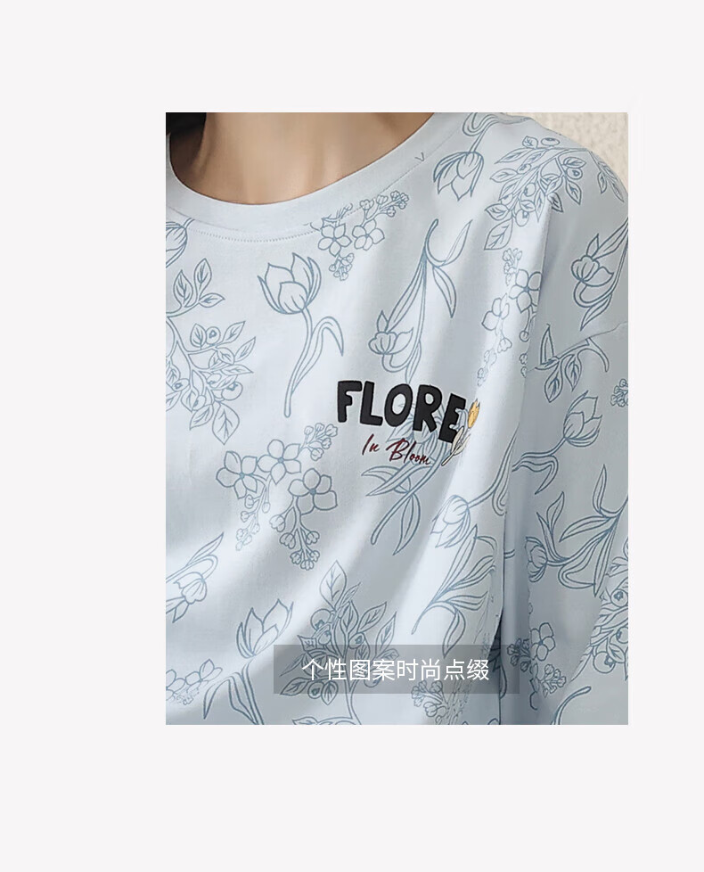 芬腾睡衣女纯棉2025秋新款优雅花卉套头休闲外穿长袖家居服套装 浅蓝 L