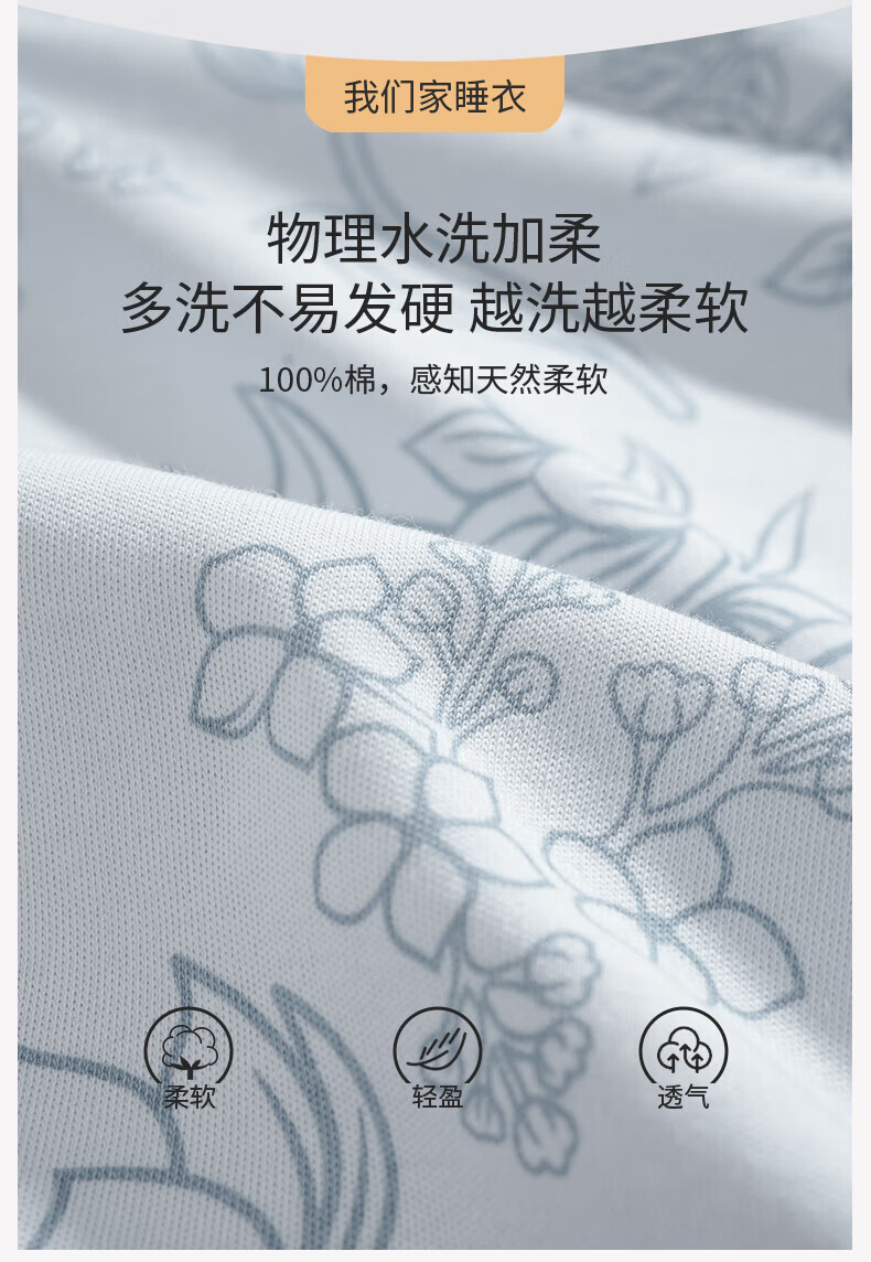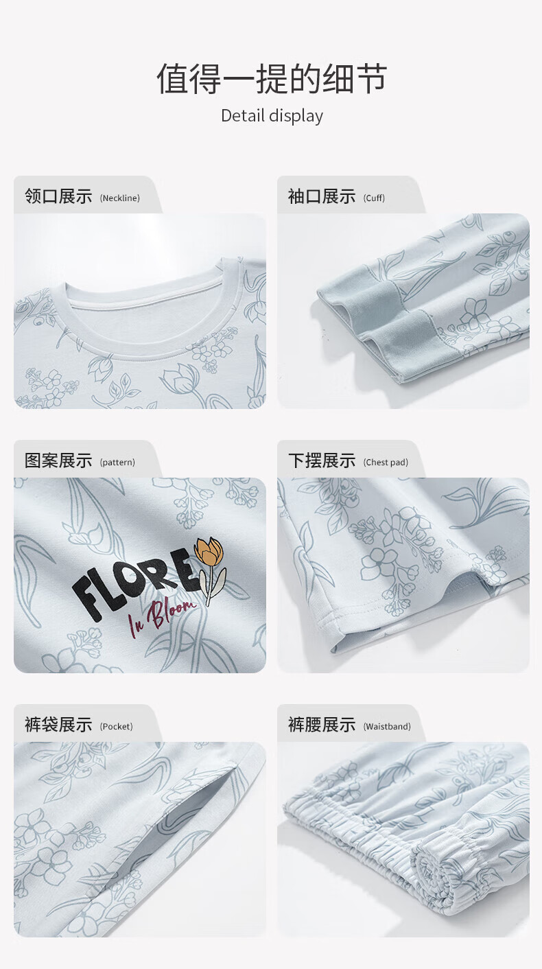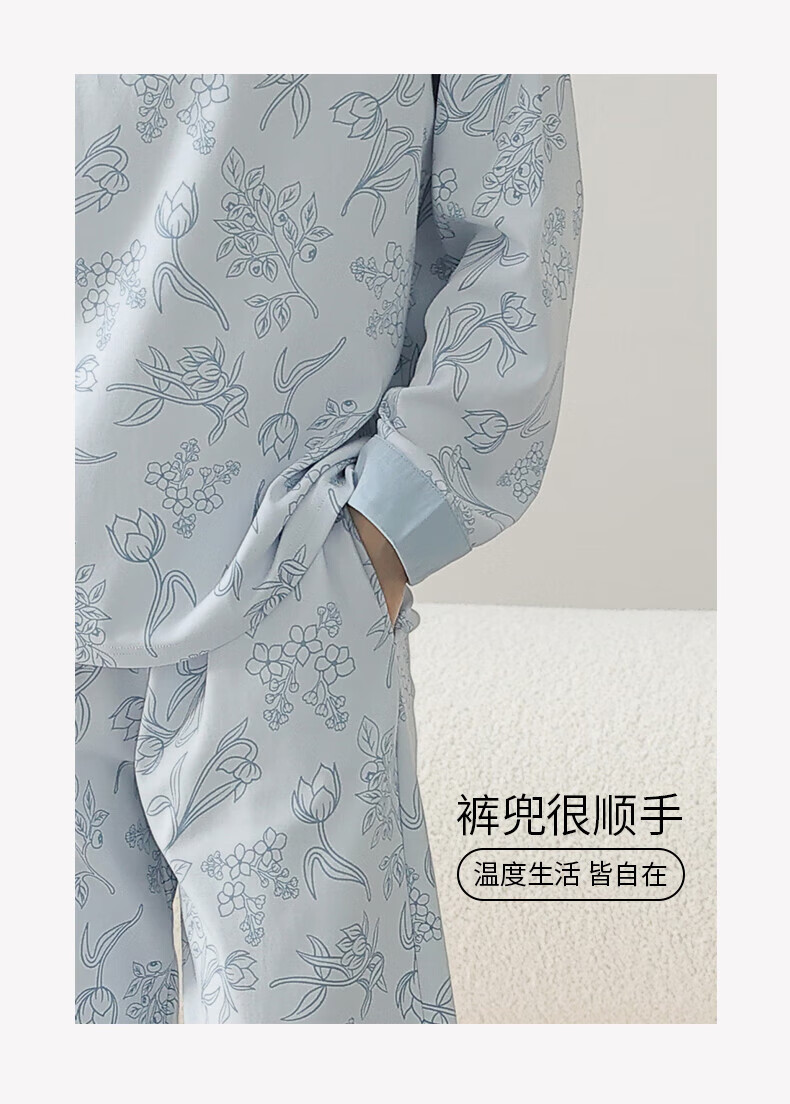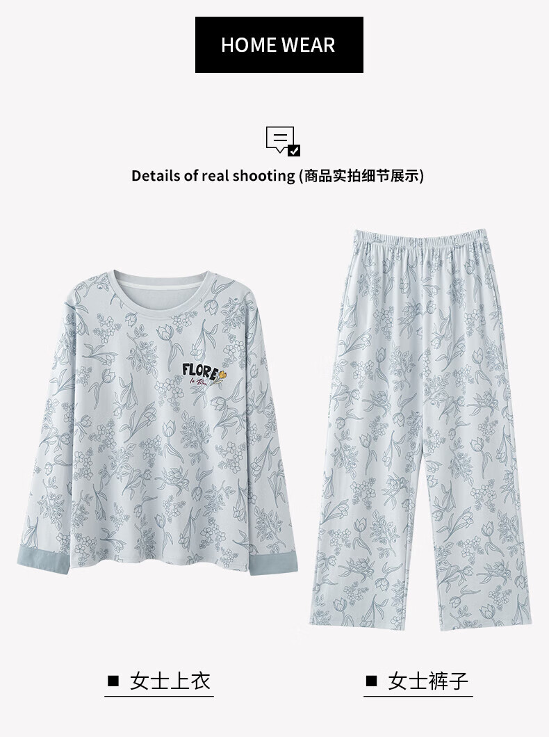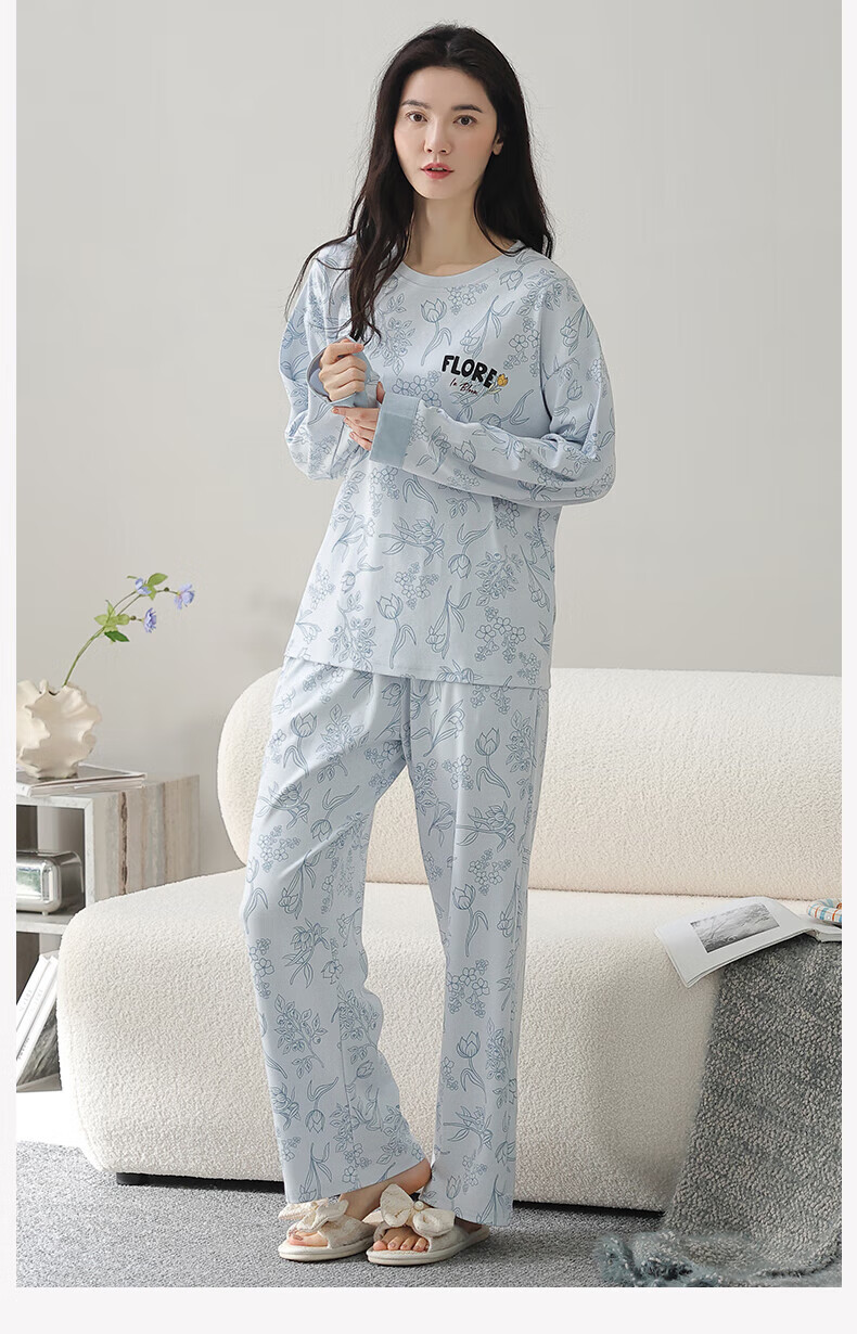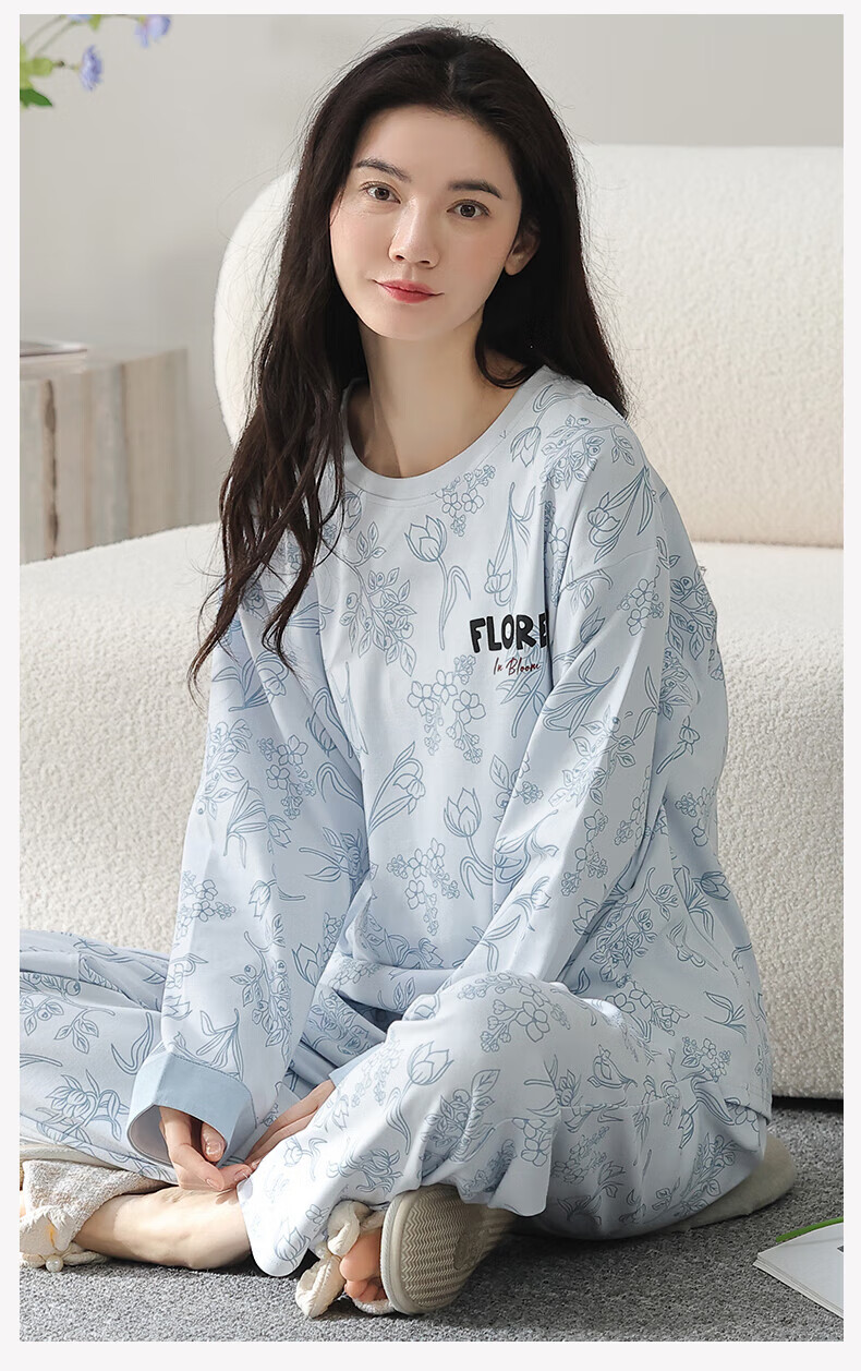 芬腾睡衣女纯棉2025秋新款优雅花卉套头休闲外穿长袖家居服套装 浅蓝 L