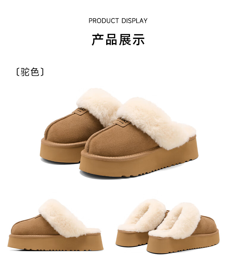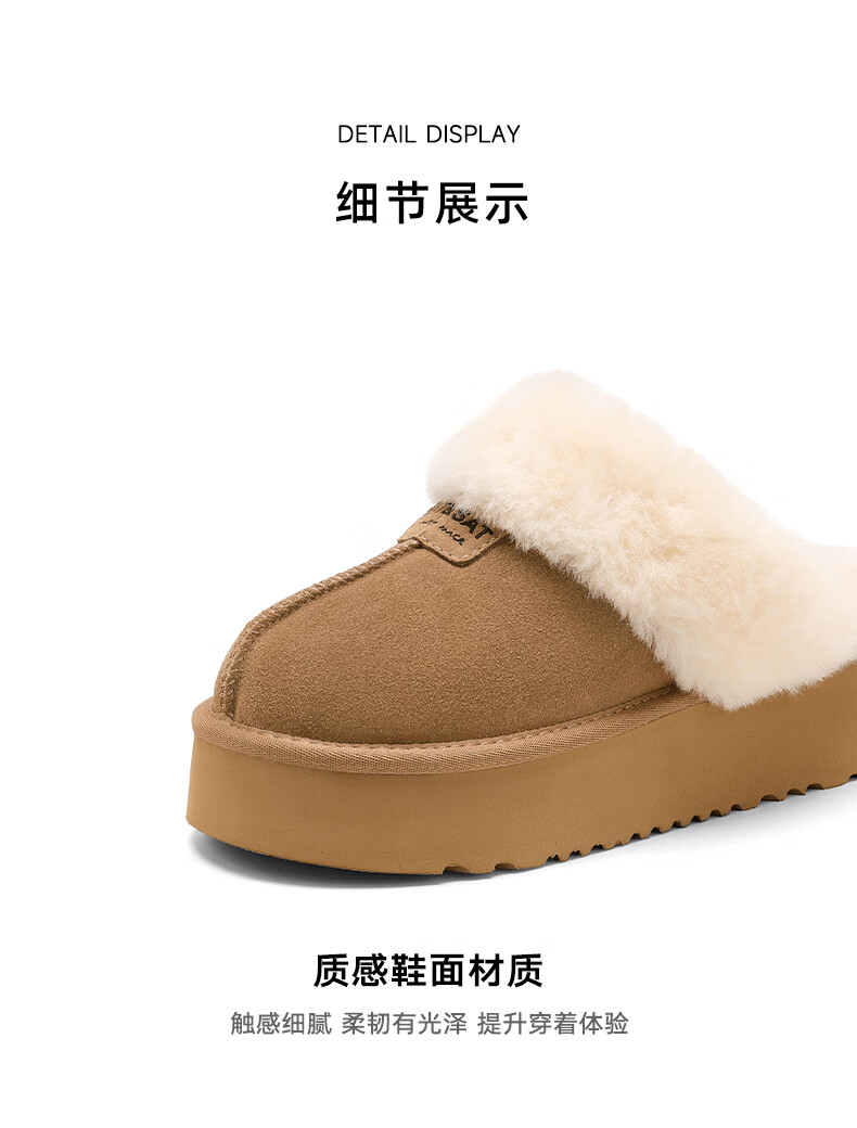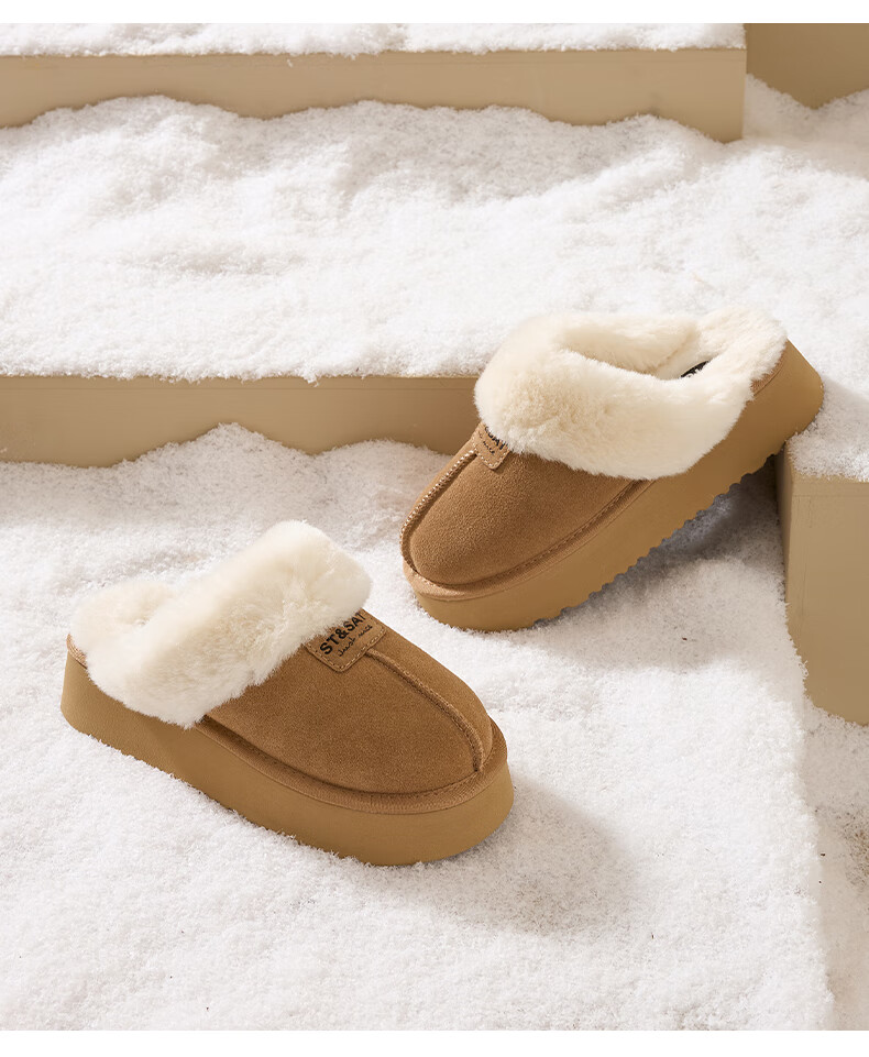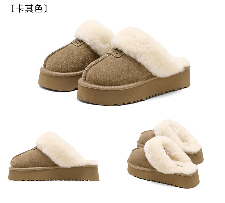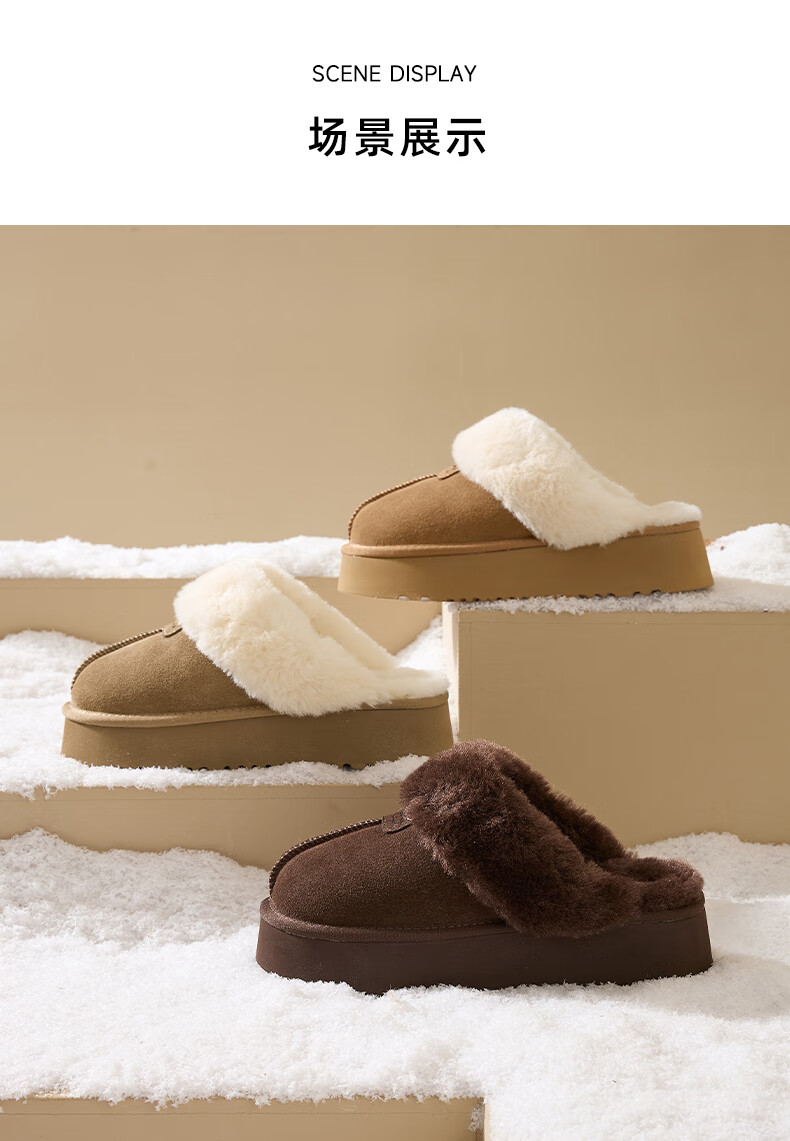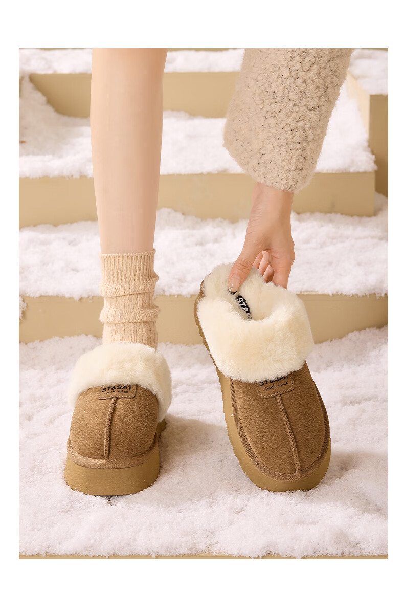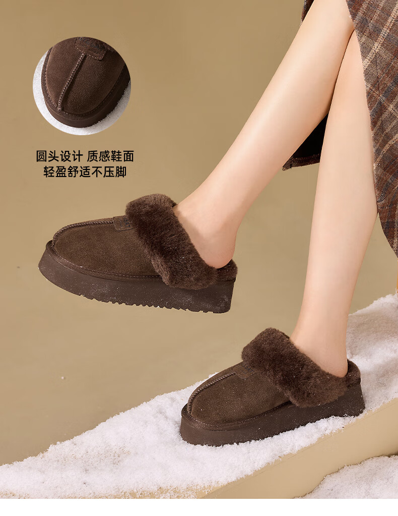 星期六厚底半拖雪地靴女款2025新款冬季加绒加厚毛毛棉拖鞋外穿保暖棉鞋 驼色 【超暖绒毛】跟高4.5cm 36