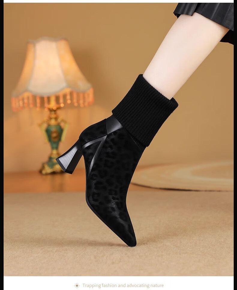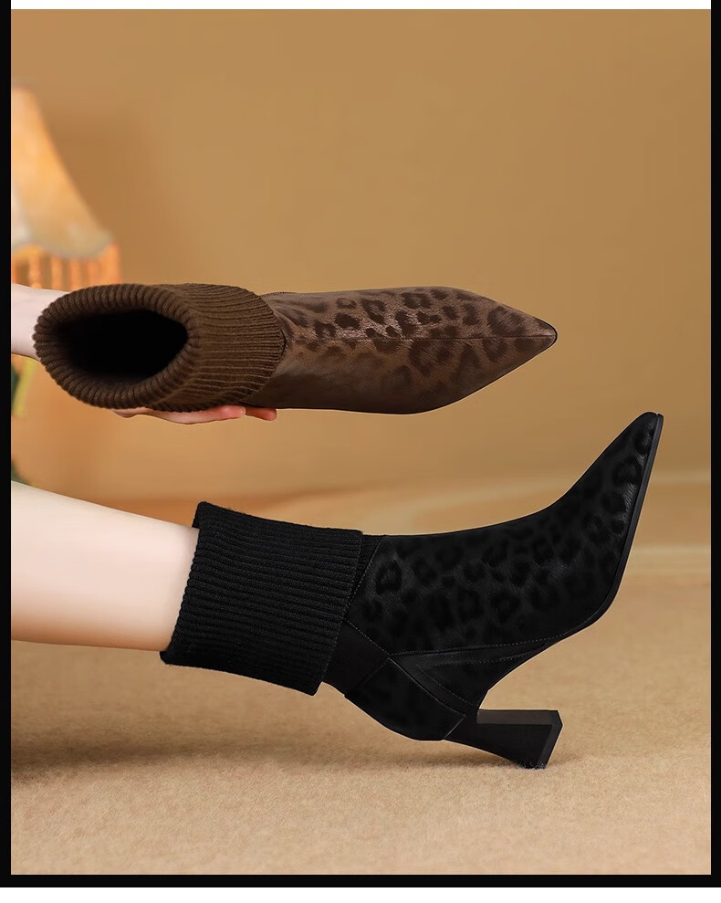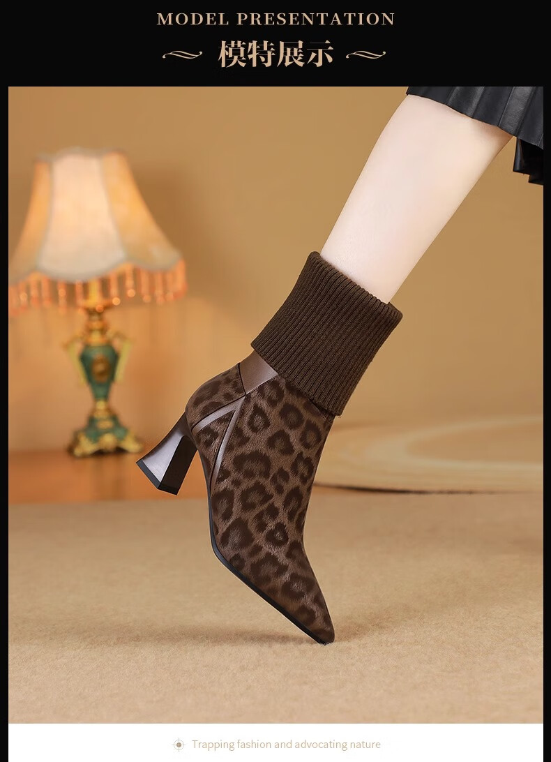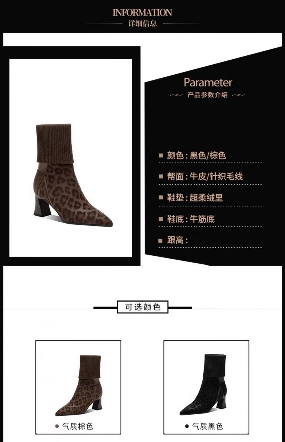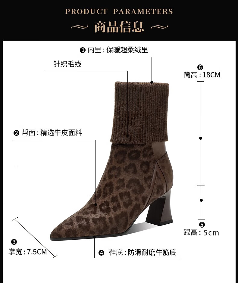稻草人(MEXICAN)头层真牛皮2025新款秋冬季高跟短靴粗跟尖头女靴加绒瘦瘦靴弹力靴 棕色【舒适款】 40