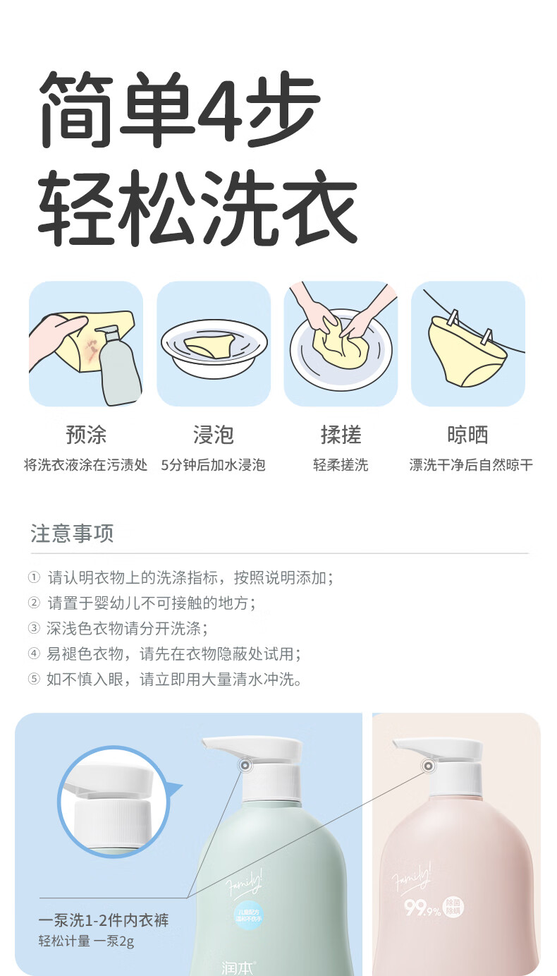 润本(RUNBEN)儿童内衣洗衣液婴儿宝宝内衣裤专用清洗液大人通用抑菌 300ml 2瓶 独立装 【多得20ml】