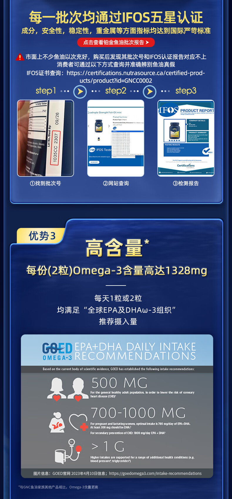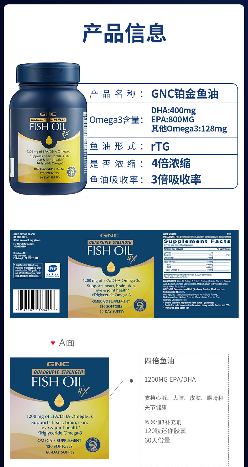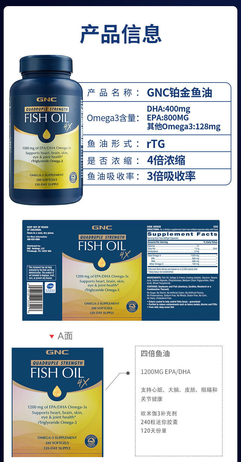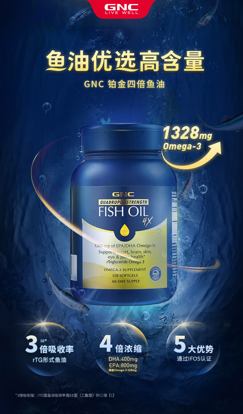 GNC健安喜四倍铂金鱼油深海高纯度鱼油软胶囊 无腥成人rTG型omega-3 【铂金四倍鱼油】 120粒*1瓶