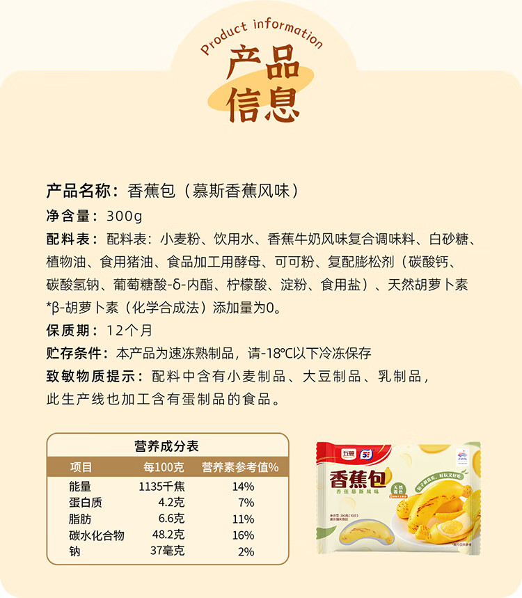 五丰 慕斯香蕉包300g*2袋20只 甜包子馒头点心儿童速食早餐面点半成品