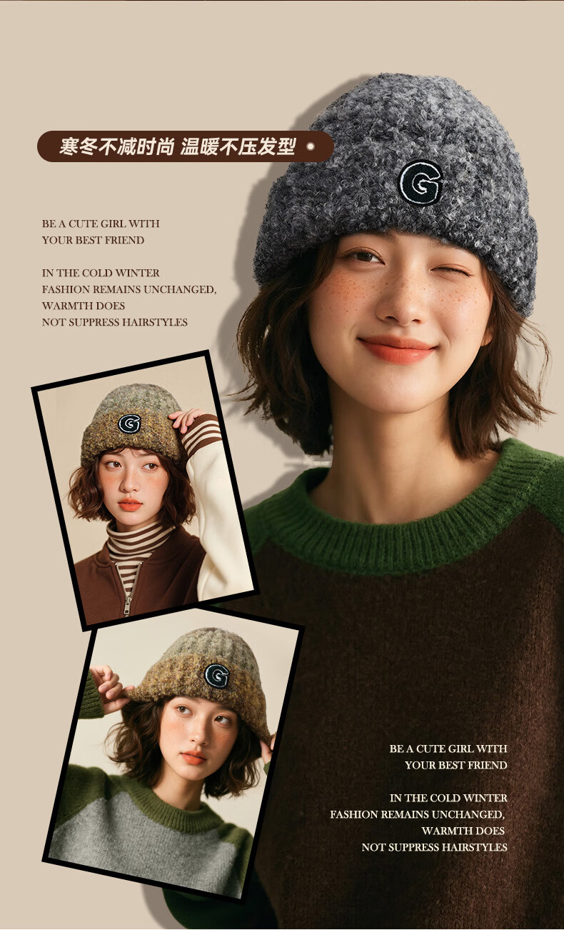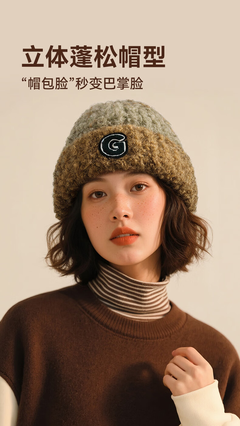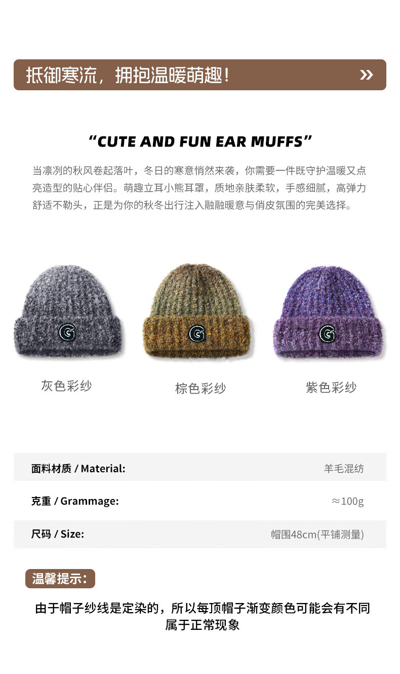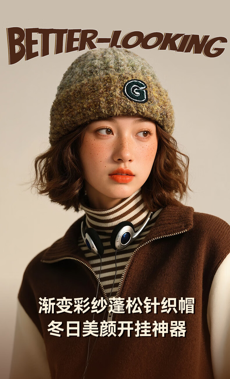 自相遇精品毛线帽女秋冬针织帽羊毛混纺加厚保暖百搭渐变大头围显脸小 暖檀棕 均码