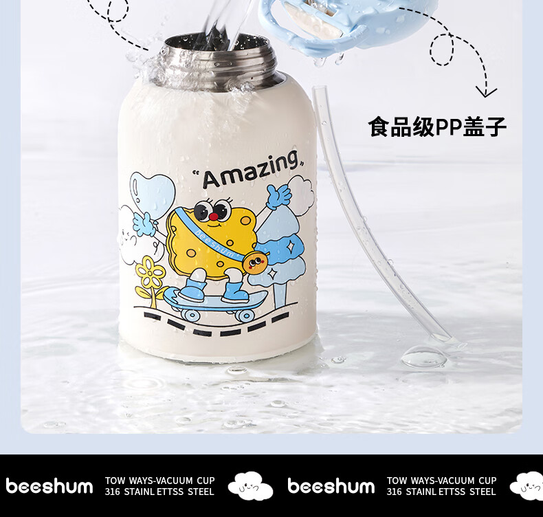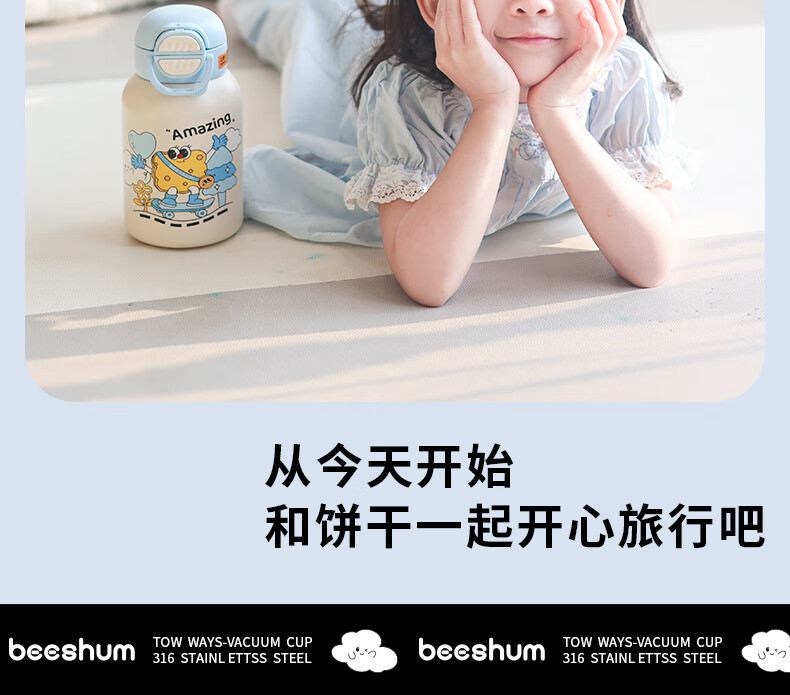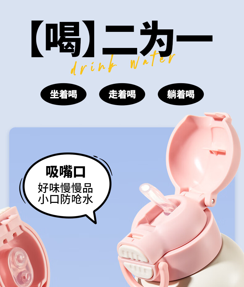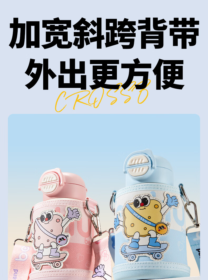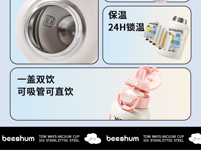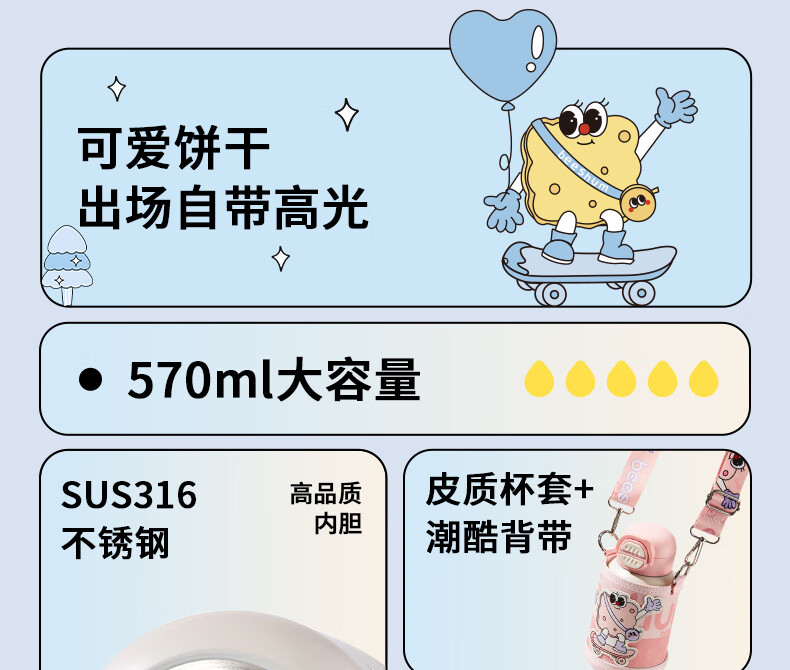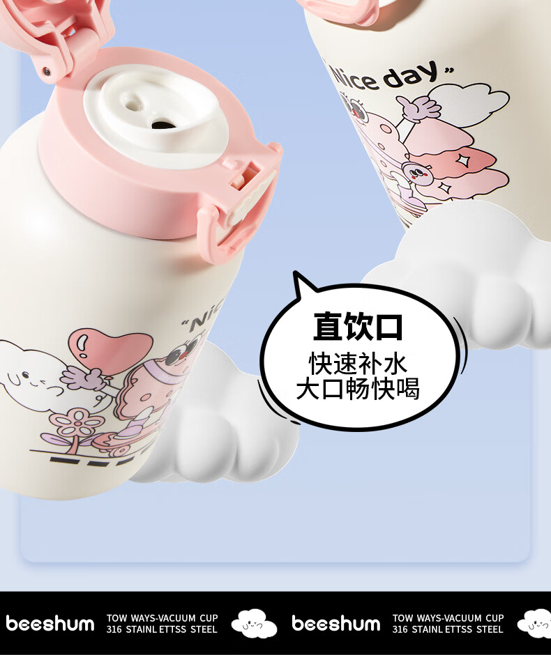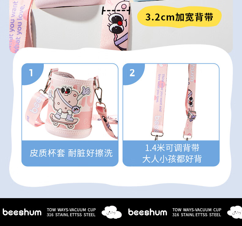Beeshum儿童水杯饼干保温杯小学生吸管杯316L不锈钢夏季直饮大容量外出壶 【套装】樱花粉+杯套+背带 570ml