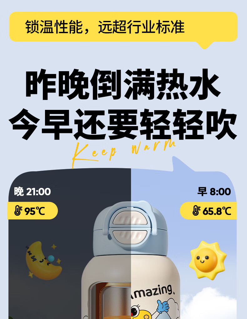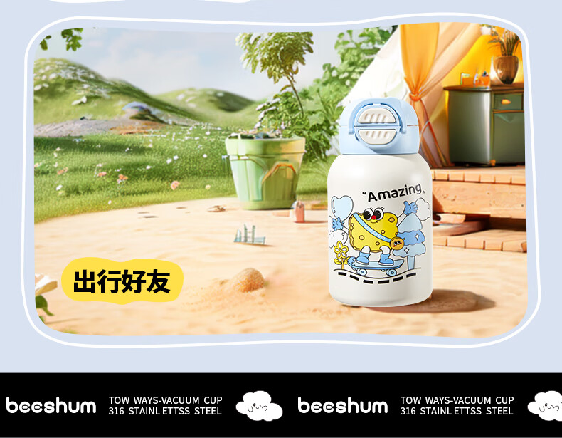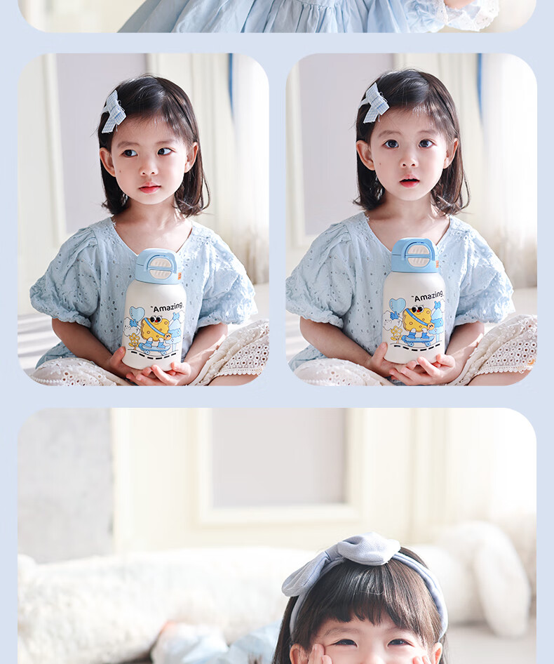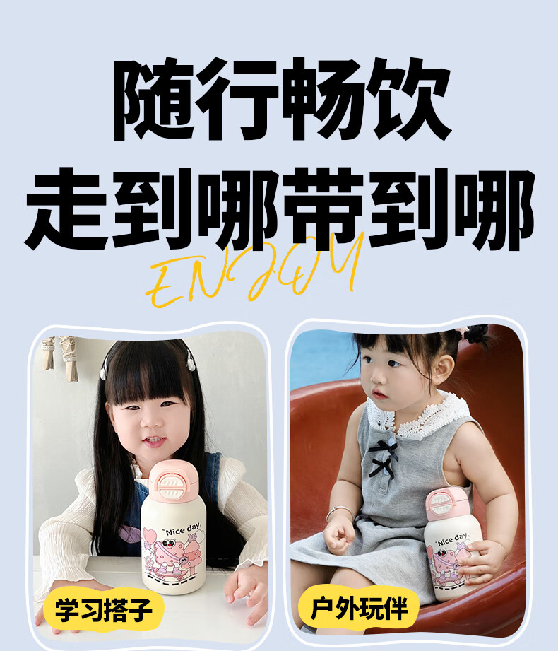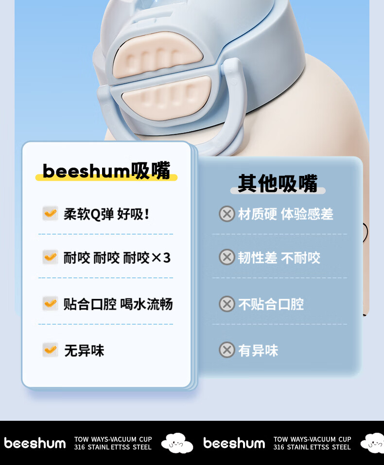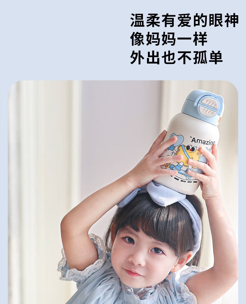 Beeshum儿童水杯饼干保温杯小学生吸管杯316L不锈钢夏季直饮大容量外出壶 【套装】樱花粉+杯套+背带 570ml