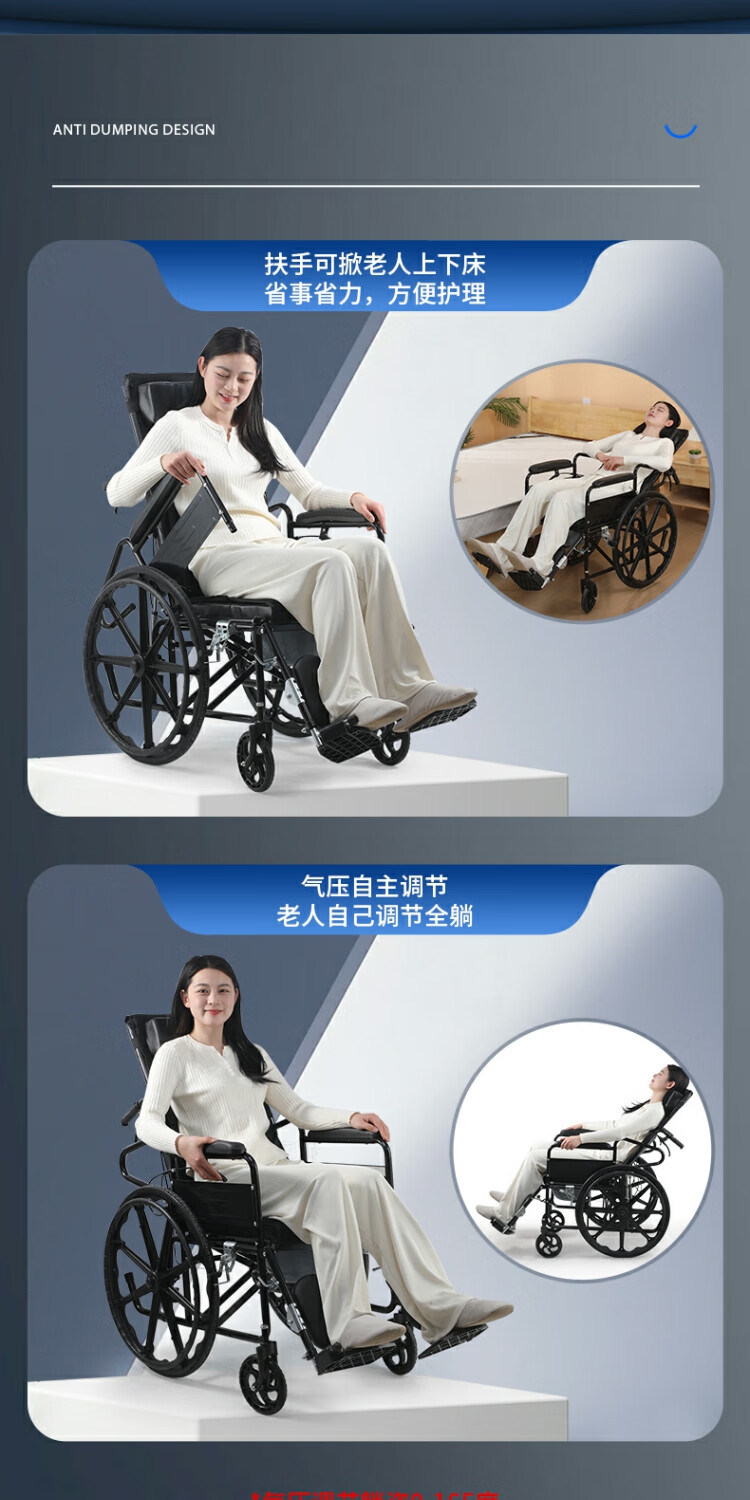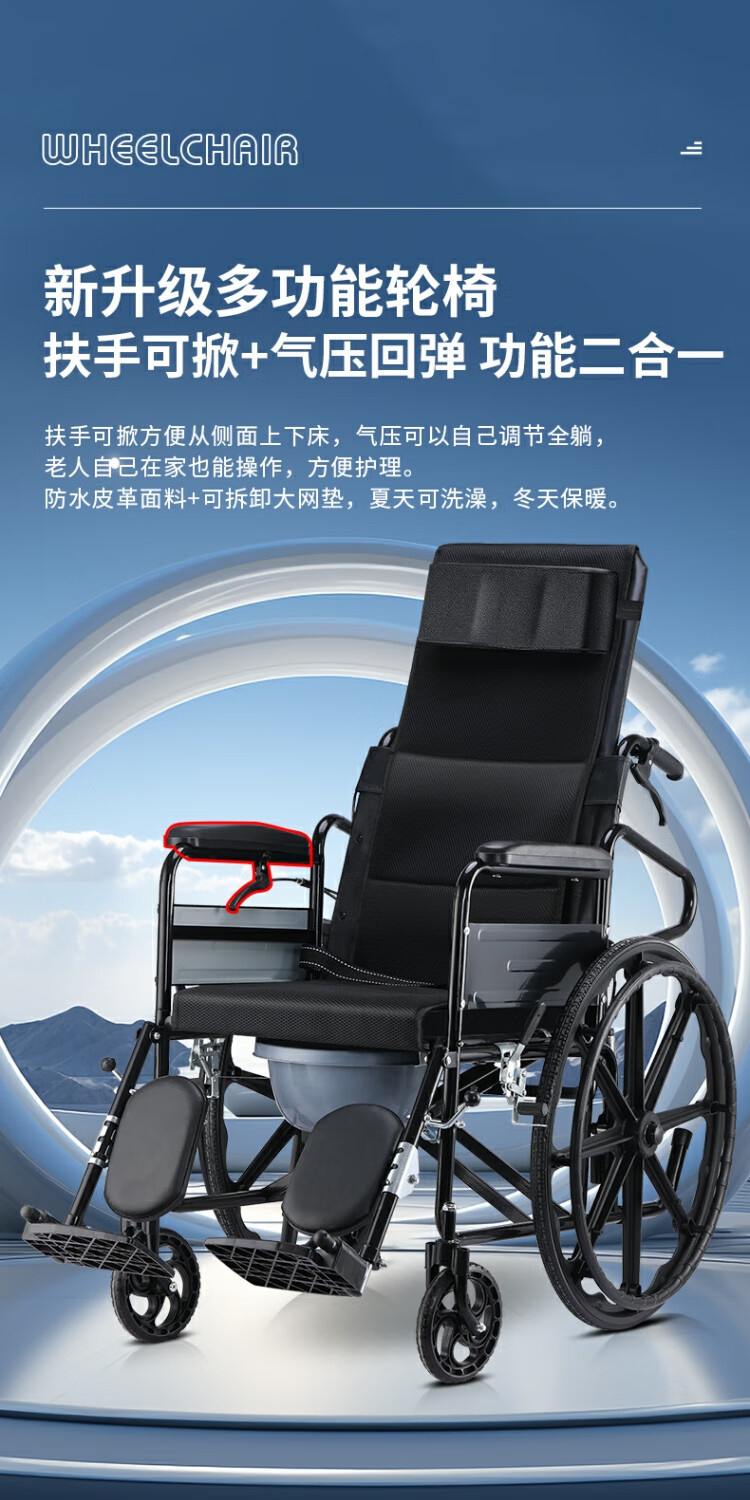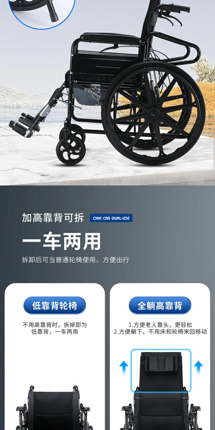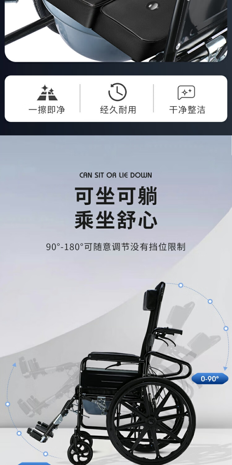 康立普(CANLIPE)轮椅瘫痪老人专用轻便全躺多功能专用出行可躺可洗澡带坐便手推车 【豪华款】扶手可掀防水皮革+可拆蜂网双坐垫一体轮