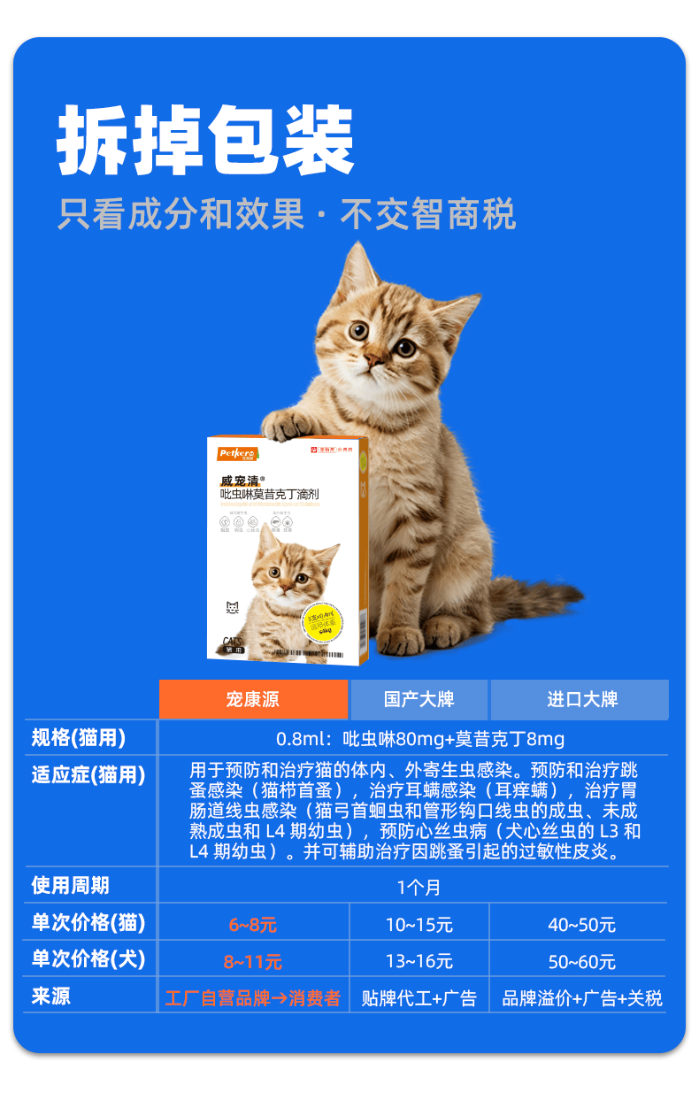 宠康源吡虫啉莫昔克丁滴剂宠物狗狗猫咪驱虫药体内体外合一跳蚤耳螨虫 爆款【猫咪】8-16斤 0.8ml*3支