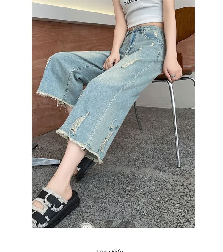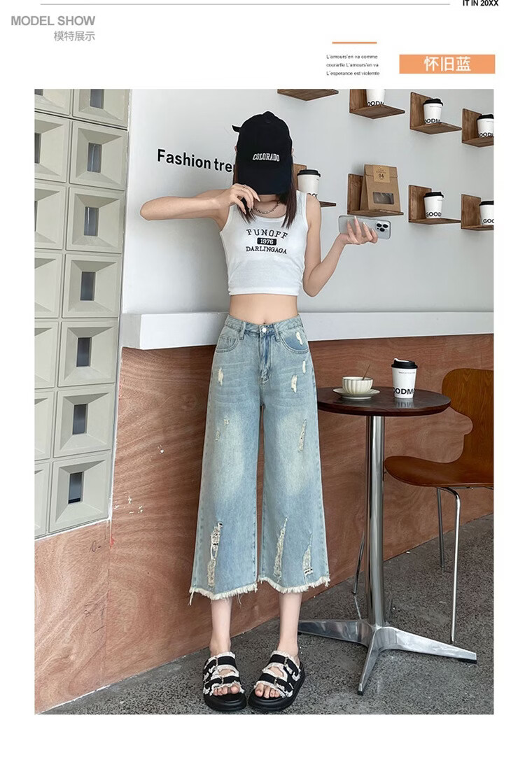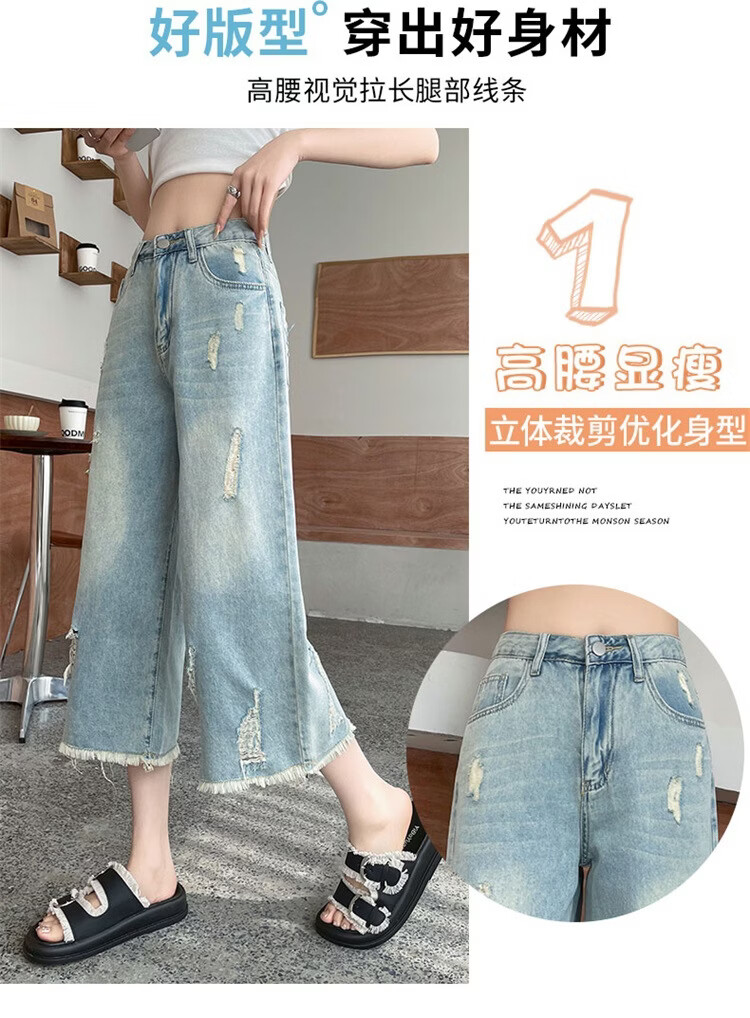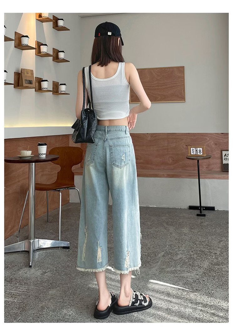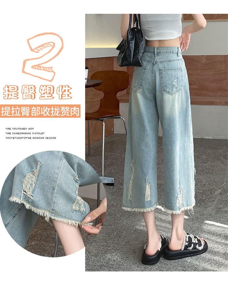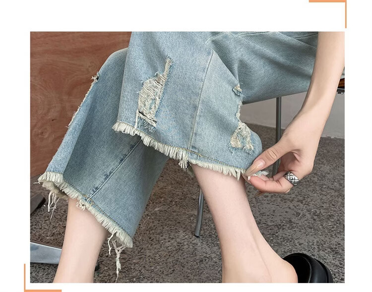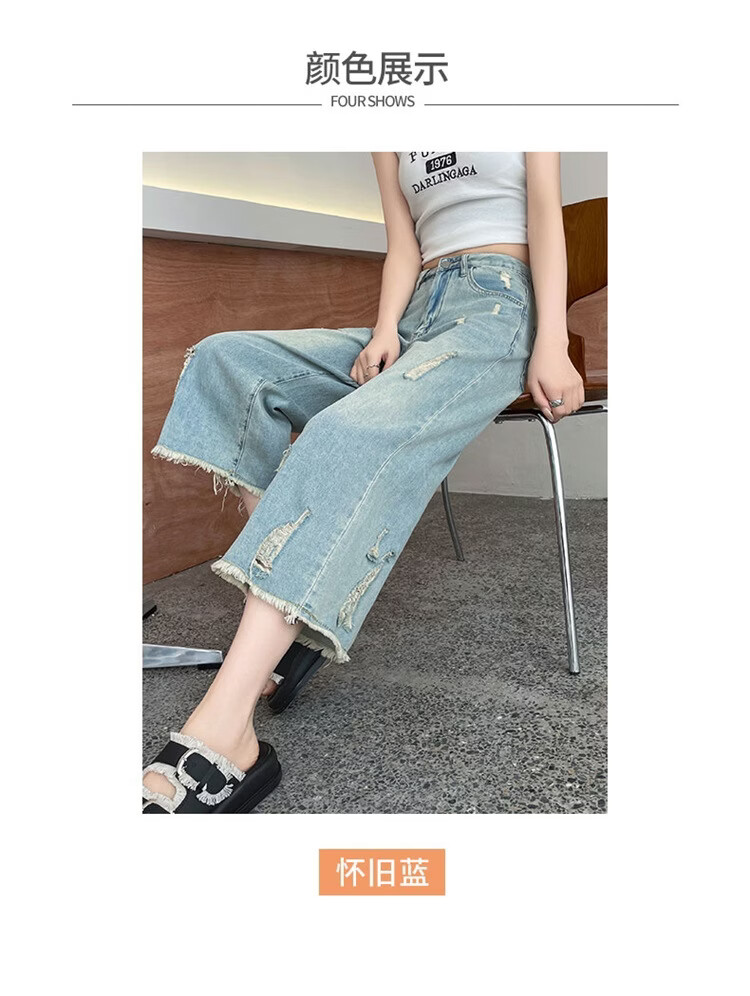 CronetKcnsy破洞牛仔裤女夏季宽松薄款小个子七分裤毛边设计感直筒阔腿裤女潮 复古蓝 4XL 推荐162-180斤