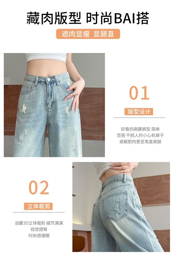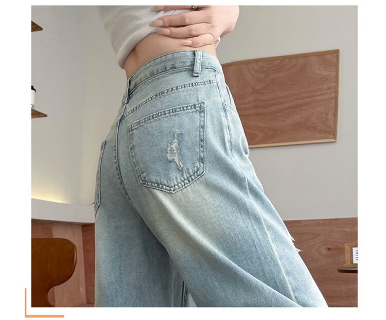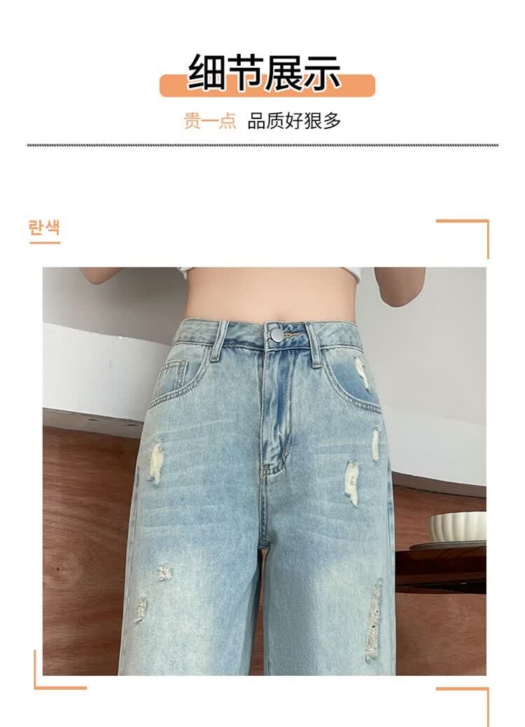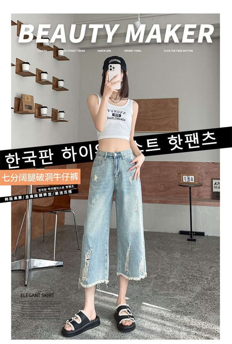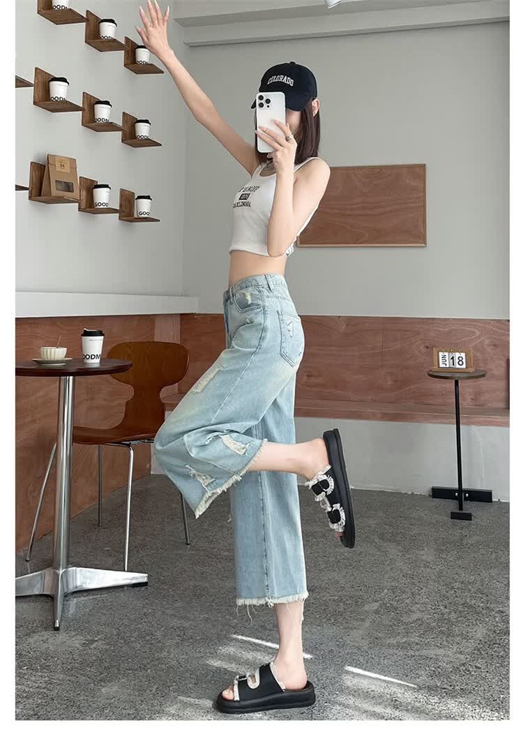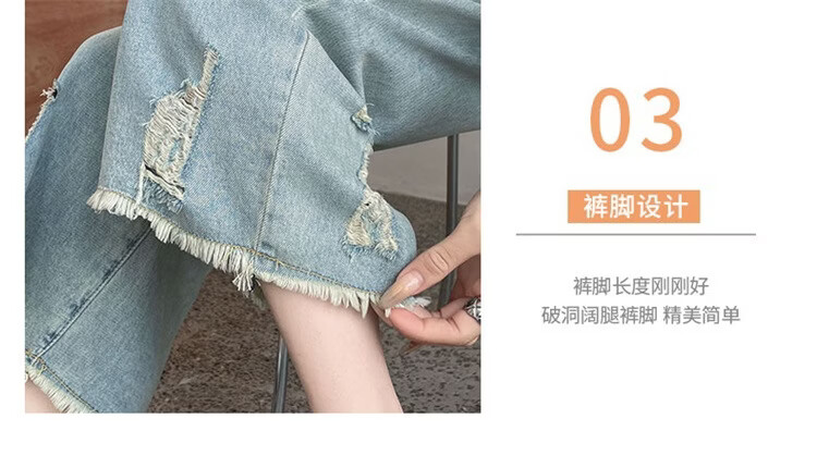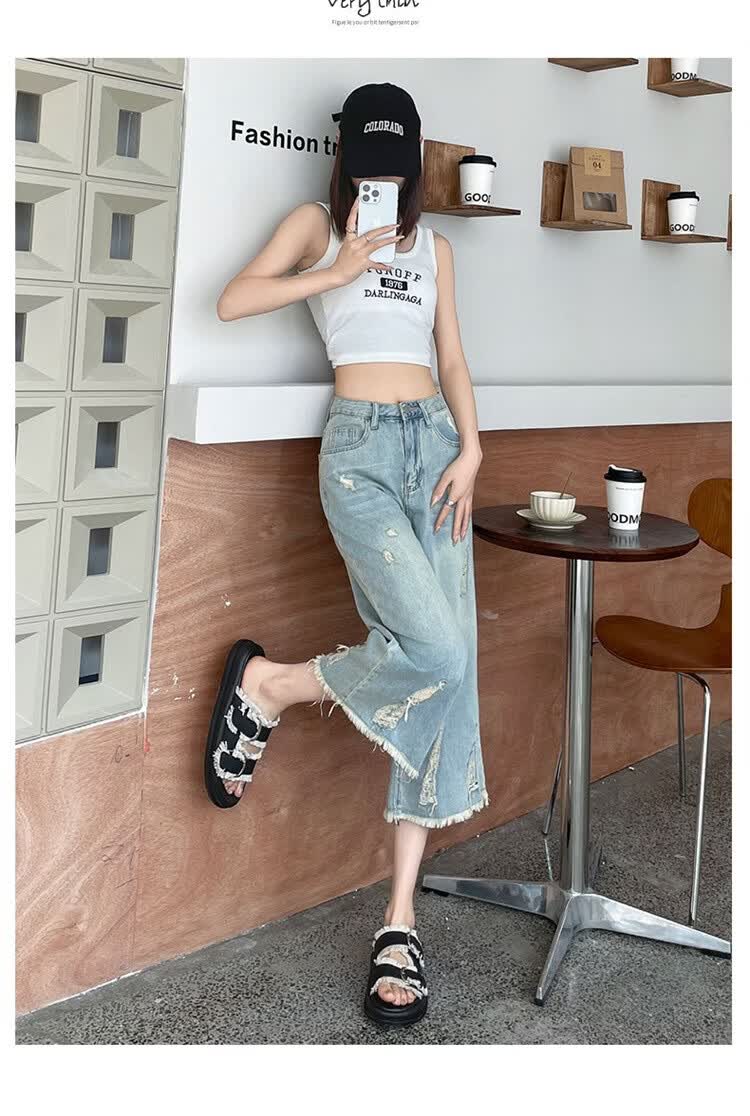CronetKcnsy破洞牛仔裤女夏季宽松薄款小个子七分裤毛边设计感直筒阔腿裤女潮 复古蓝 4XL 推荐162-180斤
