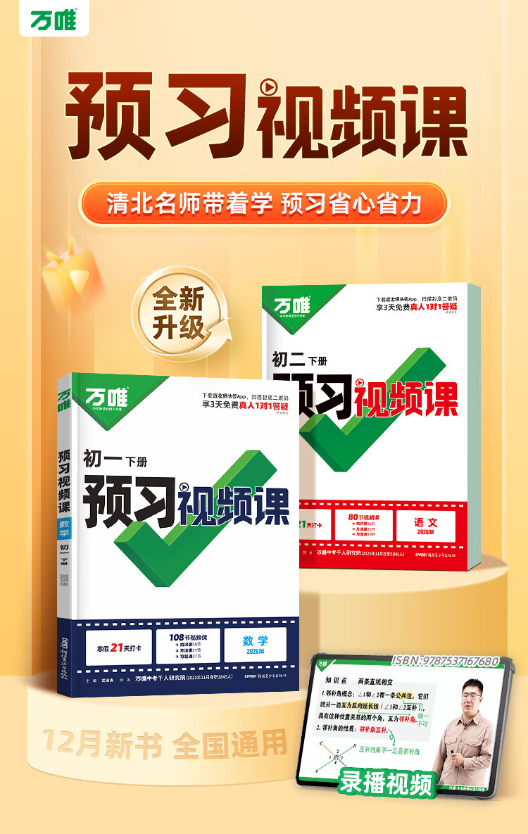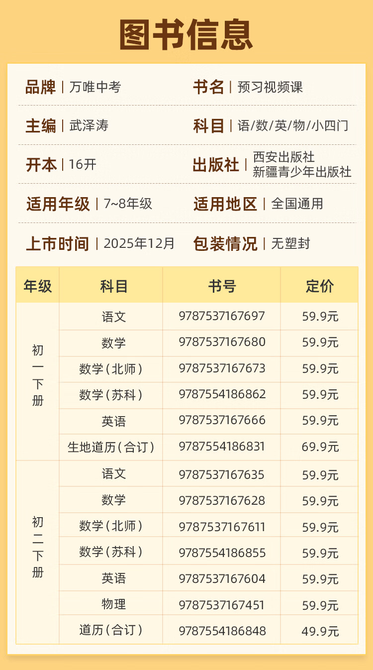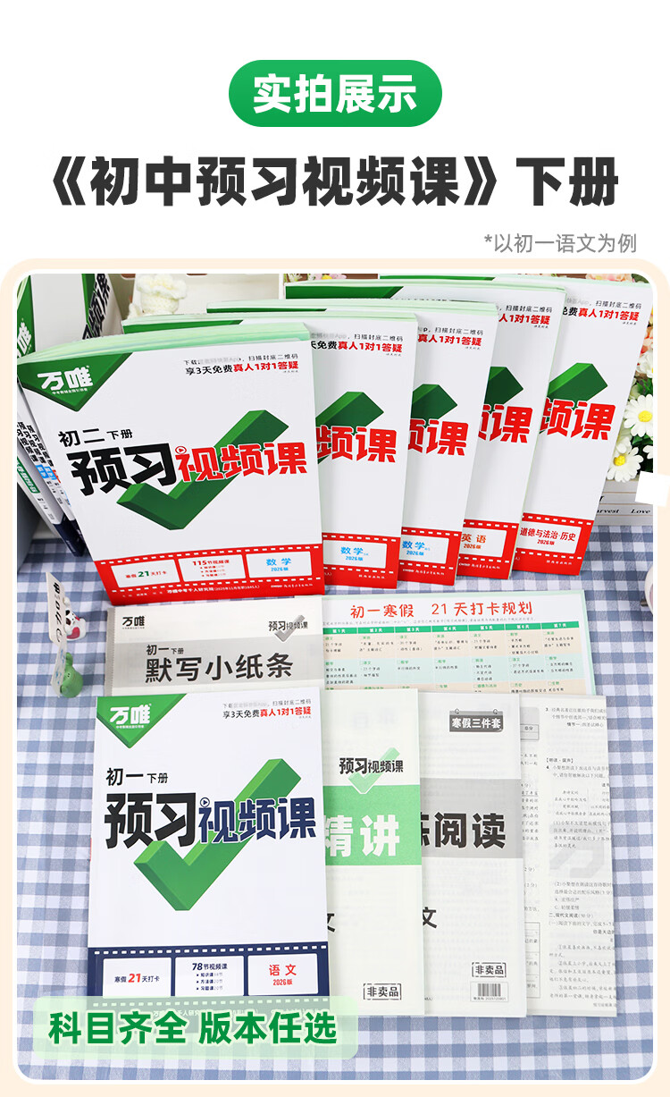 2026春万唯中考初中预习视频课初一初二七八年级下册语文数学英语物理小四门下册知识万唯官方旗舰店寒假预习资料人教版万维教育 7年级下册 【语数英生地道历】7科4本