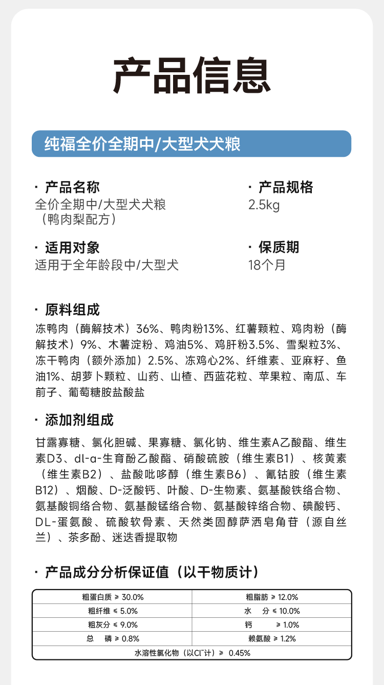 纯福中大型犬通用酶解鸭肉梨狗粮幼犬成犬冻干专用粮 中大型犬(鸭肉)12.5kg【囤货装】
