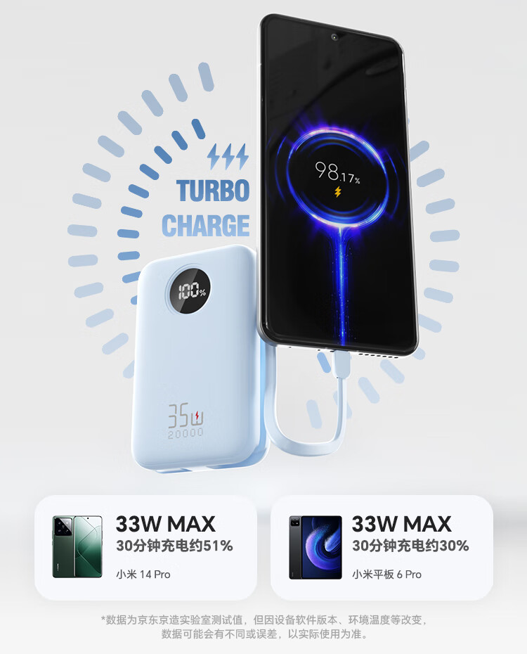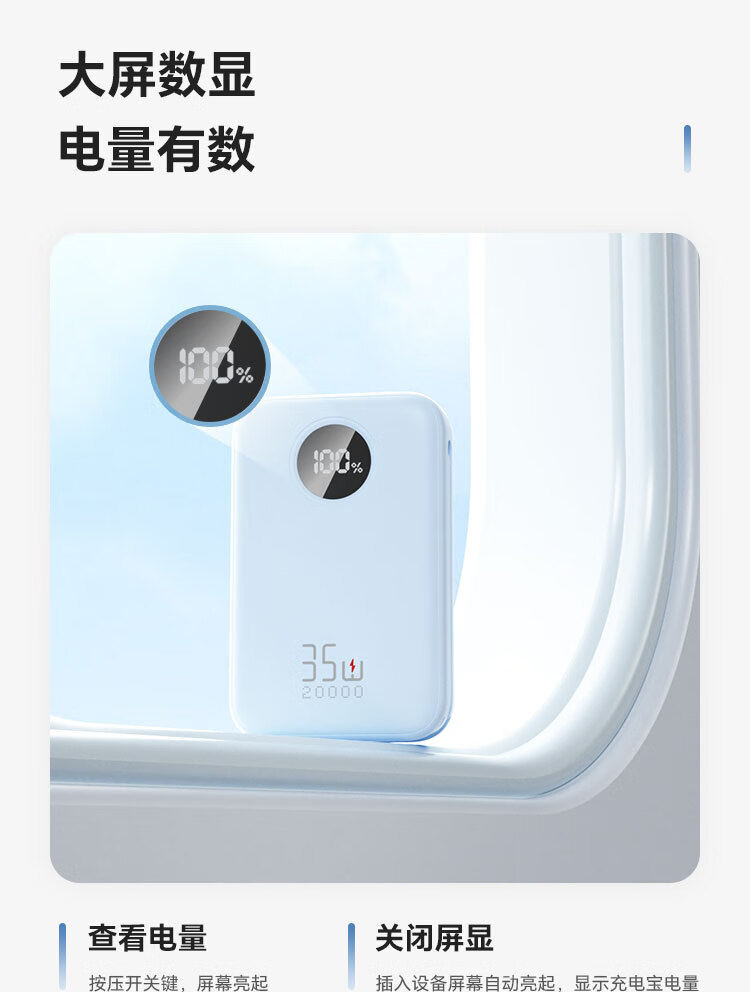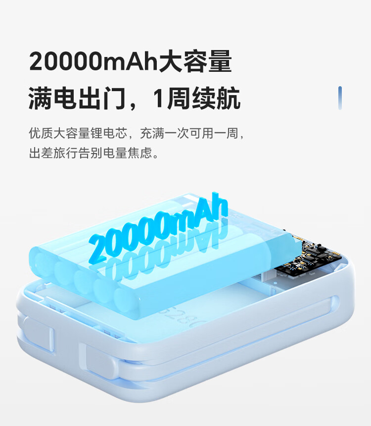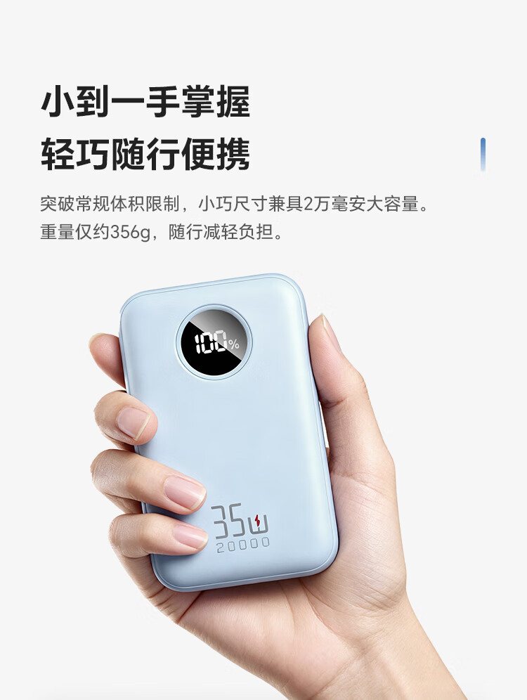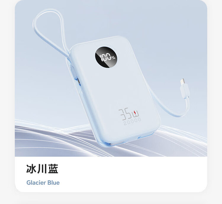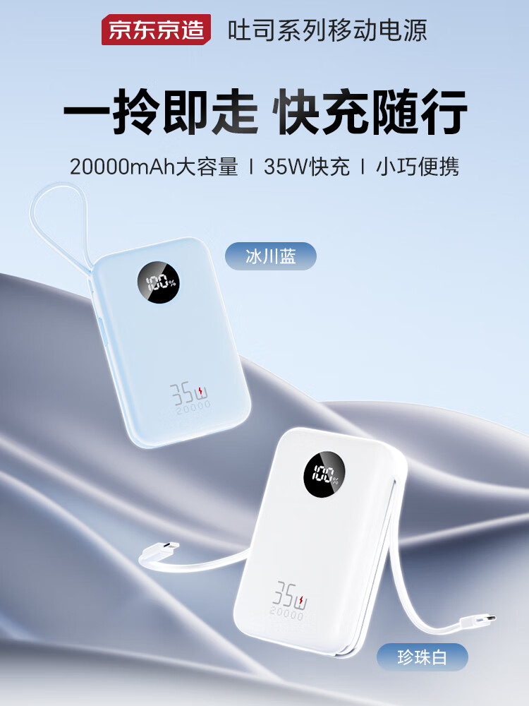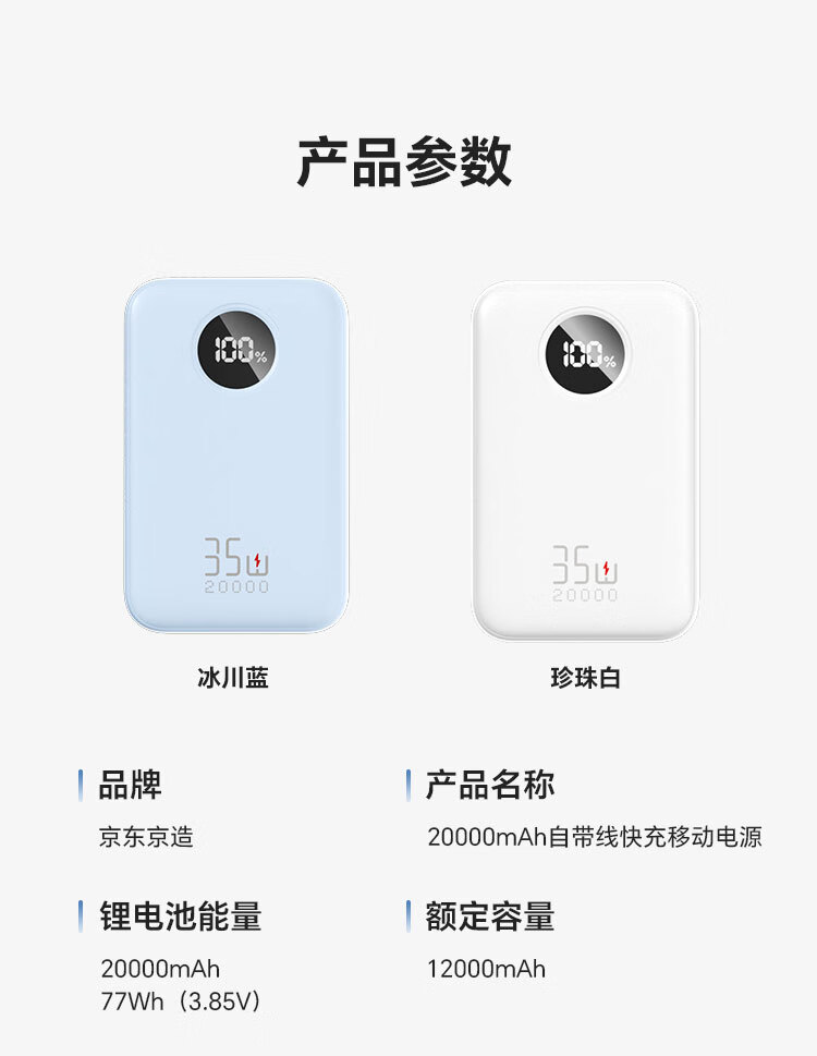 京东京造35W自带线充电宝20000毫安3c认证可上飞机京东自营移动电源适用户外苹果17小米17华为荣耀冰川蓝