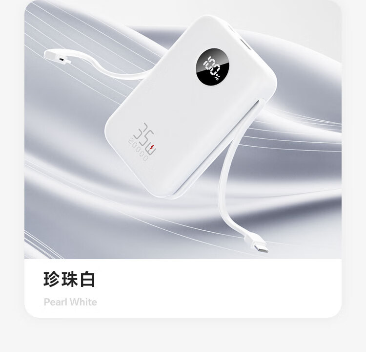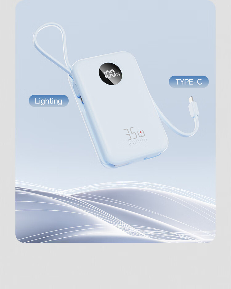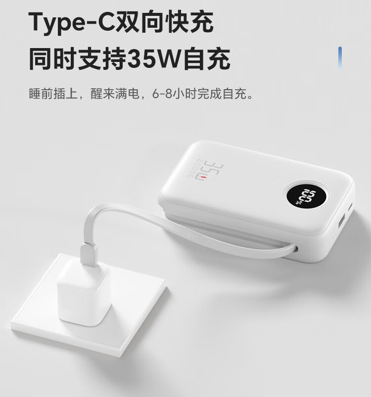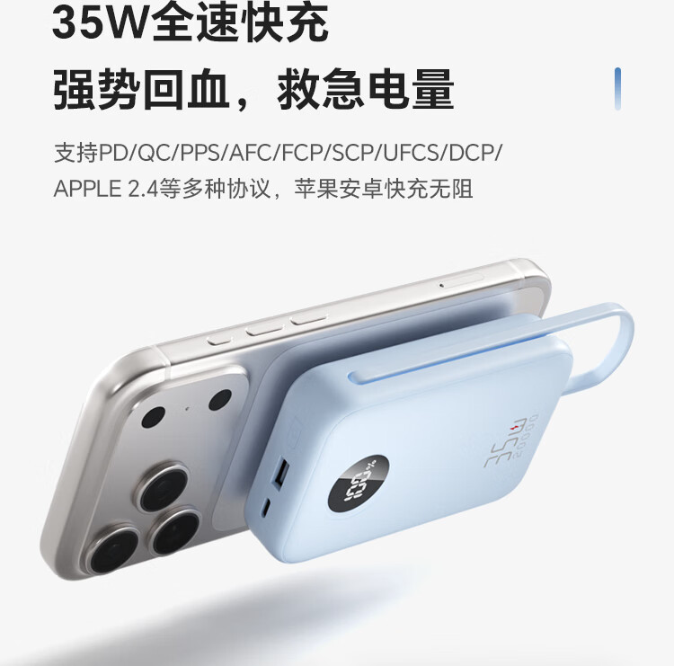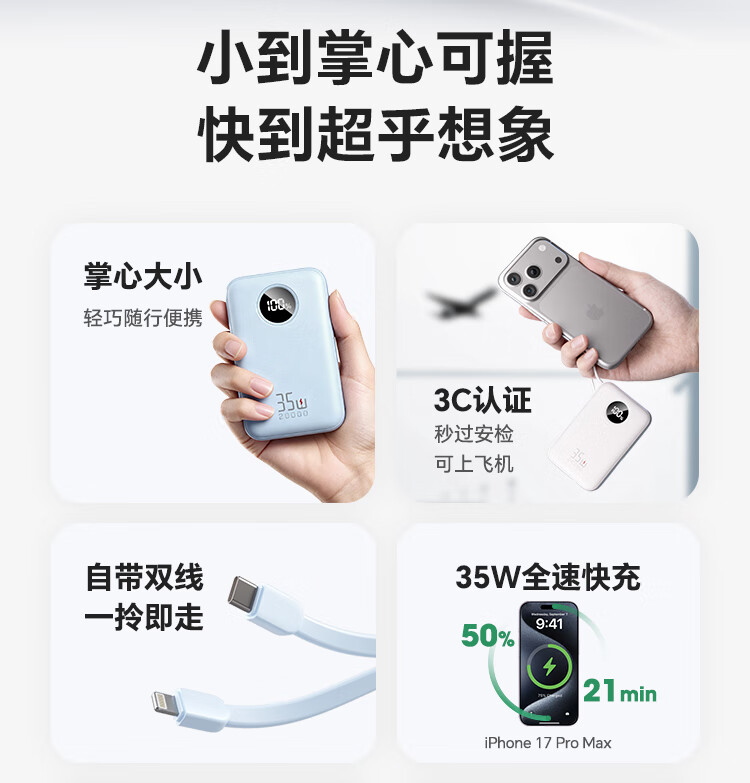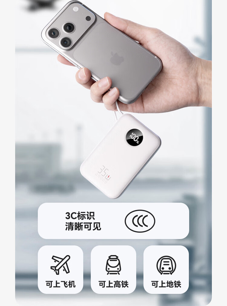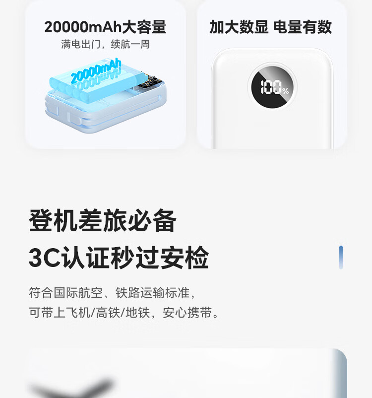 京东京造35W自带线充电宝20000毫安3c认证可上飞机京东自营移动电源适用户外苹果17小米17华为荣耀冰川蓝
