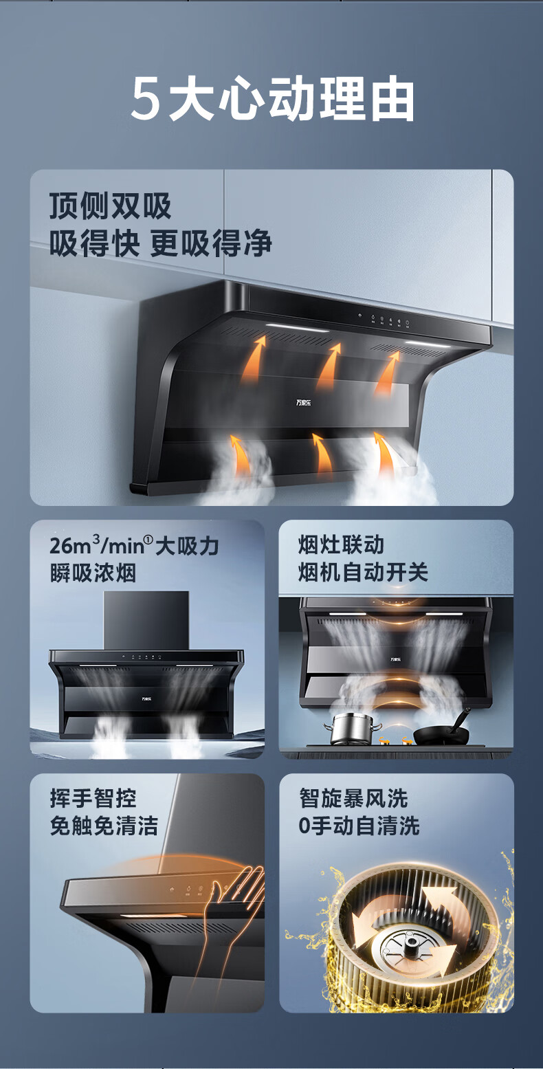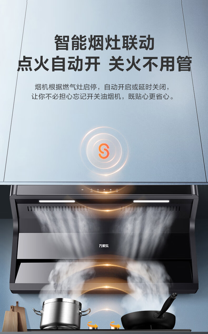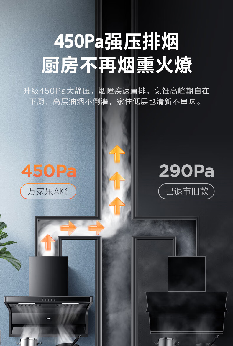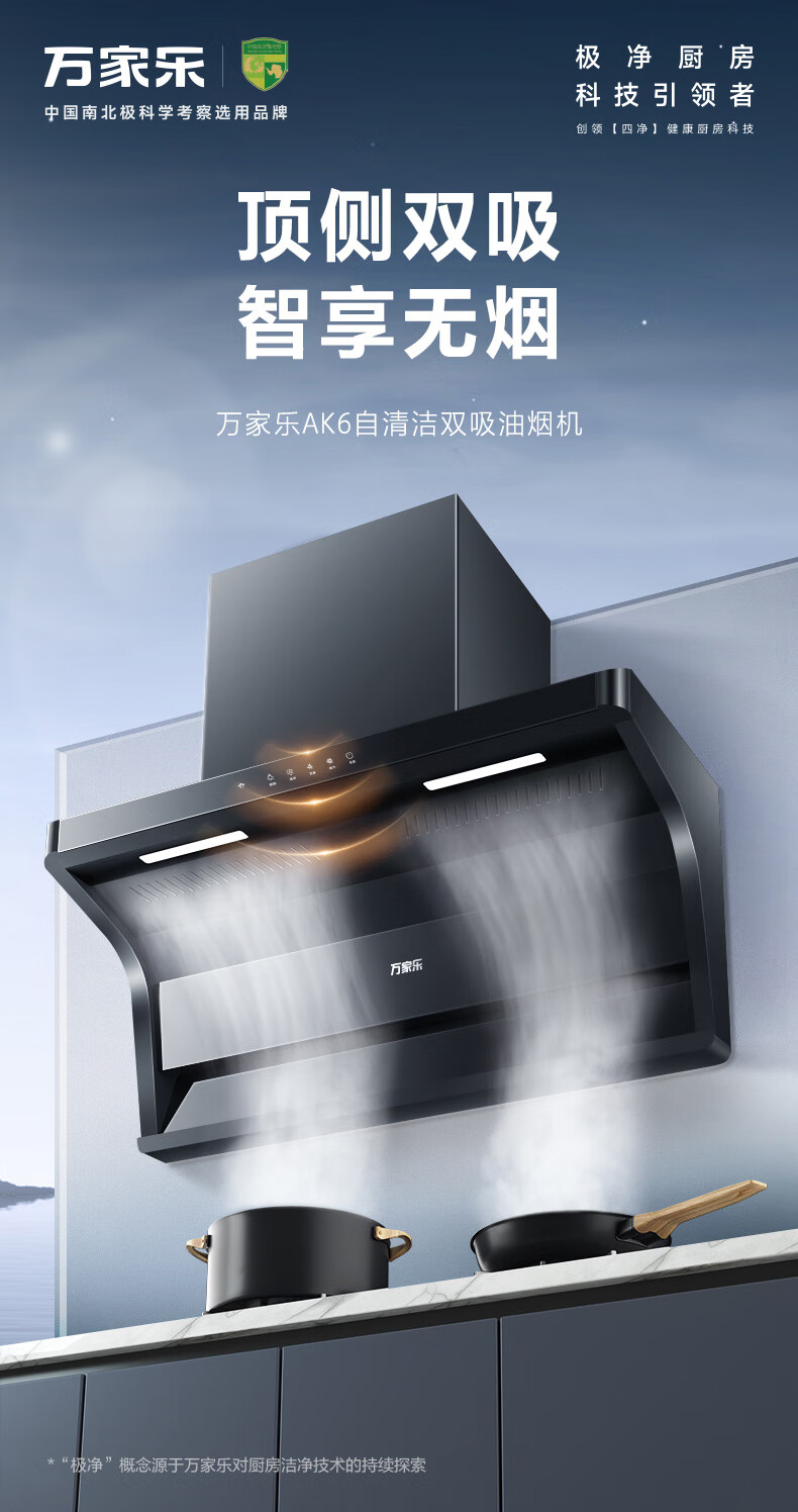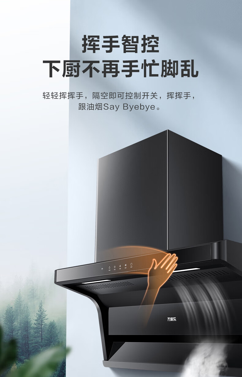 万家乐油烟机【小鲸喜AK6】抽油烟机挥手智控 26立方爆炒大吸力顶侧双吸不碰头 烟灶联动自清洗吸油烟机