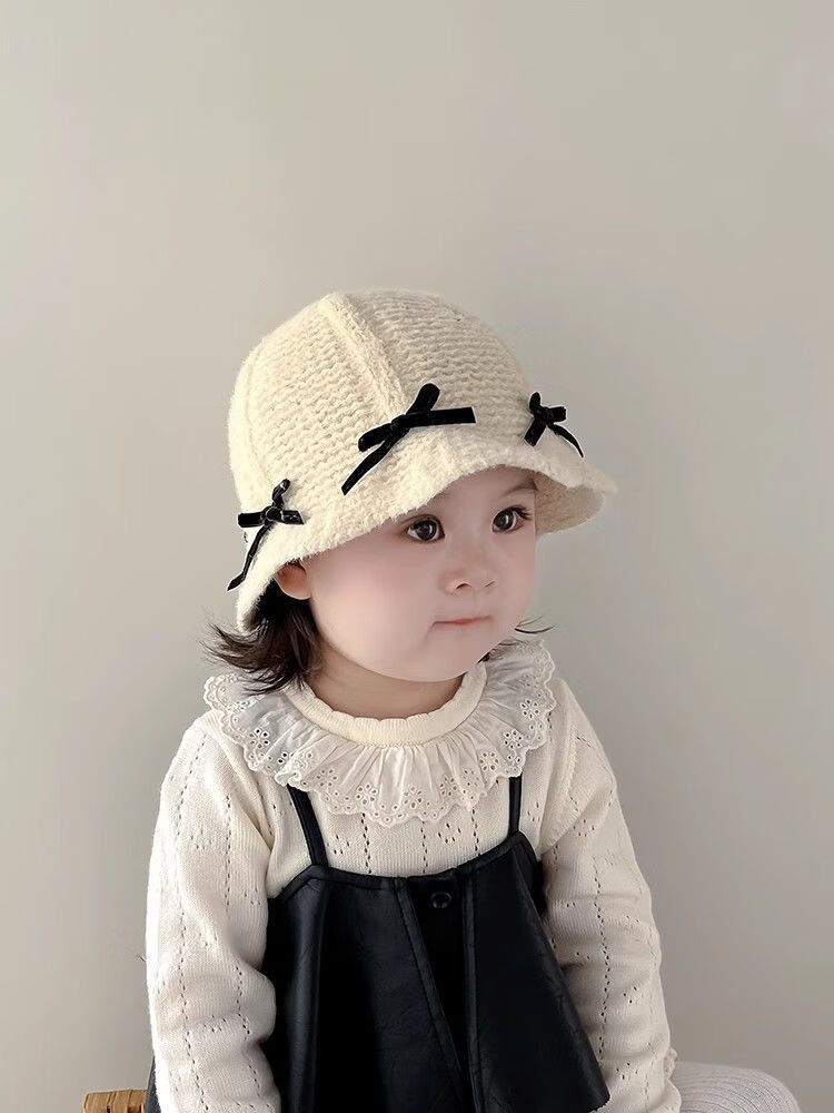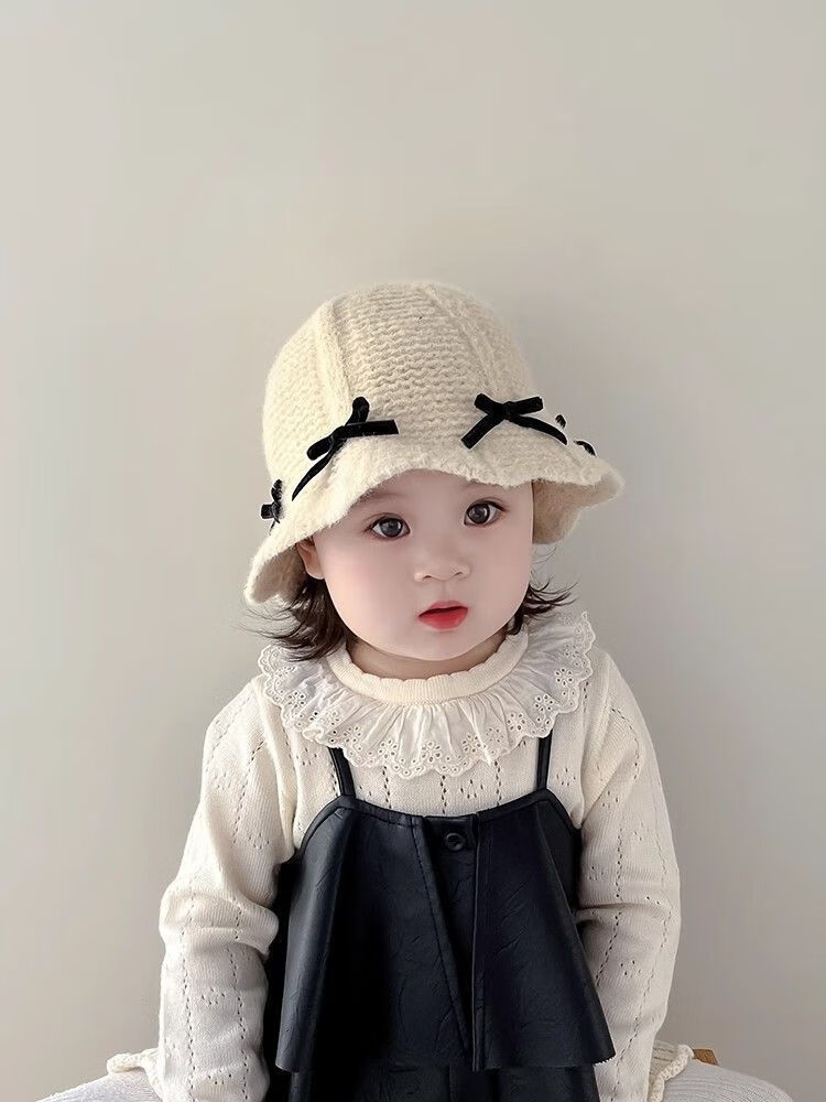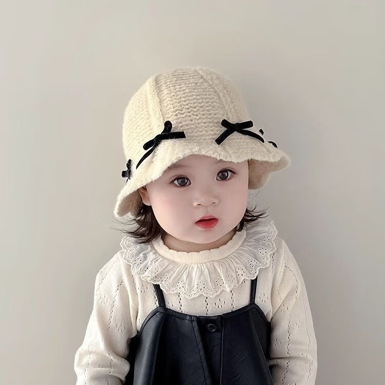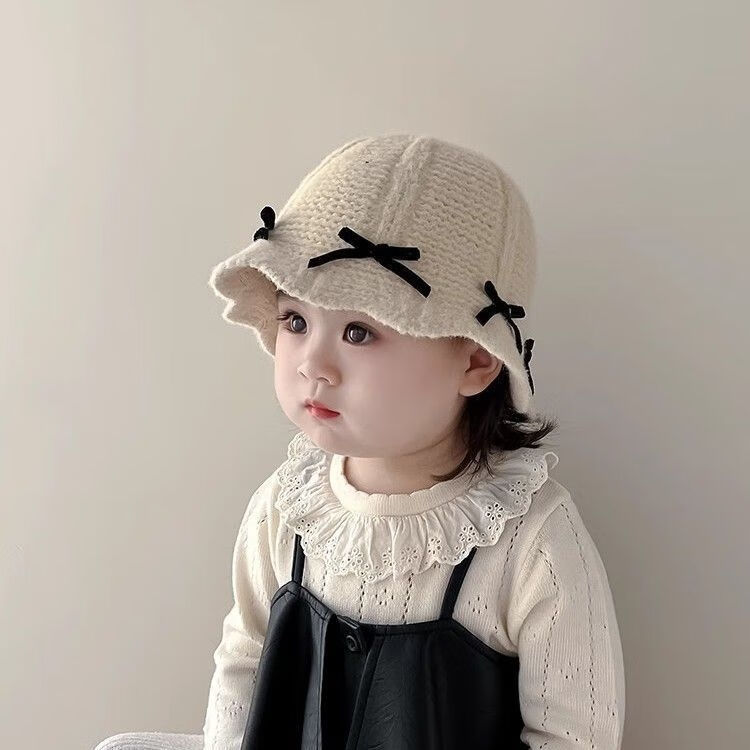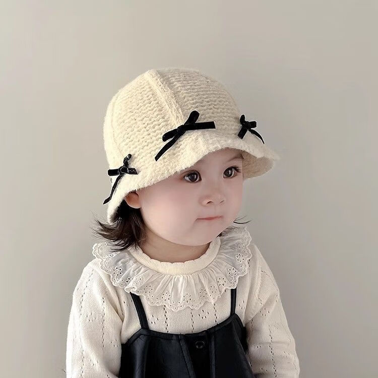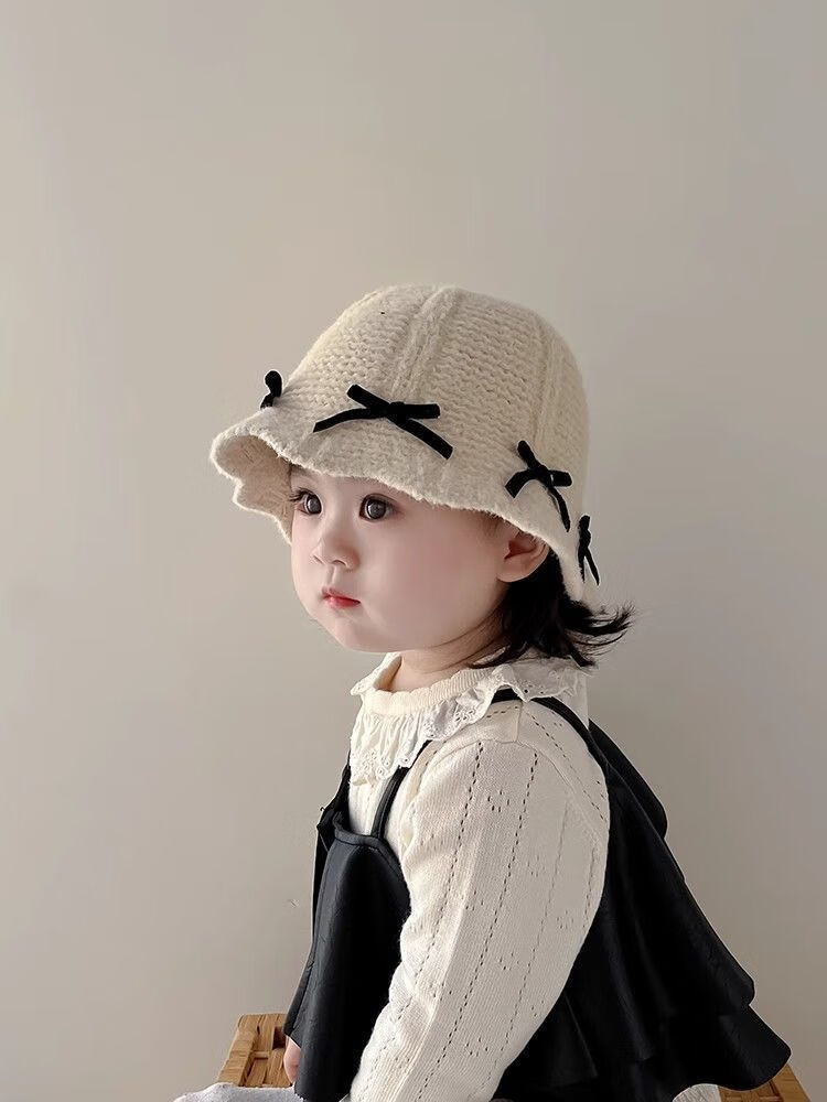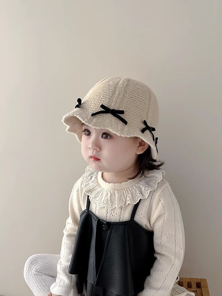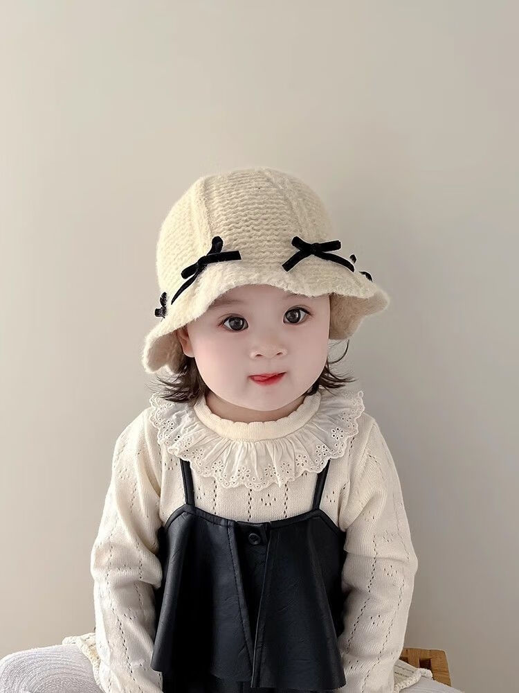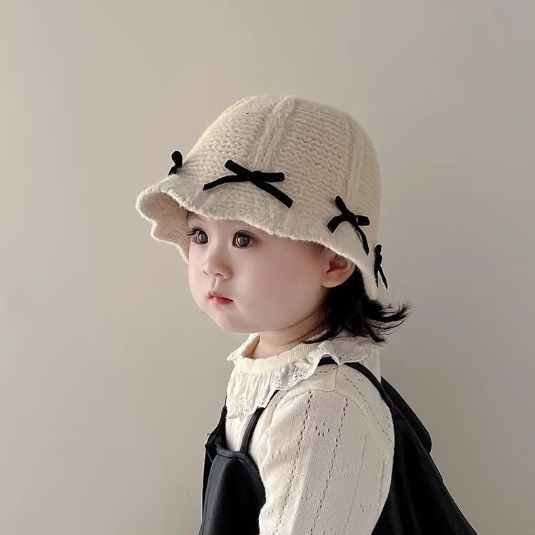 G.duck小黄鸭女童韩国甜美蝴蝶结帽子秋冬季保暖防风针织渔夫帽毛线盆帽 米色-黑色蝴蝶结款毛线渔夫帽 建议年龄18个月-3岁【48-50cm】