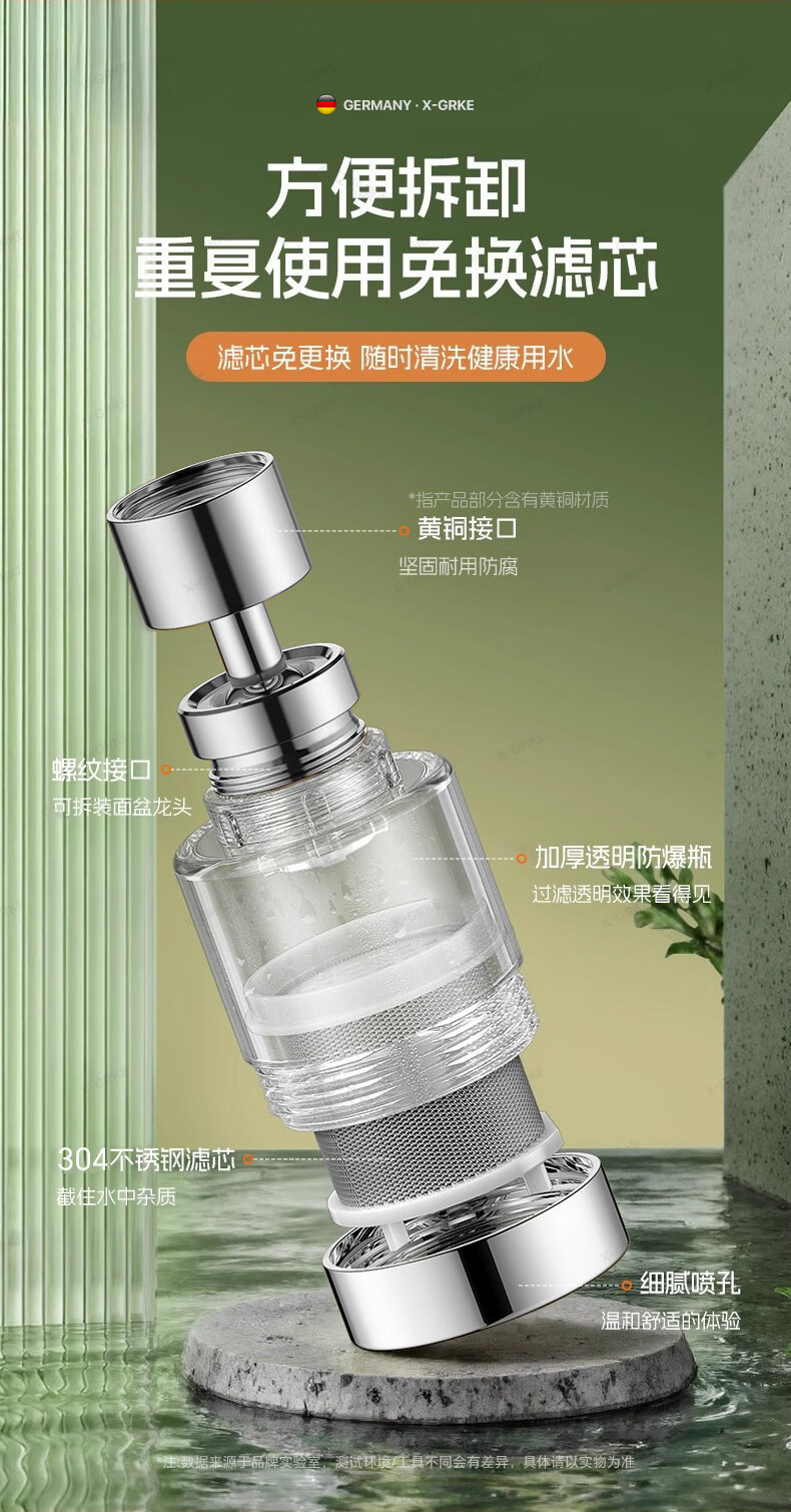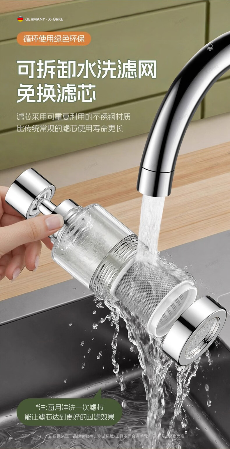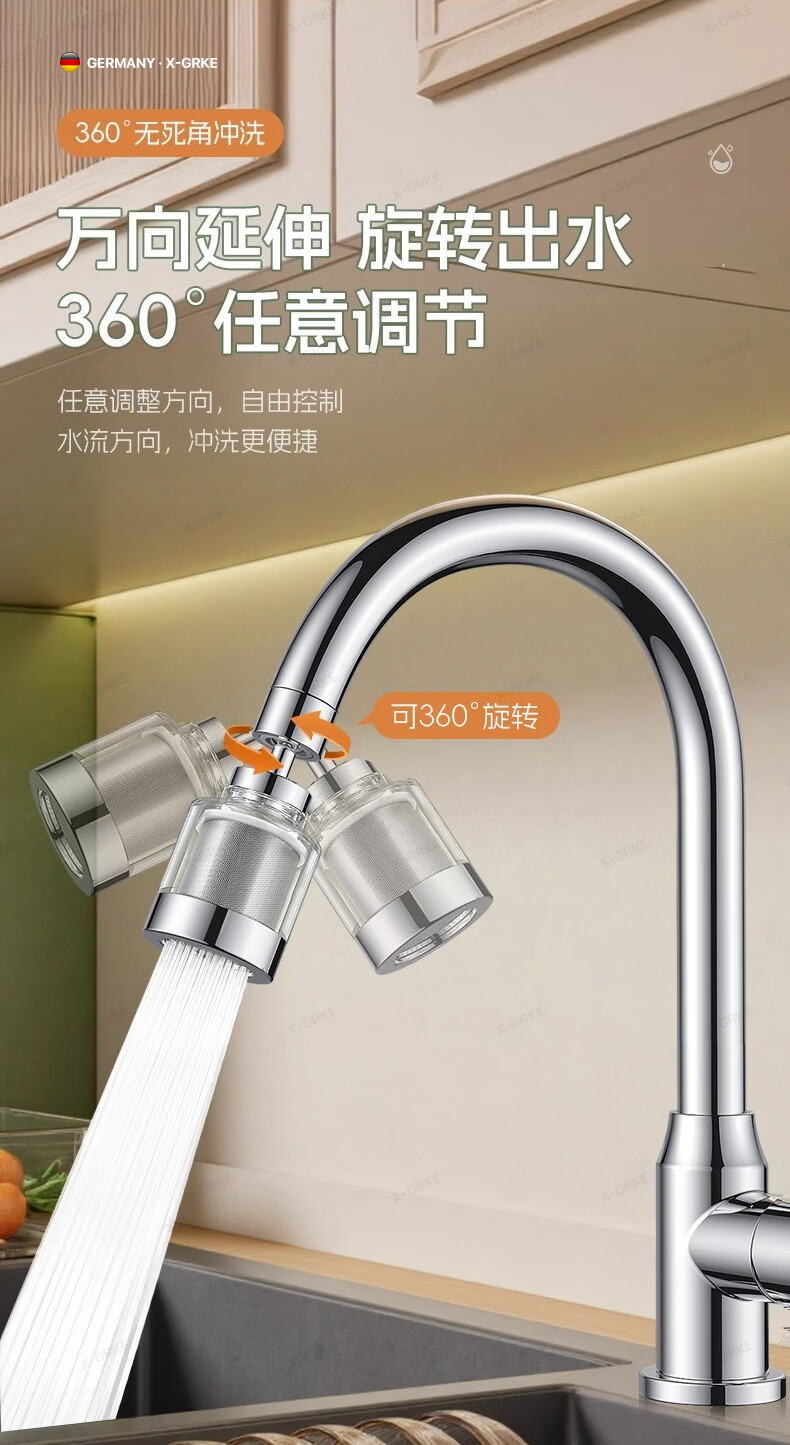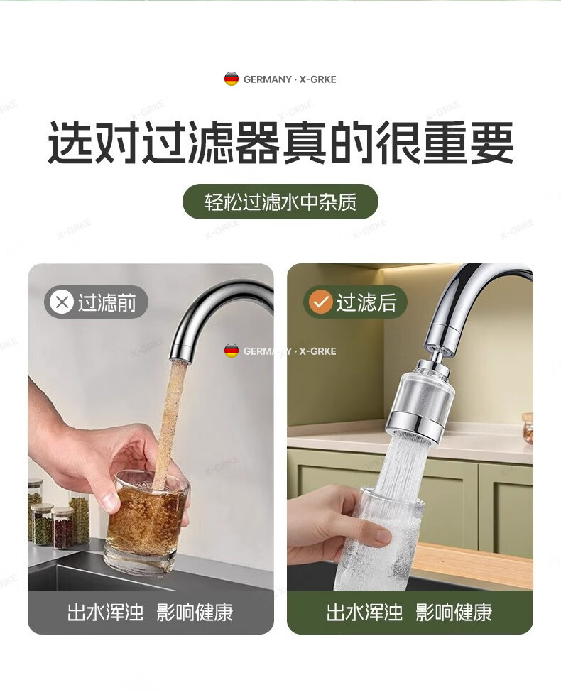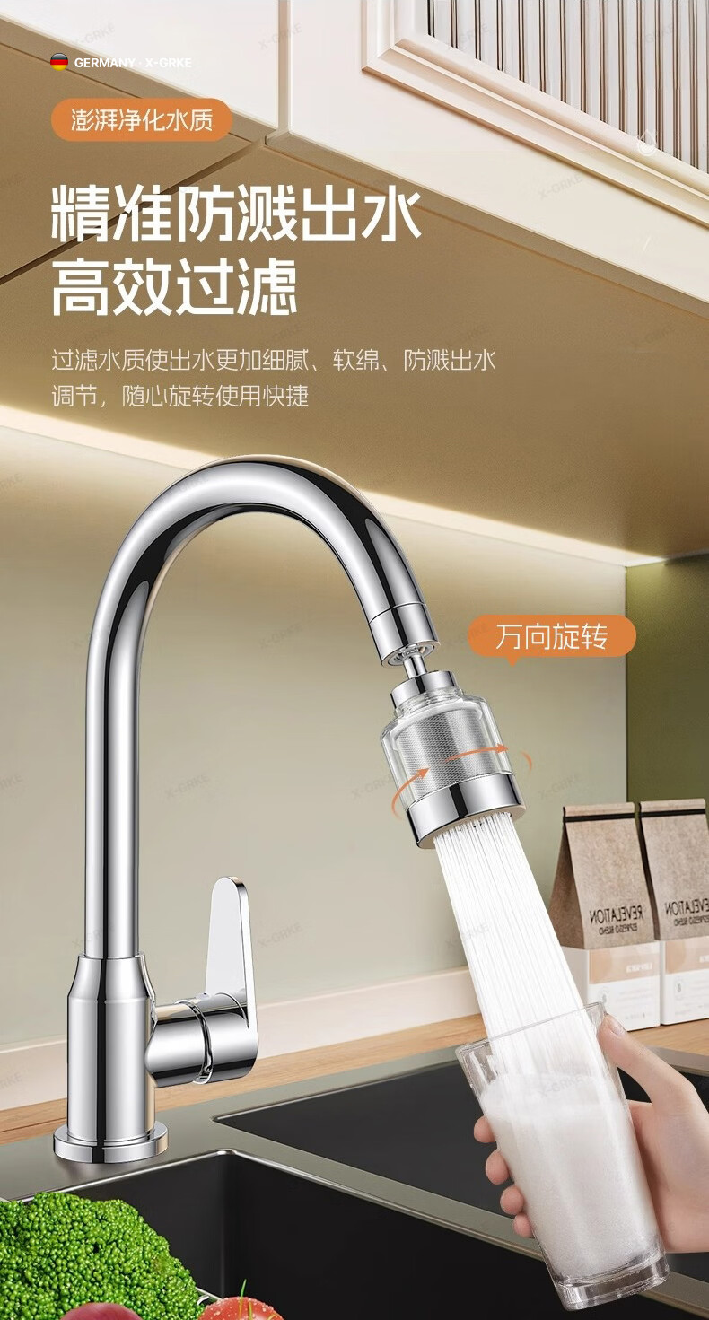 X-GRKE【德国】厨房水龙头过滤净水器家用自来水龙头延伸器万能防溅接头 全铜接头【304免换滤芯*送转换配件】亮银 万向旋转丨通用安装丨增压防溅