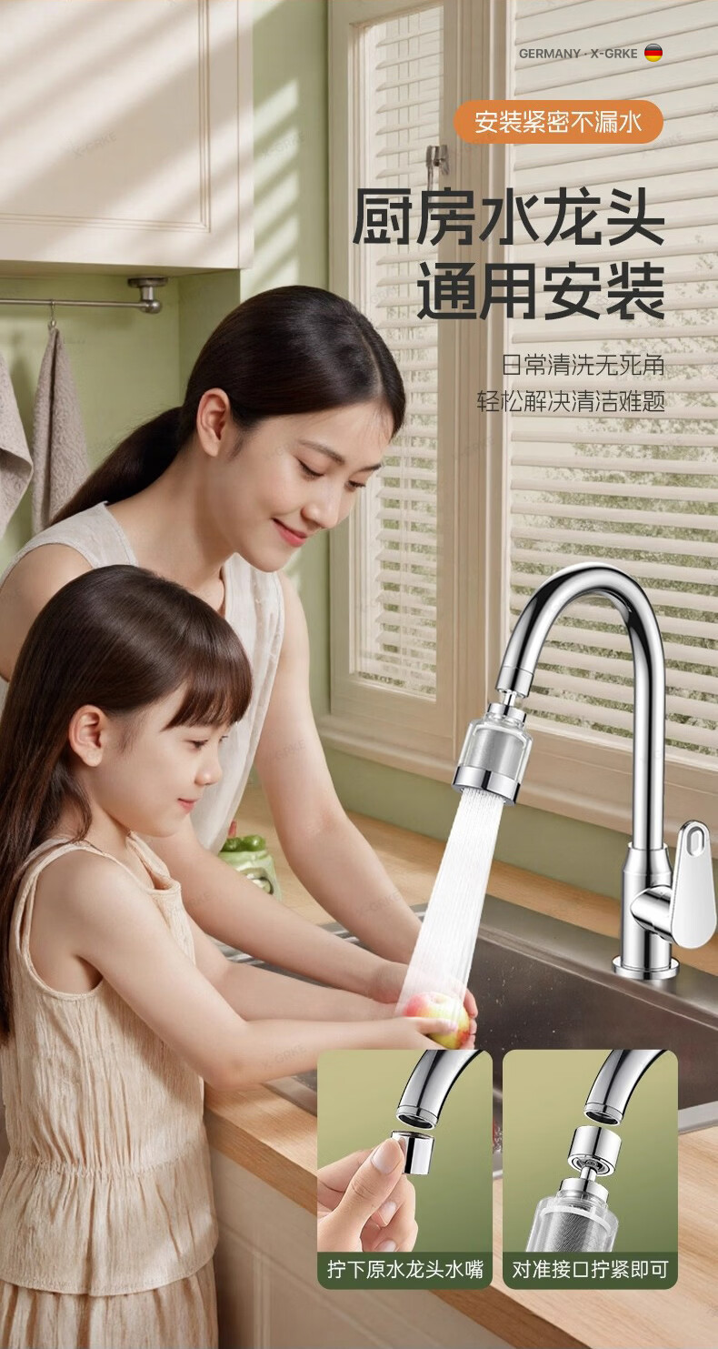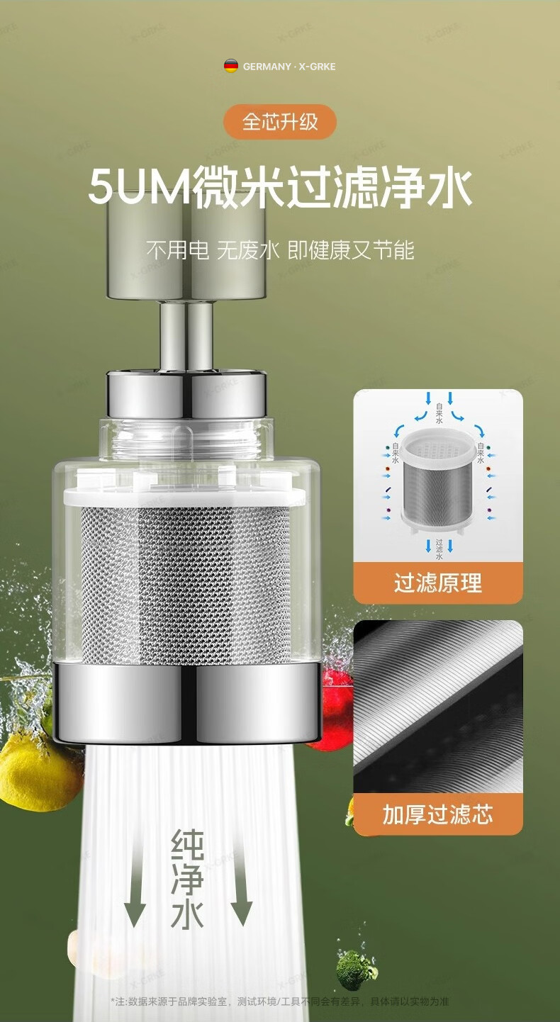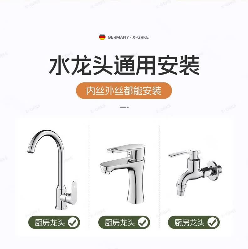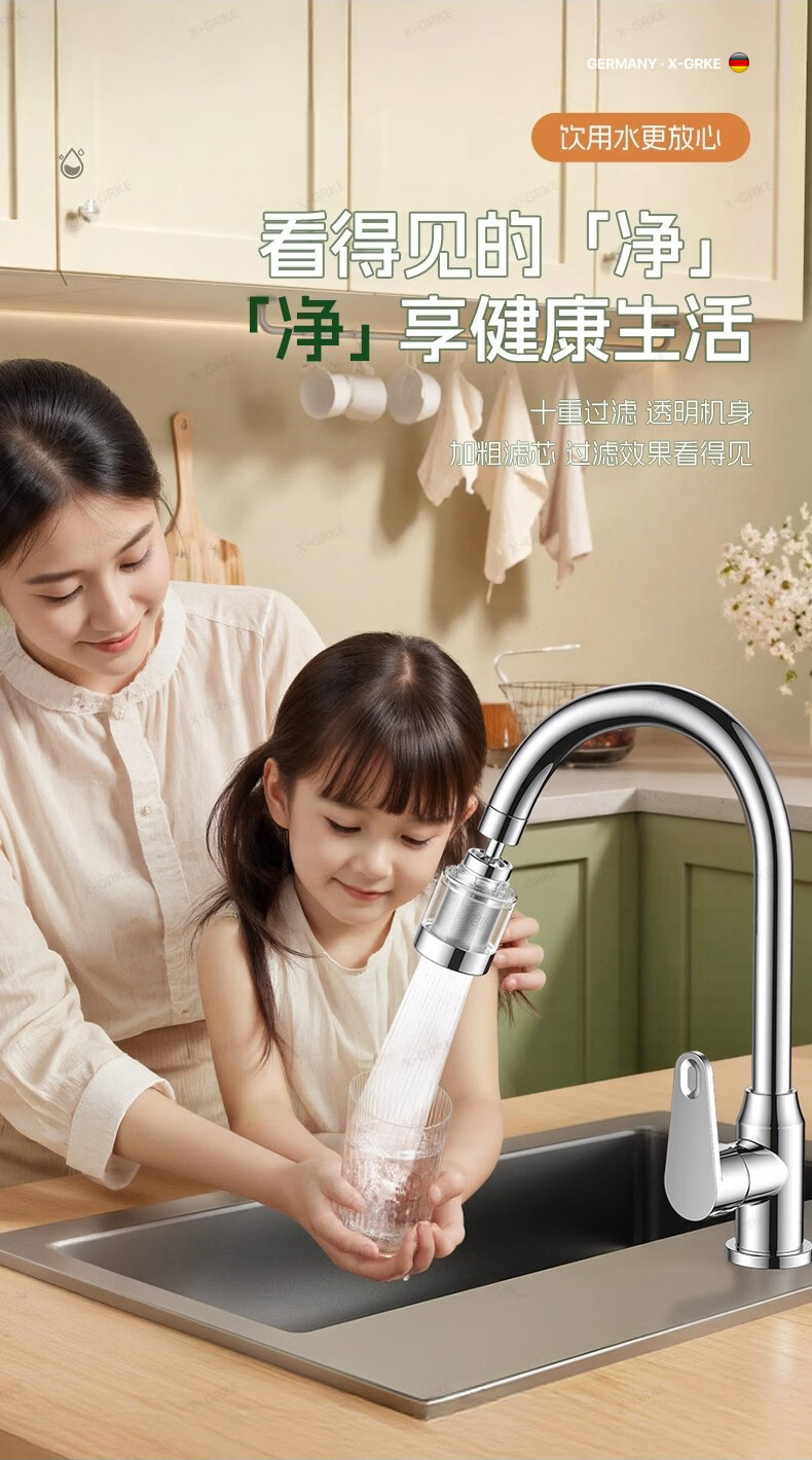 X-GRKE【德国】厨房水龙头过滤净水器家用自来水龙头延伸器万能防溅接头 全铜接头【304免换滤芯*送转换配件】亮银 万向旋转丨通用安装丨增压防溅