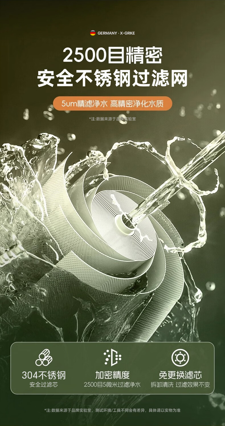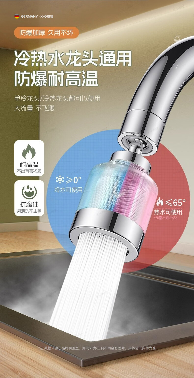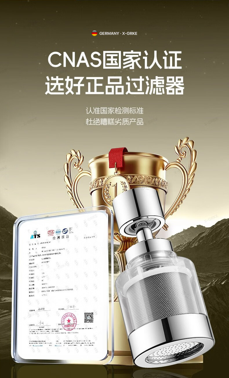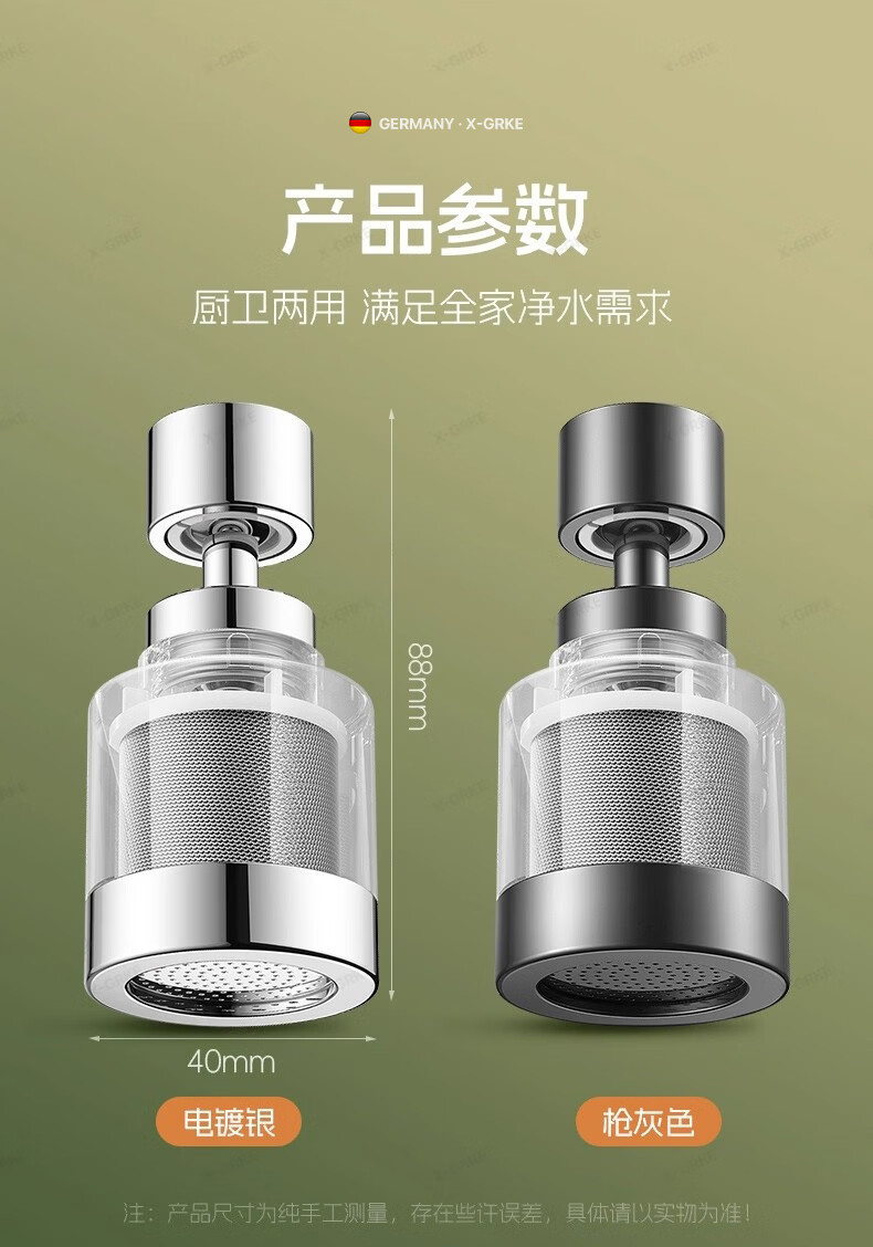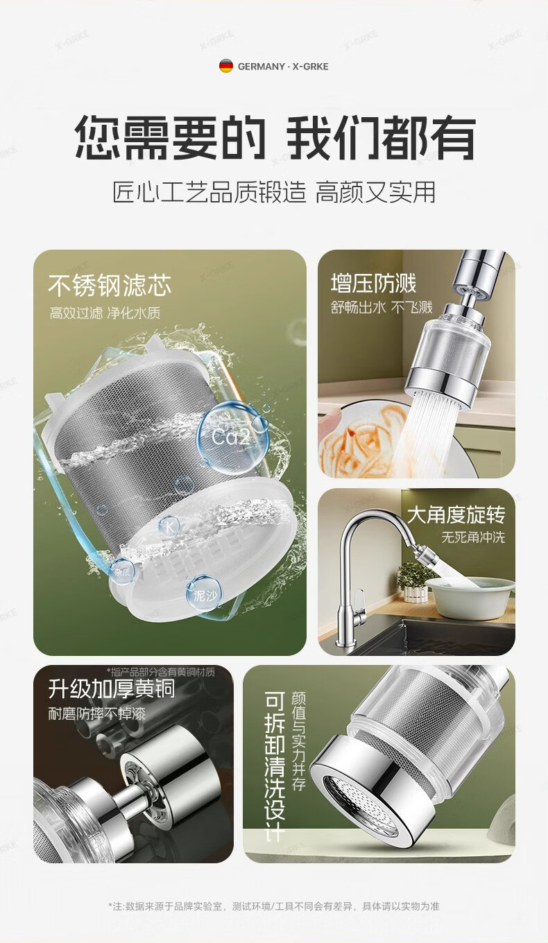 X-GRKE【德国】厨房水龙头过滤净水器家用自来水龙头延伸器万能防溅接头 全铜接头【304免换滤芯*送转换配件】亮银 万向旋转丨通用安装丨增压防溅
