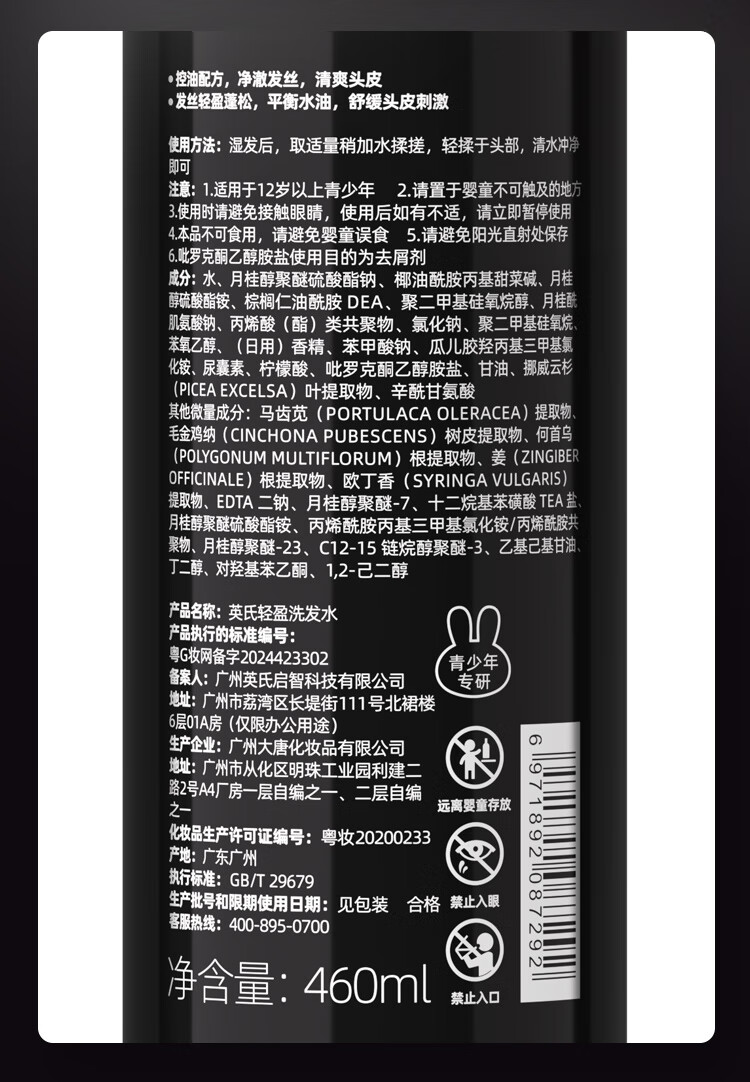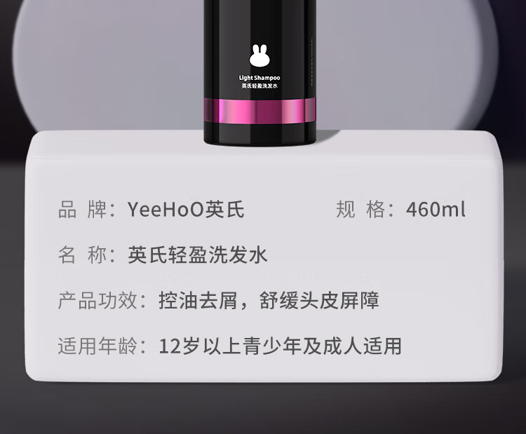 英氏(YEEHOO)黑宝瓶青少年洗发水男女可用控油蓬松去屑洗发沐浴露 【拍2件更划算】蓬松洗发水460ml