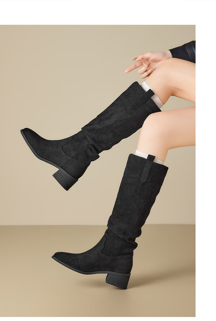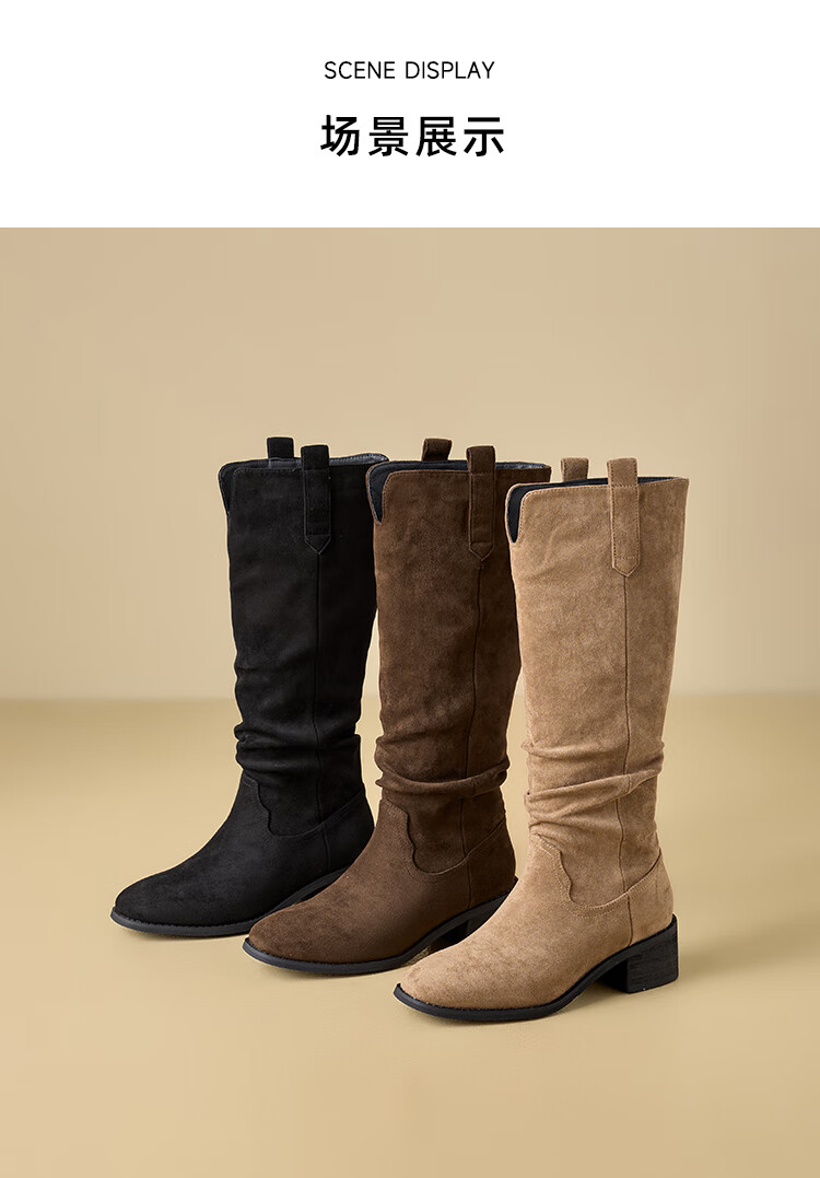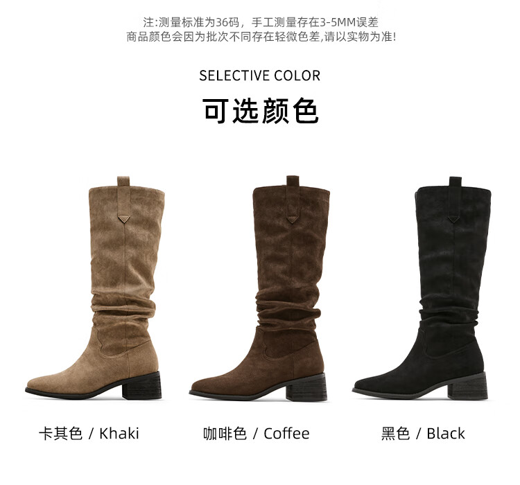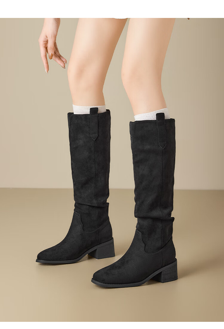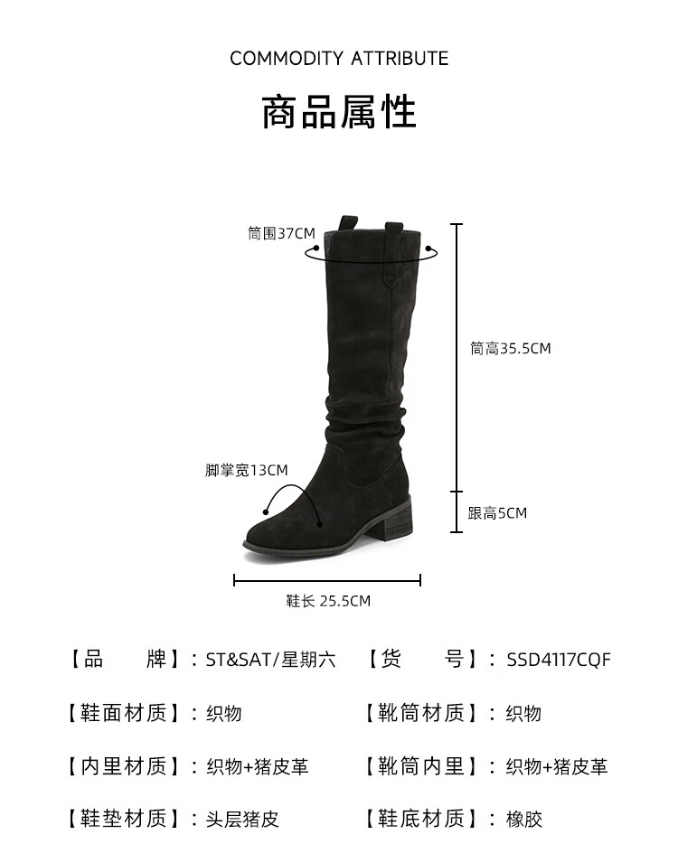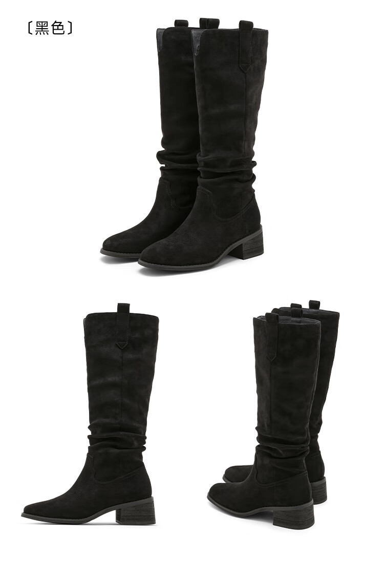星期六粗跟美拉德长筒靴女2025新款秋季尖头显瘦堆堆靴西部骑士靴 黑色 37