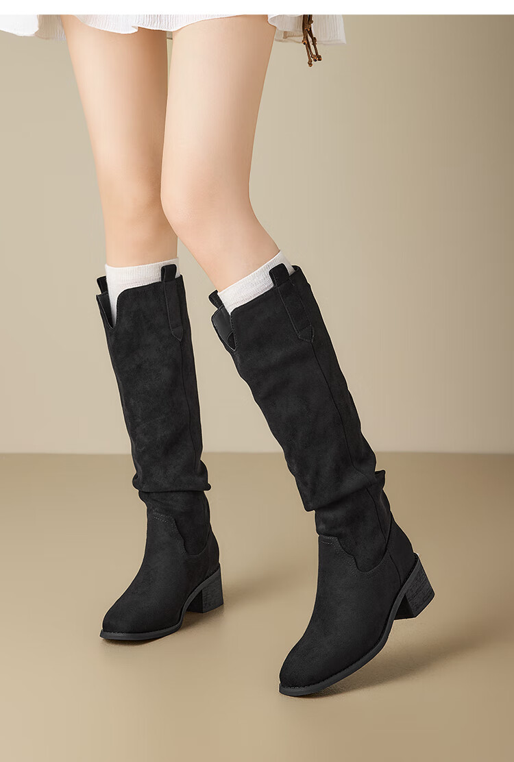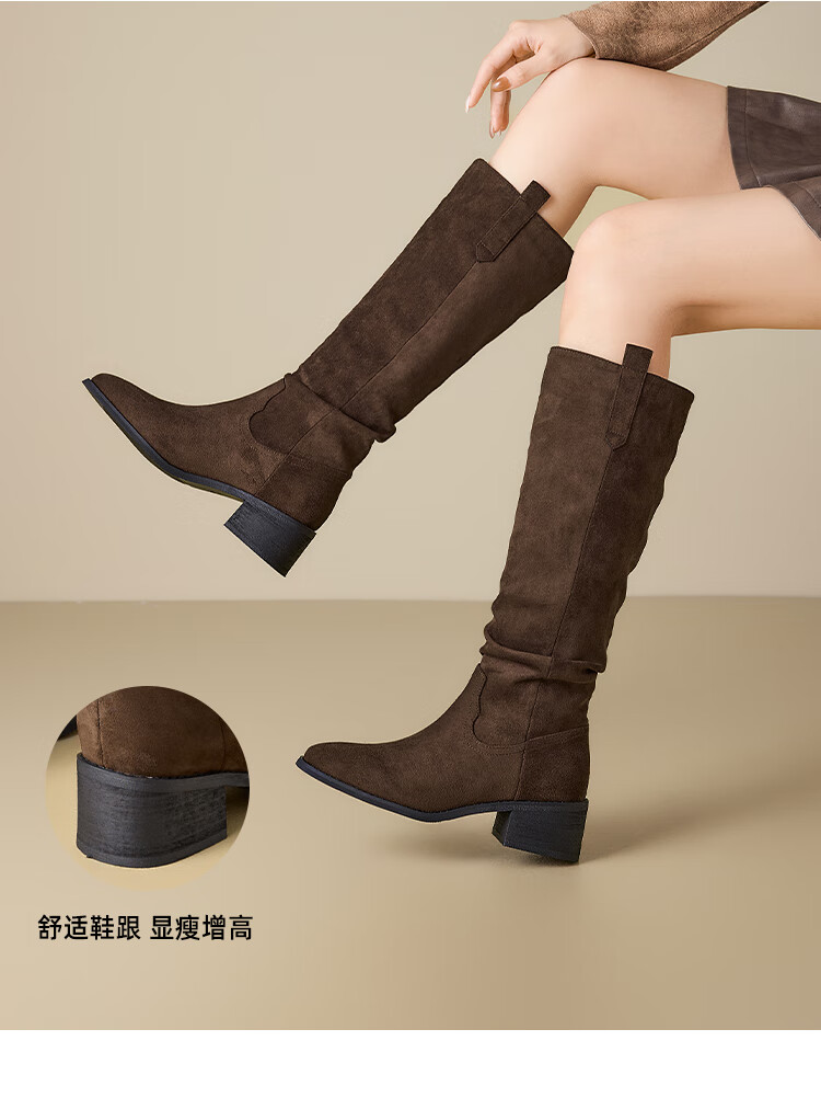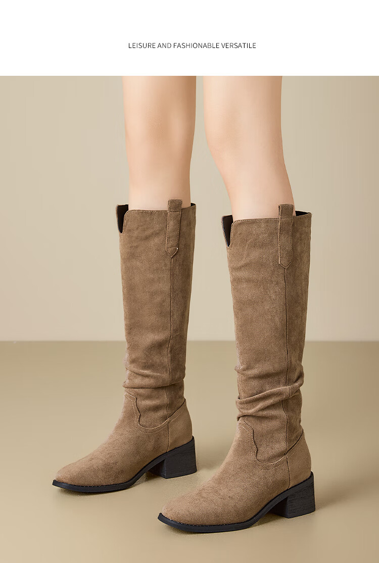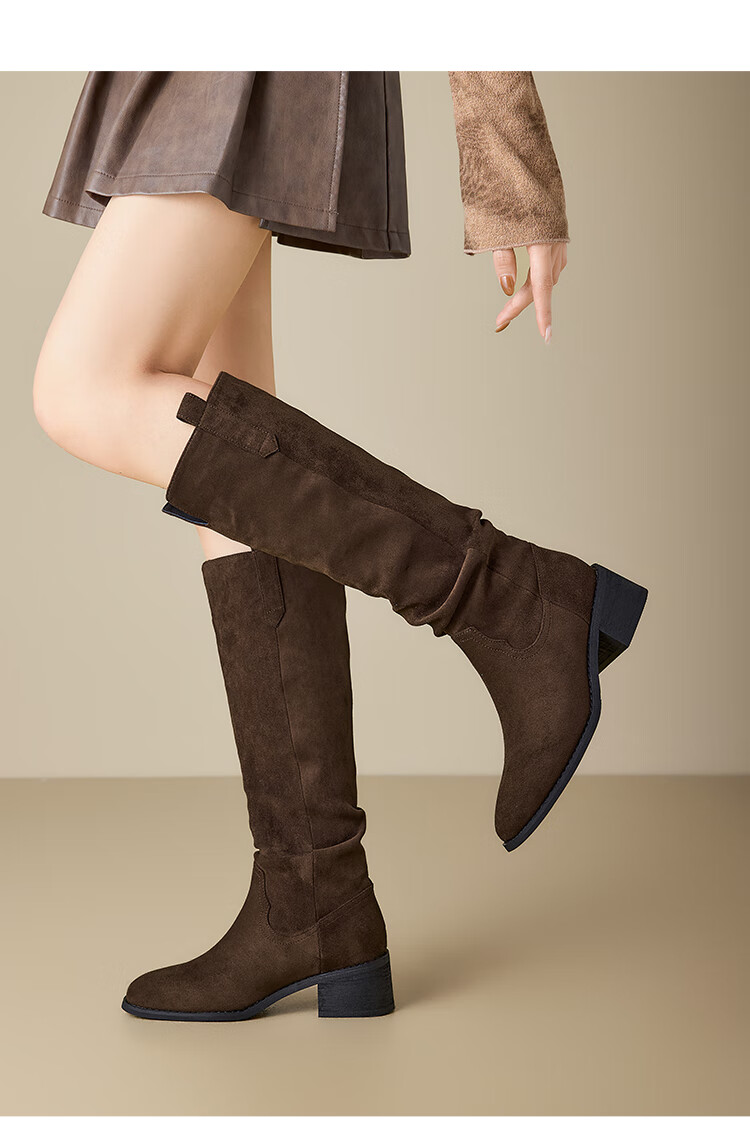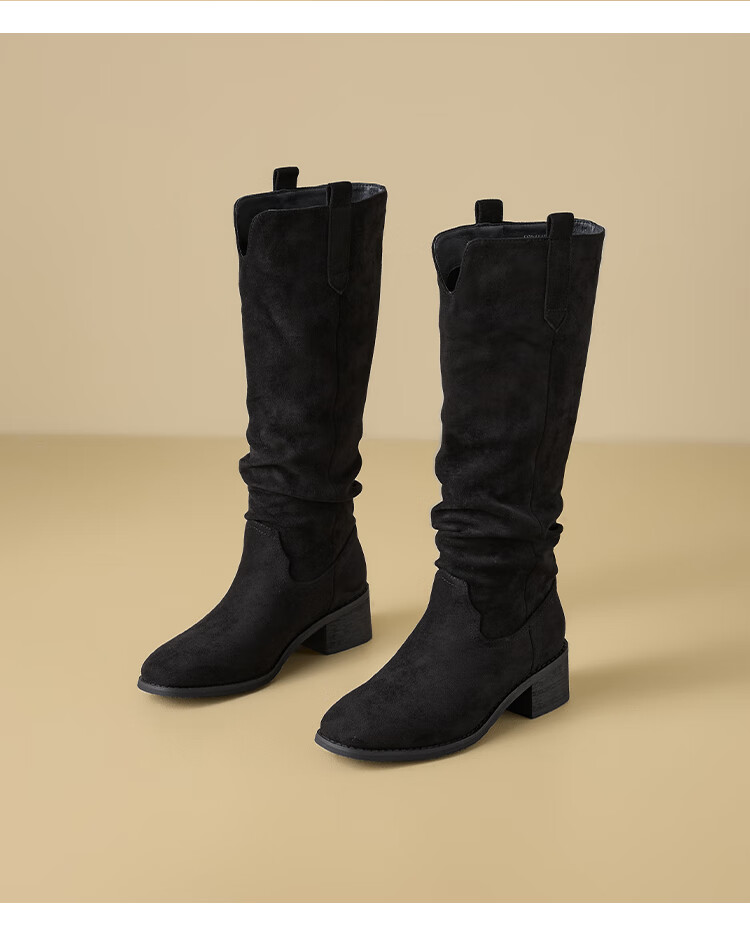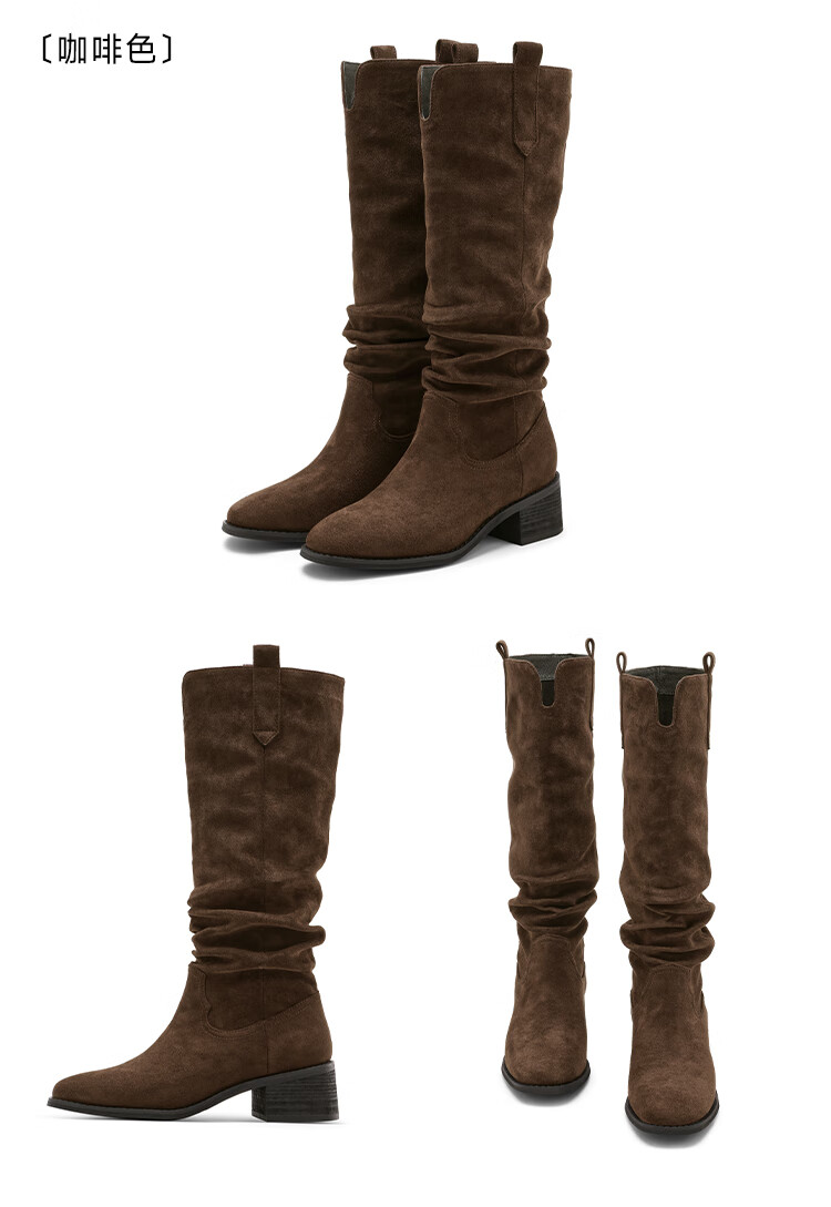 星期六粗跟美拉德长筒靴女2025新款秋季尖头显瘦堆堆靴西部骑士靴 黑色 37