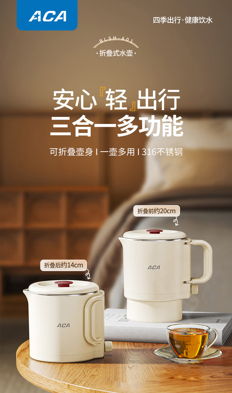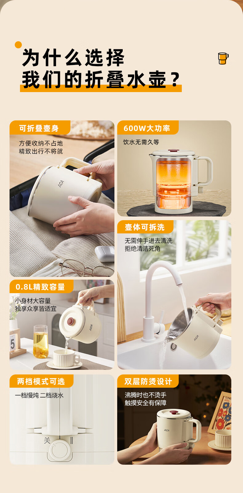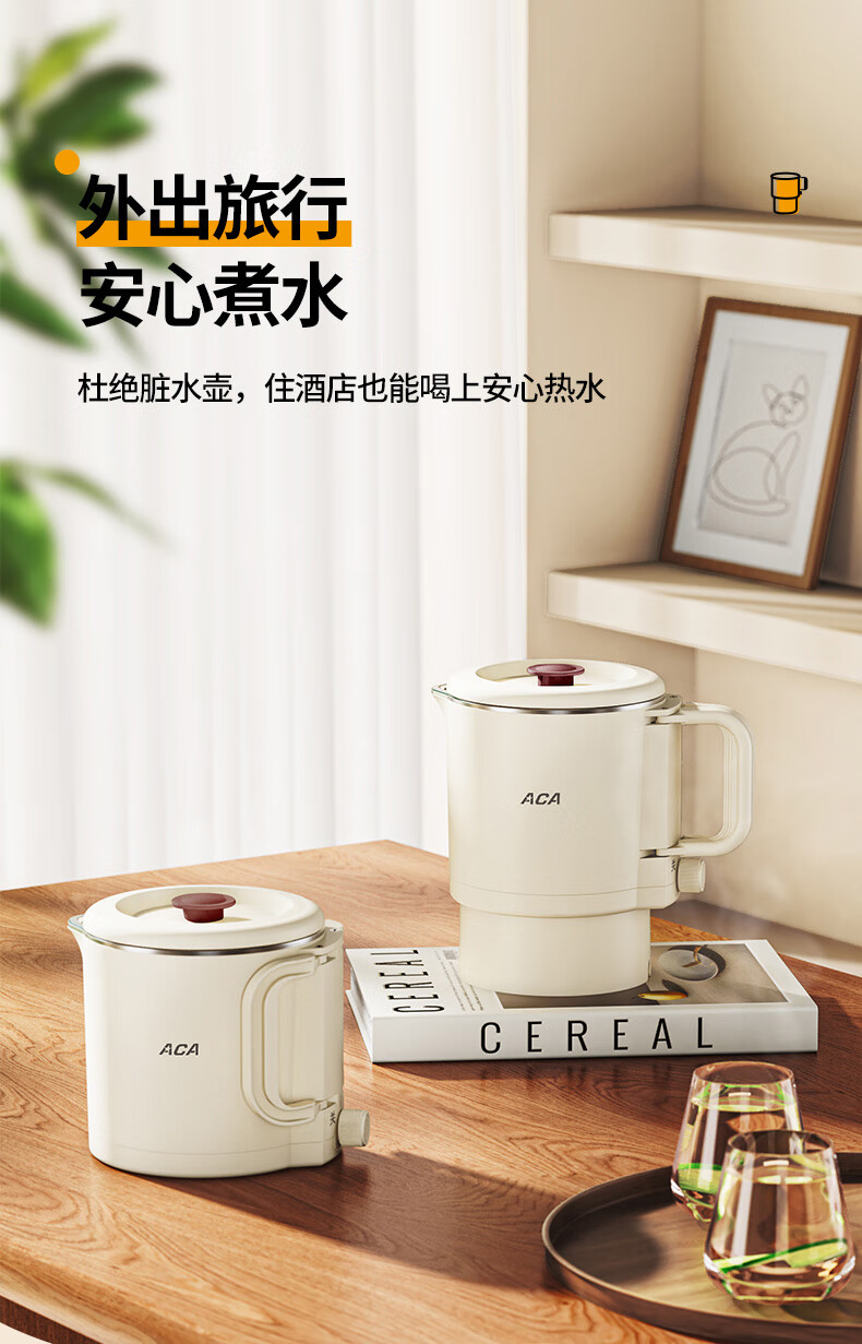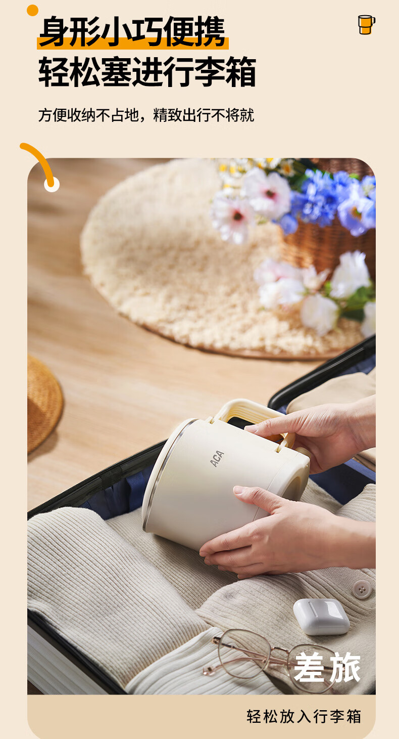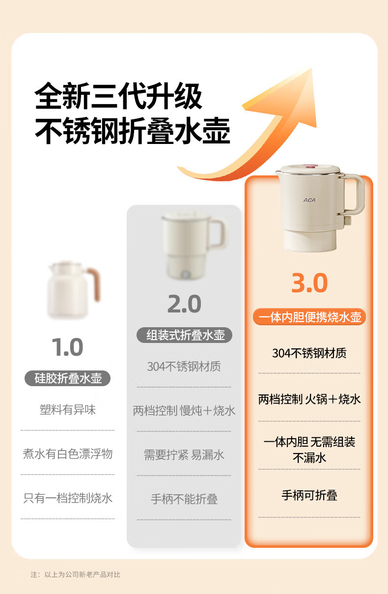 北美电器便携式烧水壶电水壶折叠旅行出差家用养生冲奶电热水壶学生316不锈钢泡面杯 304不锈钢 只可折叠把手