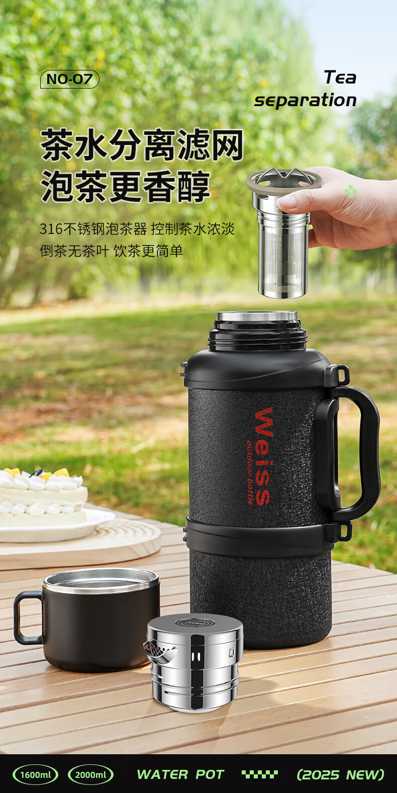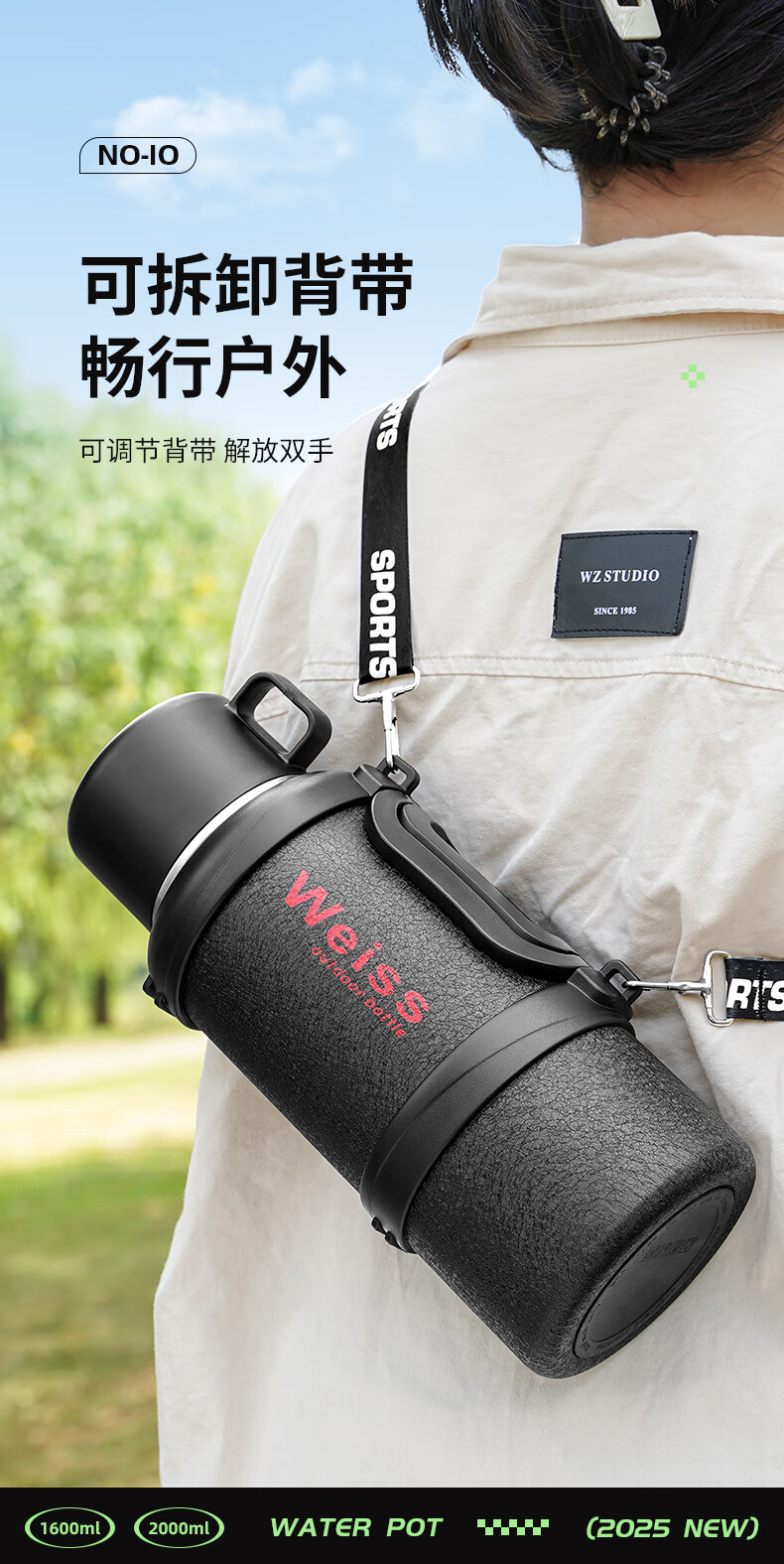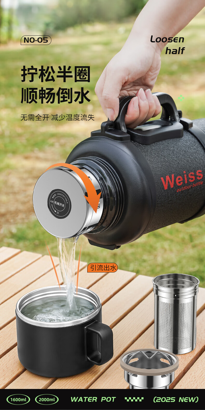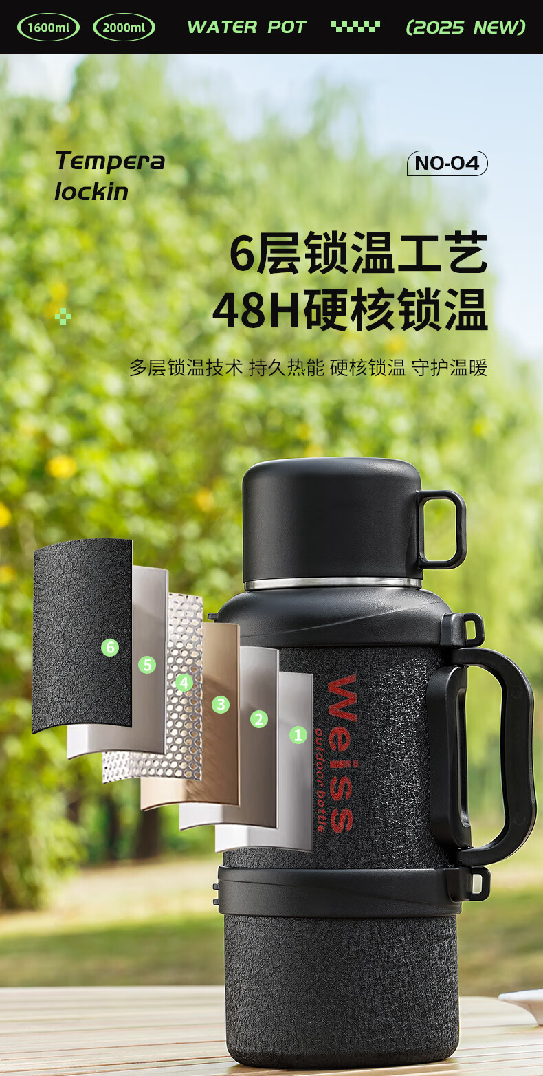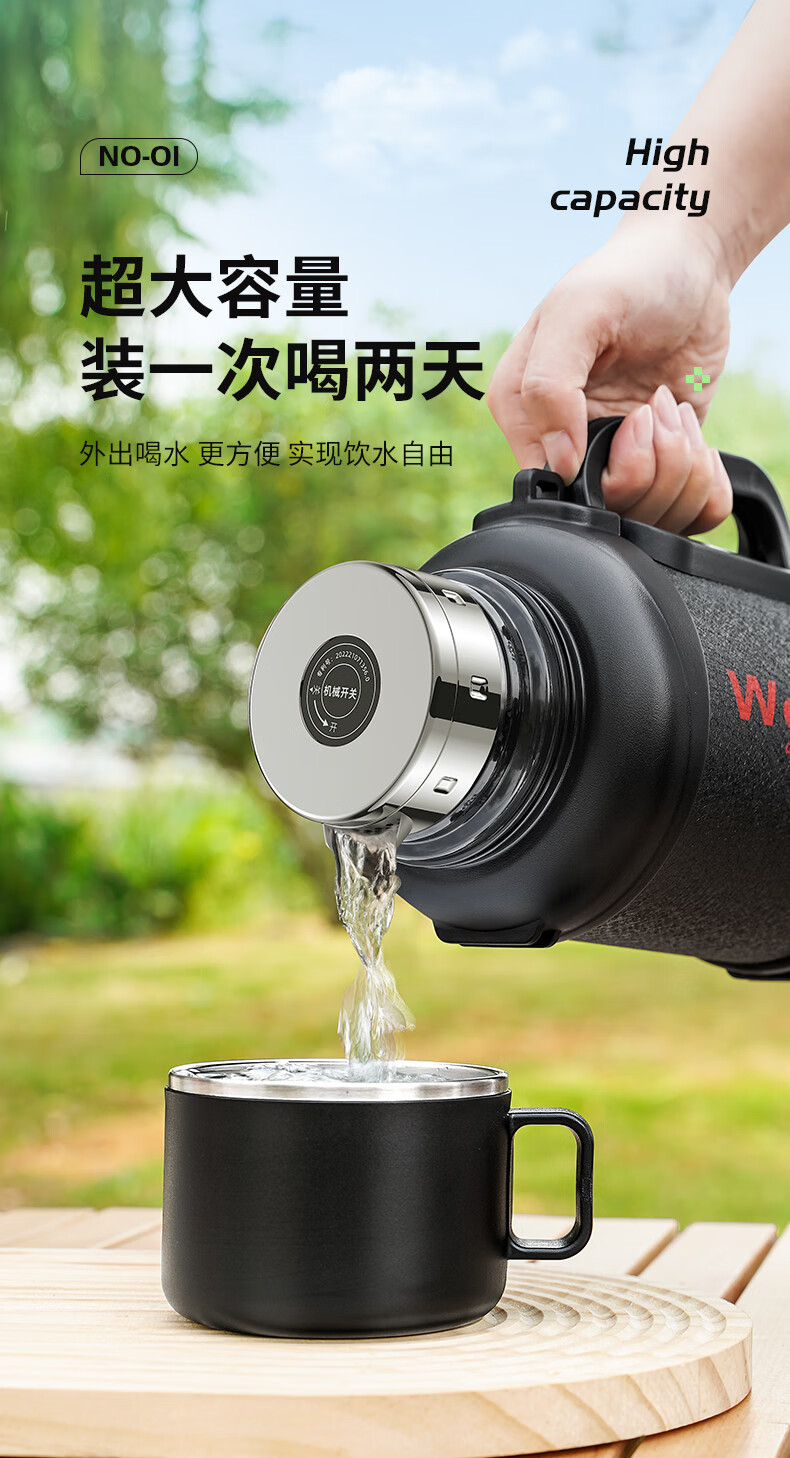 唯水大保温杯1500-2000ml保温壶大容量户外水壶316不锈钢清水保温壶 黑2L【316不锈钢】4斤水