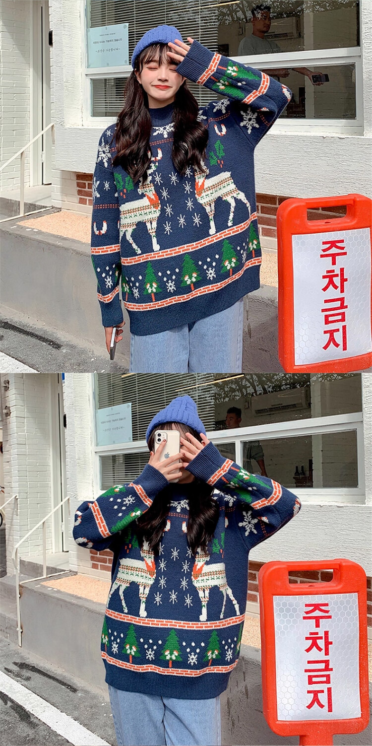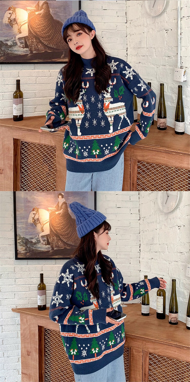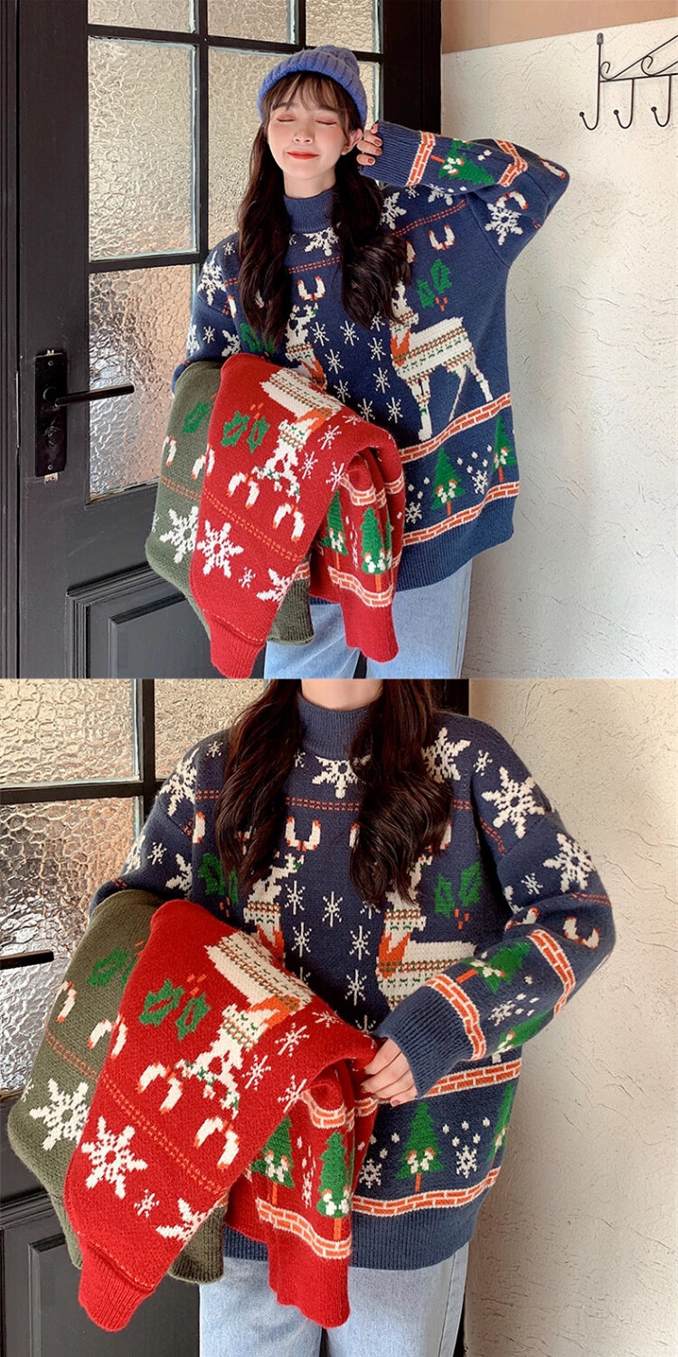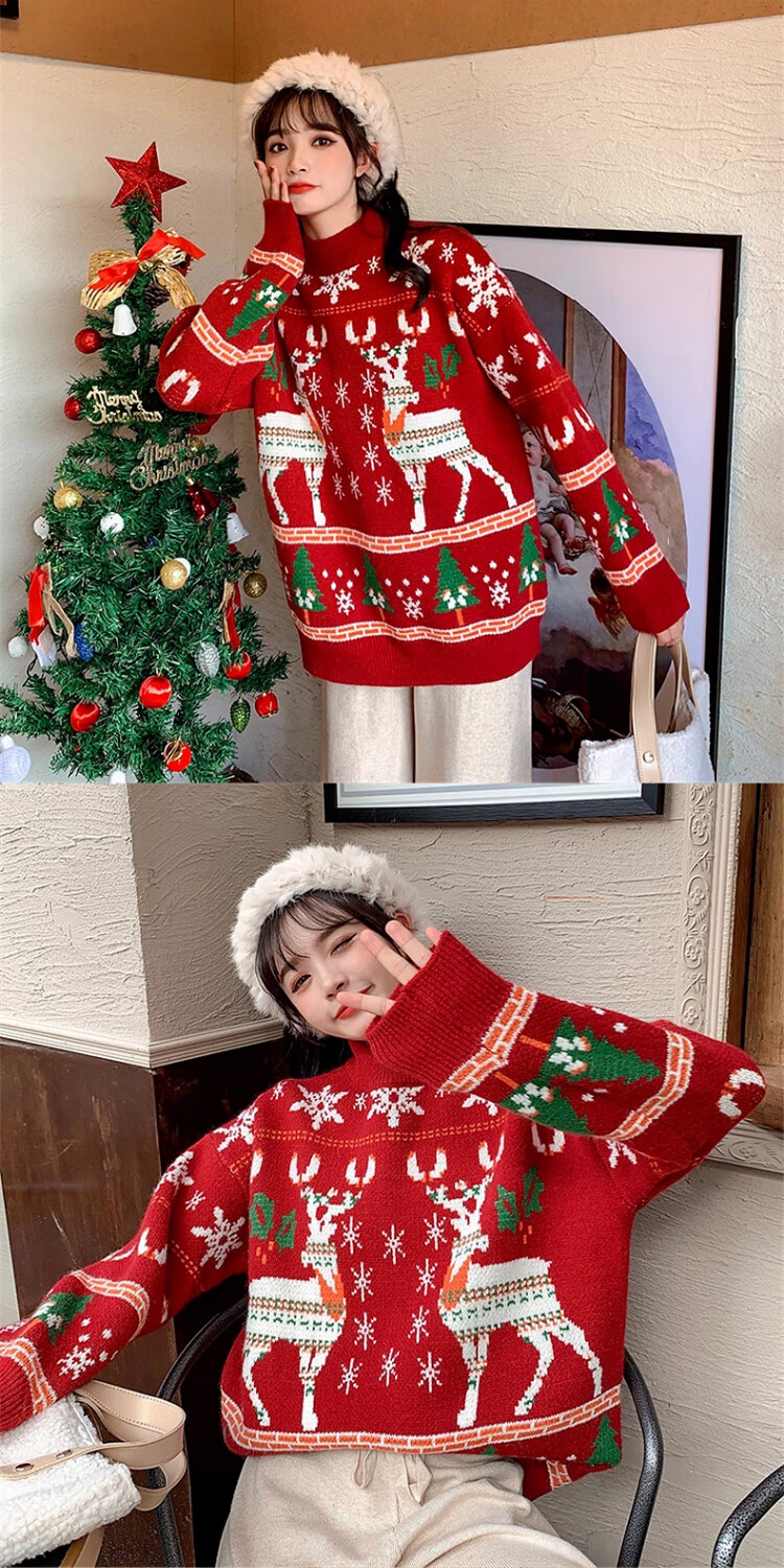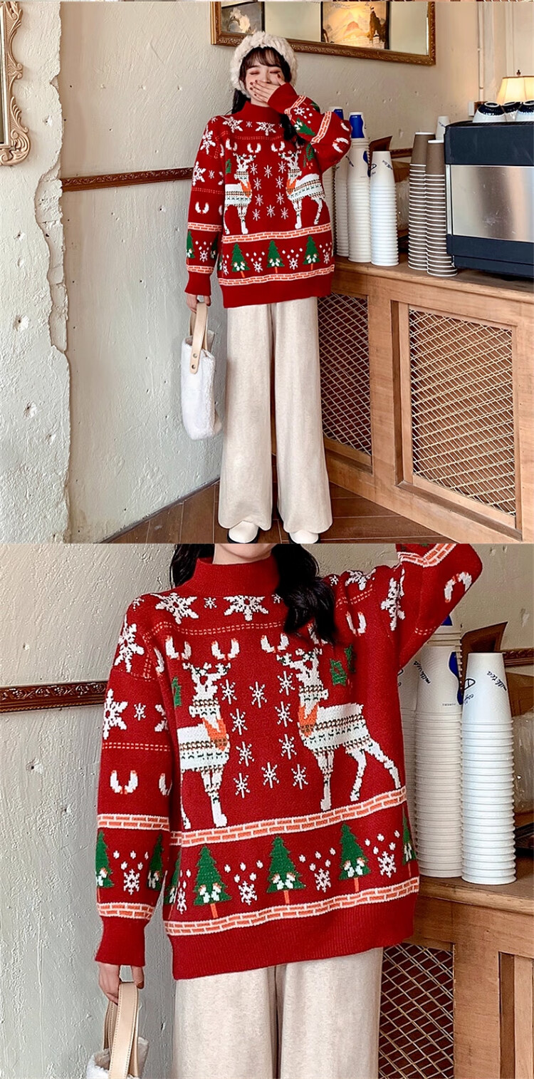 相伊恋人毛衣针织衫女25新款秋冬红色圣诞复古外套圆领保暖宽松小个子上衣 圣诞红色毛衣 均码 【建议80~140斤】