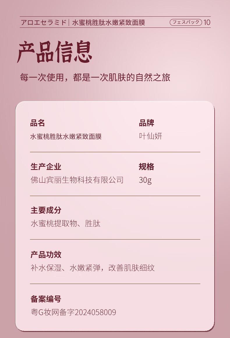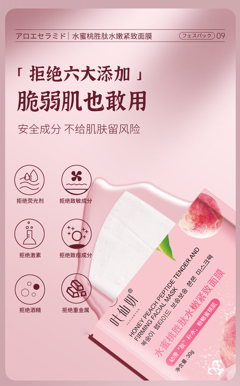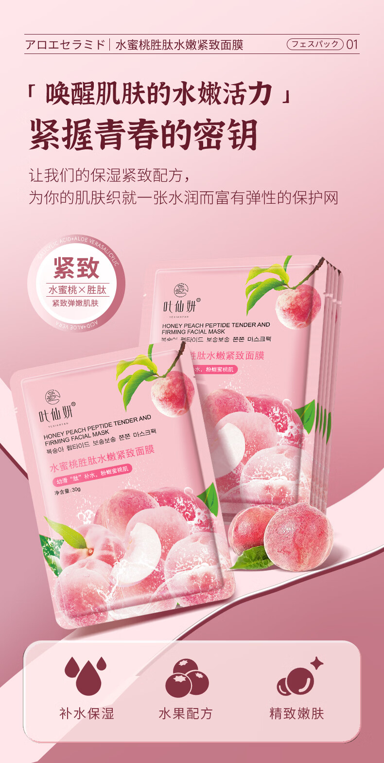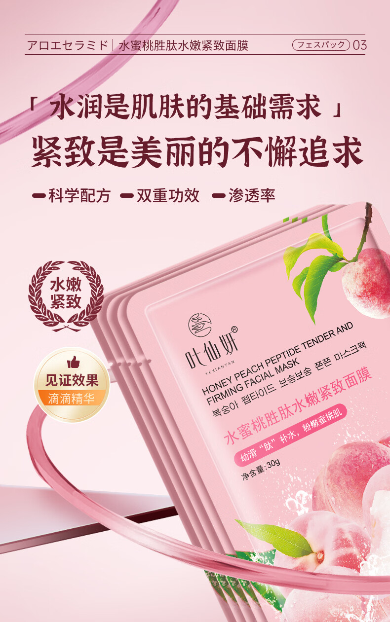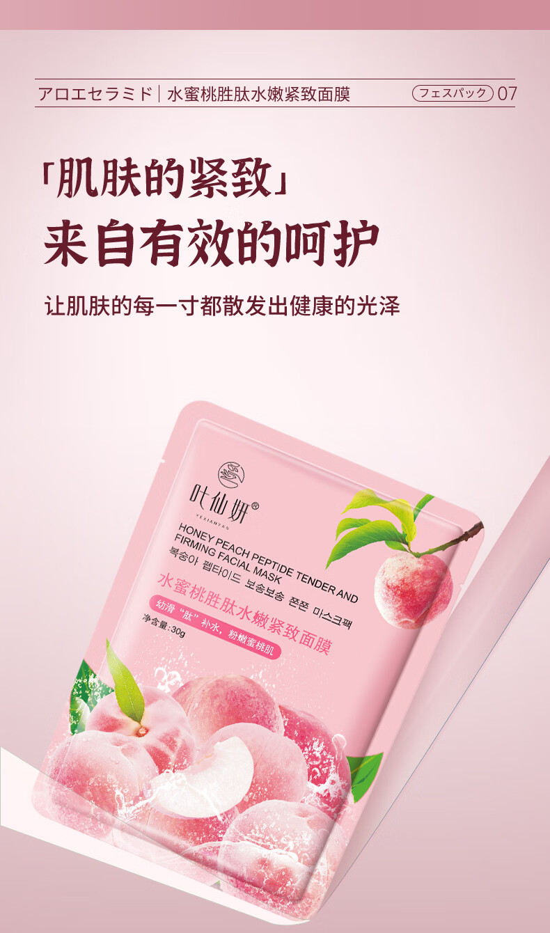 叶仙妍面膜水蜜桃胜肽水嫩紧致30g片装保湿抗皱紧致肌肤面膜 30g*5片
