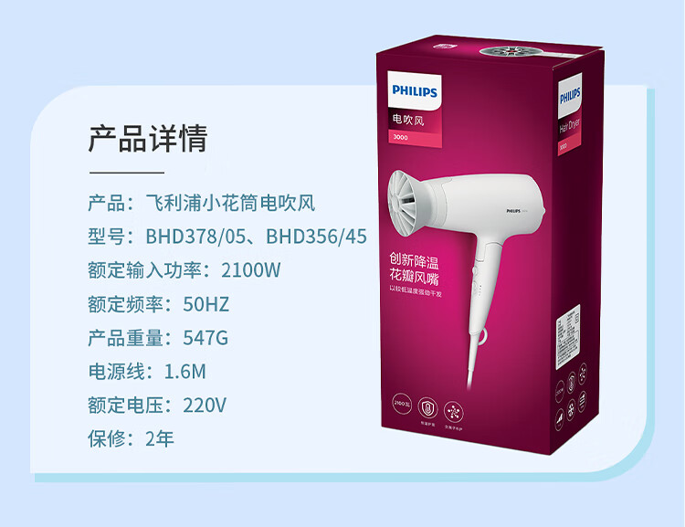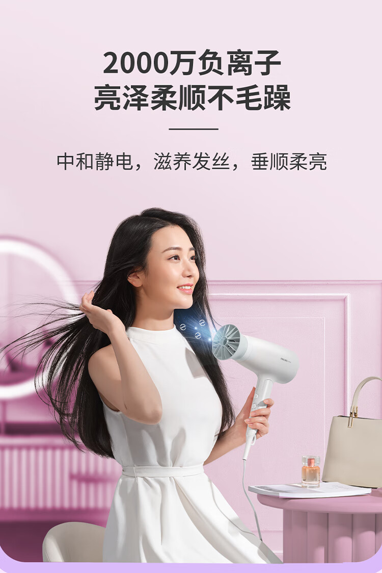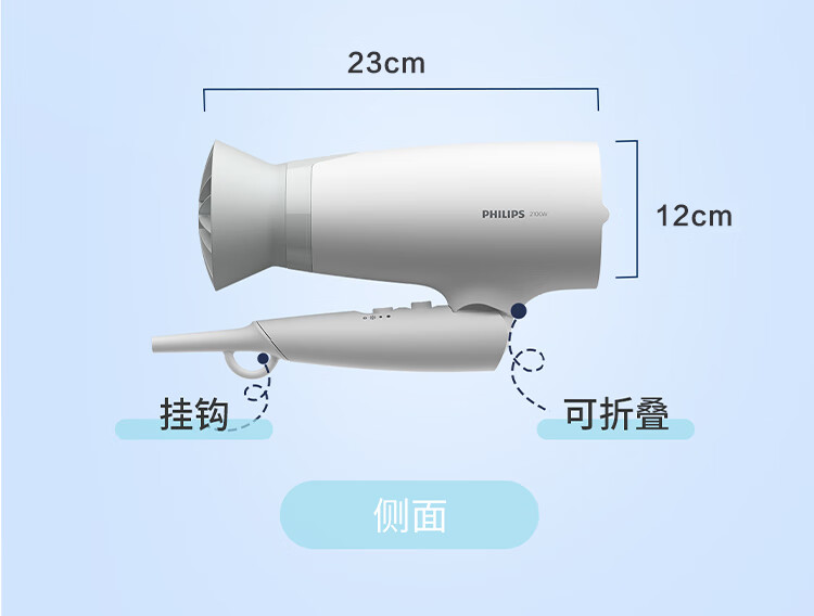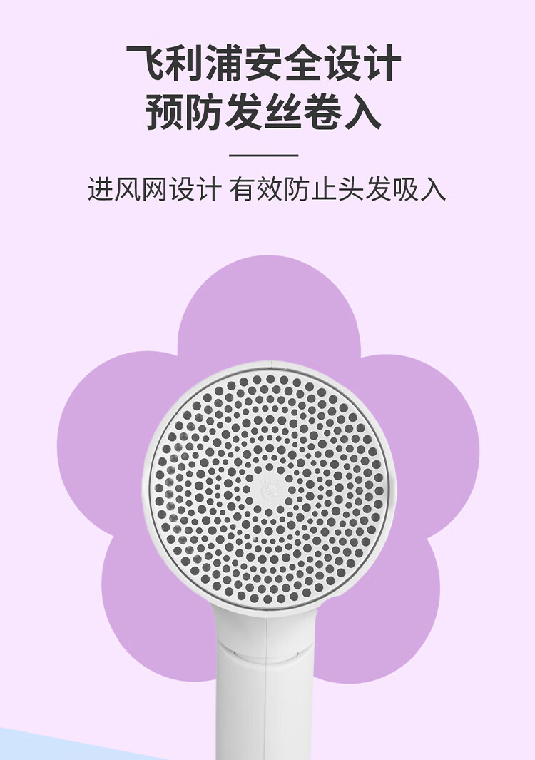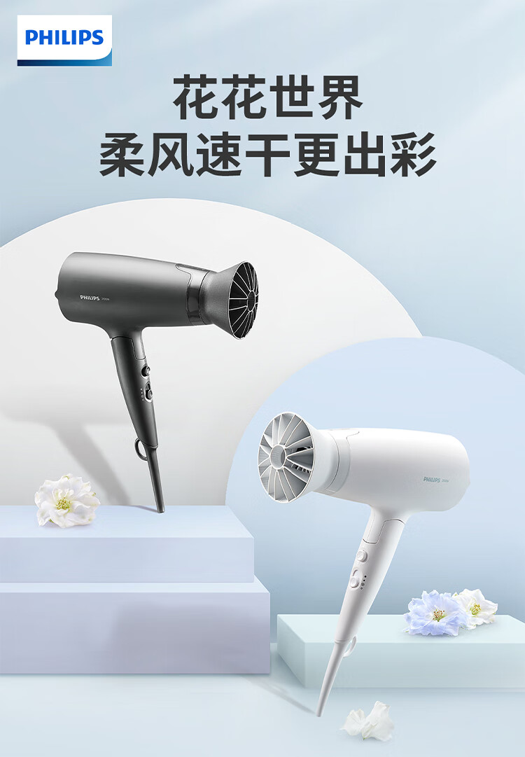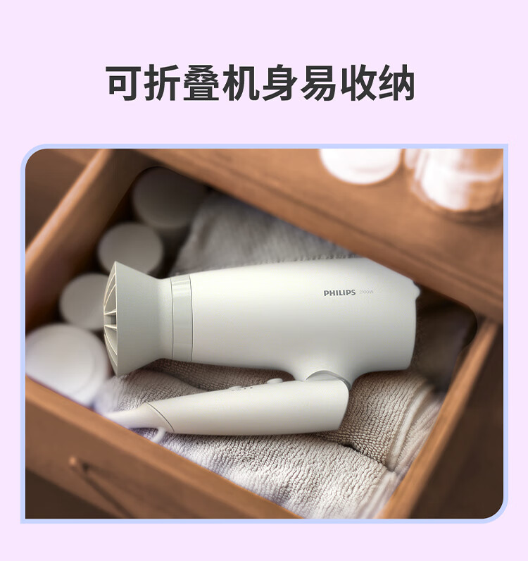 飞利浦(PHILIPS)电吹风机 3系小花筒 57°C低温速干 负离子护发小花筒白色可折叠家用 学生宿舍专用 圣诞生日礼物