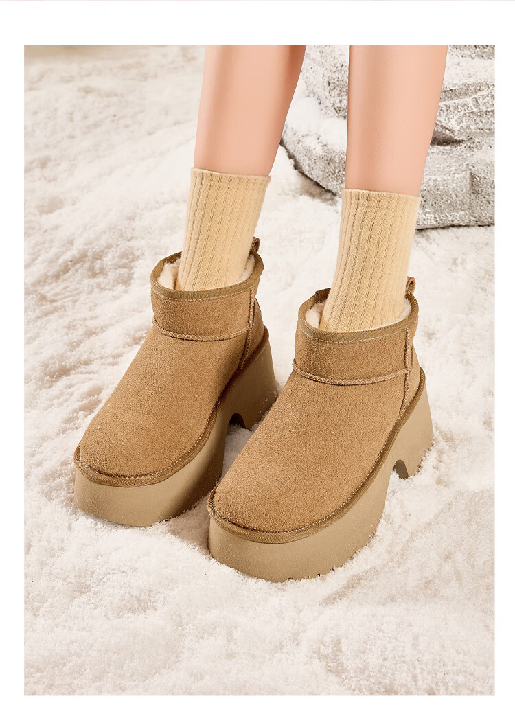 意尔康女靴雪地靴女士加绒加厚保暖棉鞋舒适百搭东北抗寒中筒靴子 土黄色 加绒 38