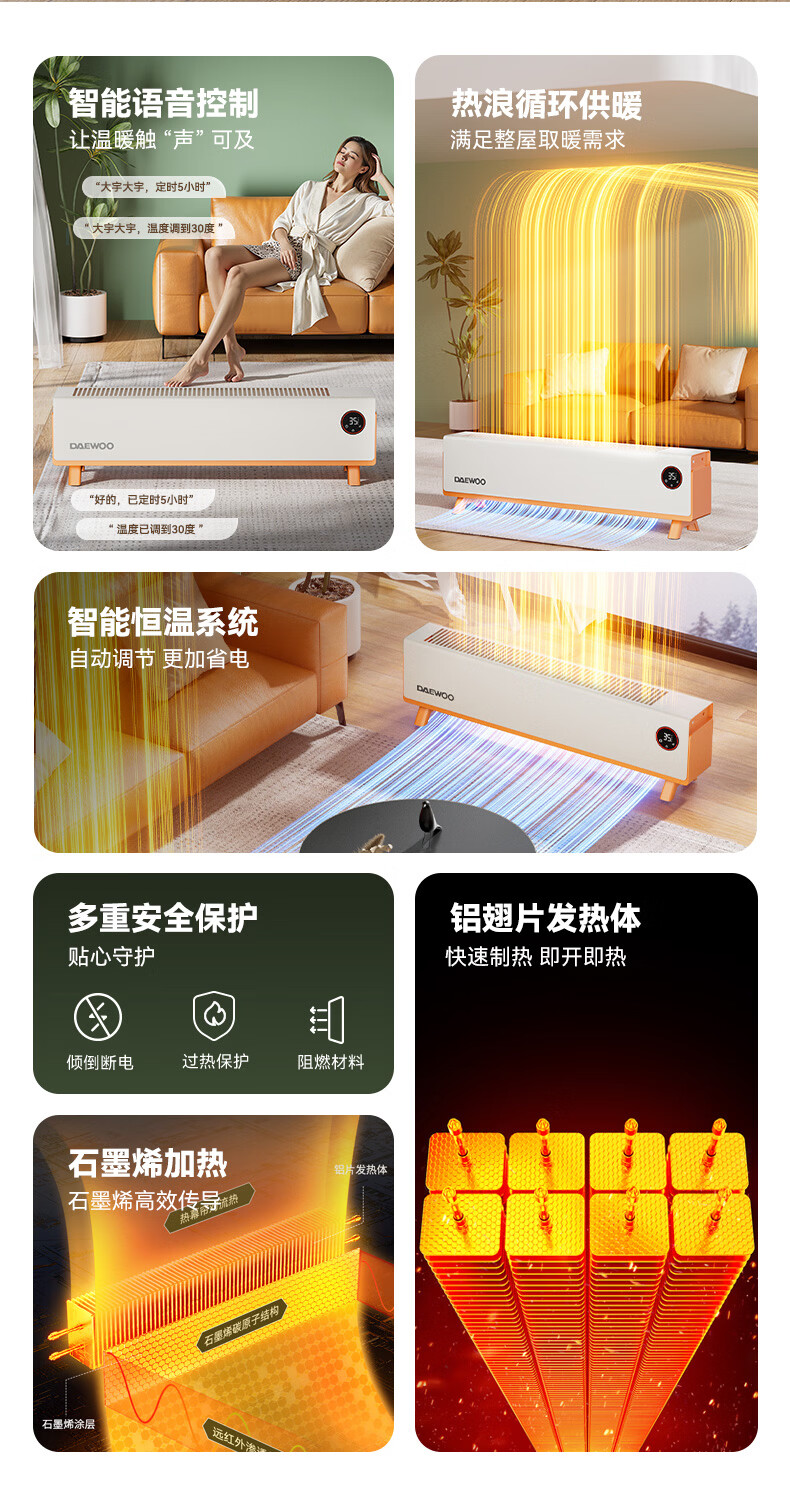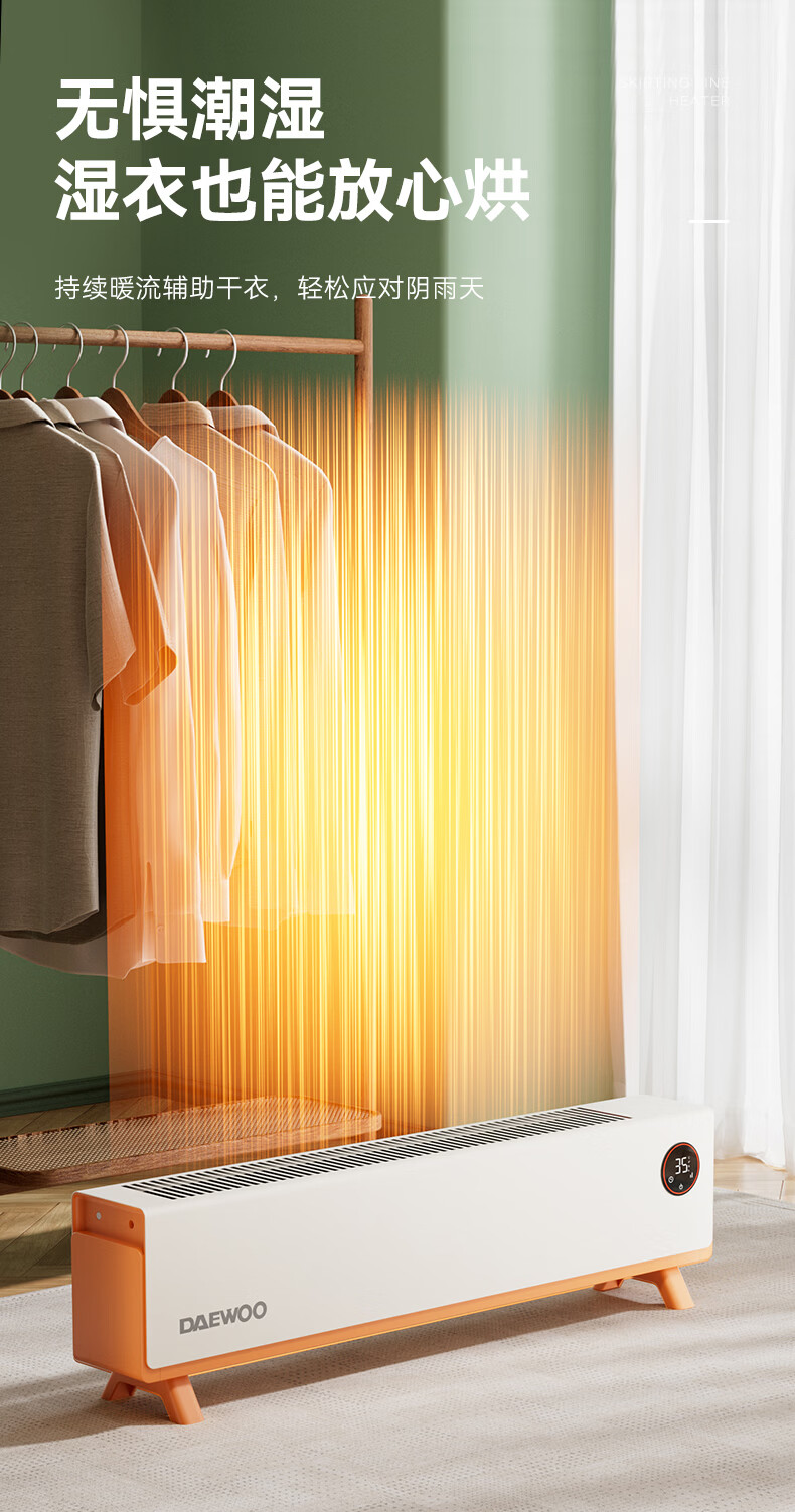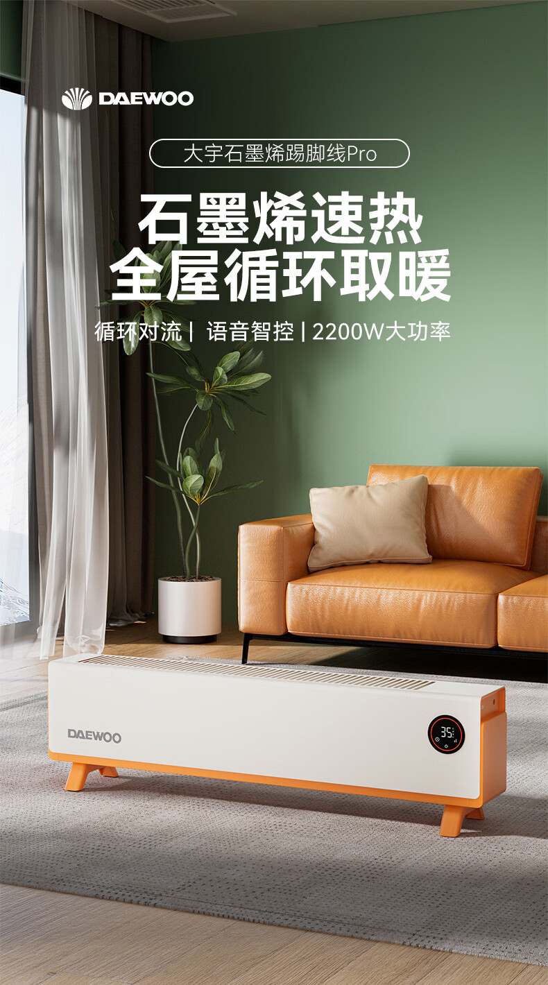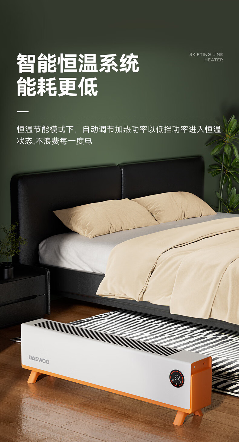 DAEWOO大宇踢脚线取暖器电热家用电暖气大面积速热暖风取暖炉石墨烯升温地暖智能恒温浴室卧室防水50平 【年度新品】石墨烯智能温控,轻音节能