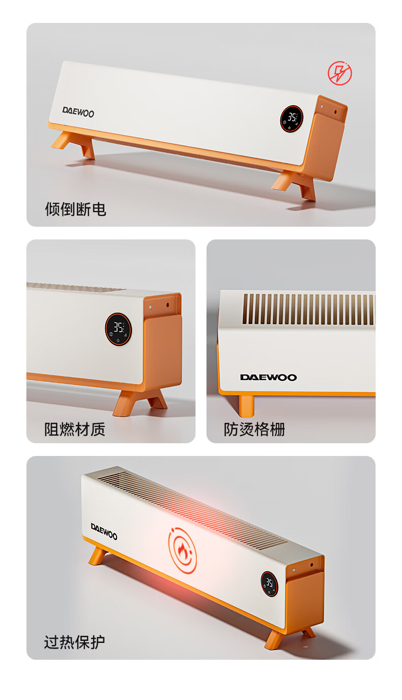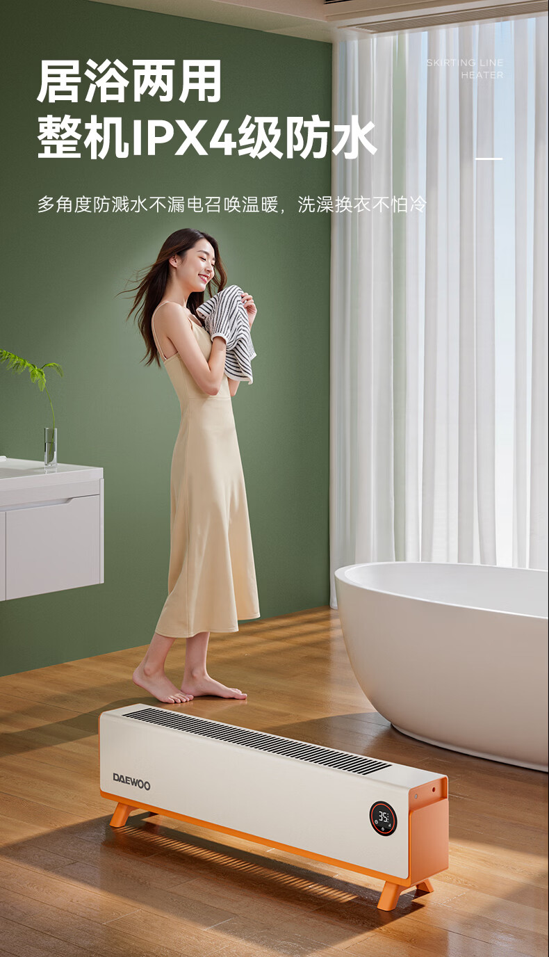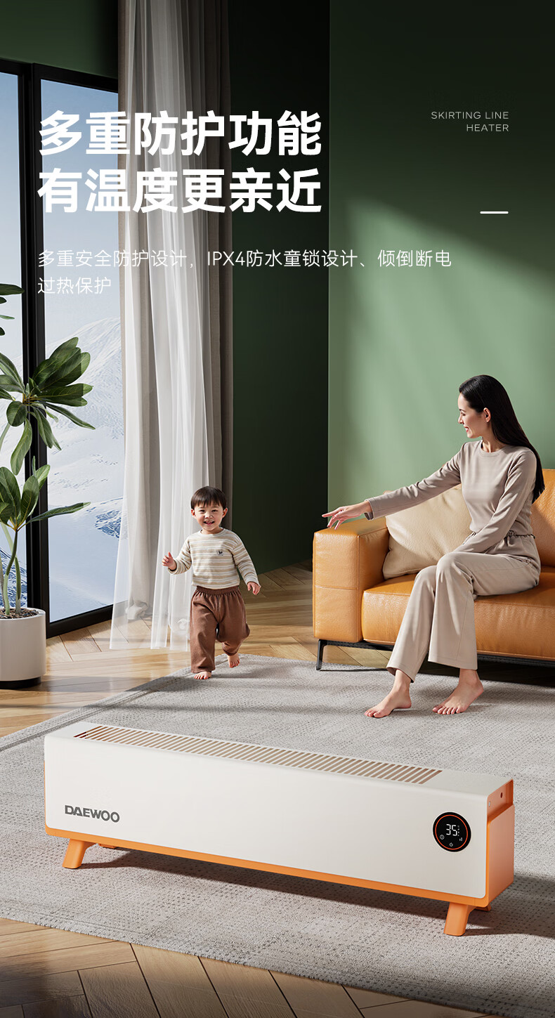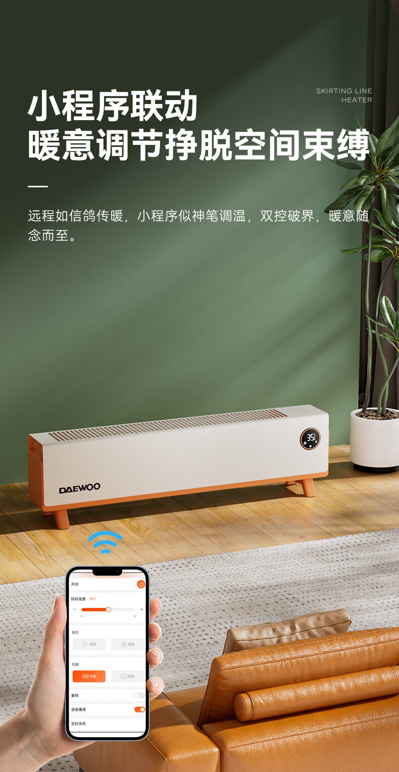 DAEWOO大宇踢脚线取暖器电热家用电暖气大面积速热暖风取暖炉石墨烯升温地暖智能恒温浴室卧室防水50平 【年度新品】石墨烯智能温控,轻音节能