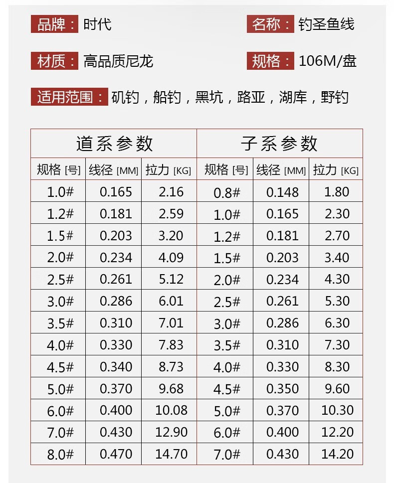 SIMAGO时代钓具106米钓鱼线主线子线尼龙线超柔软强拉力竞技鱼线台钓线 106米子线 1.0